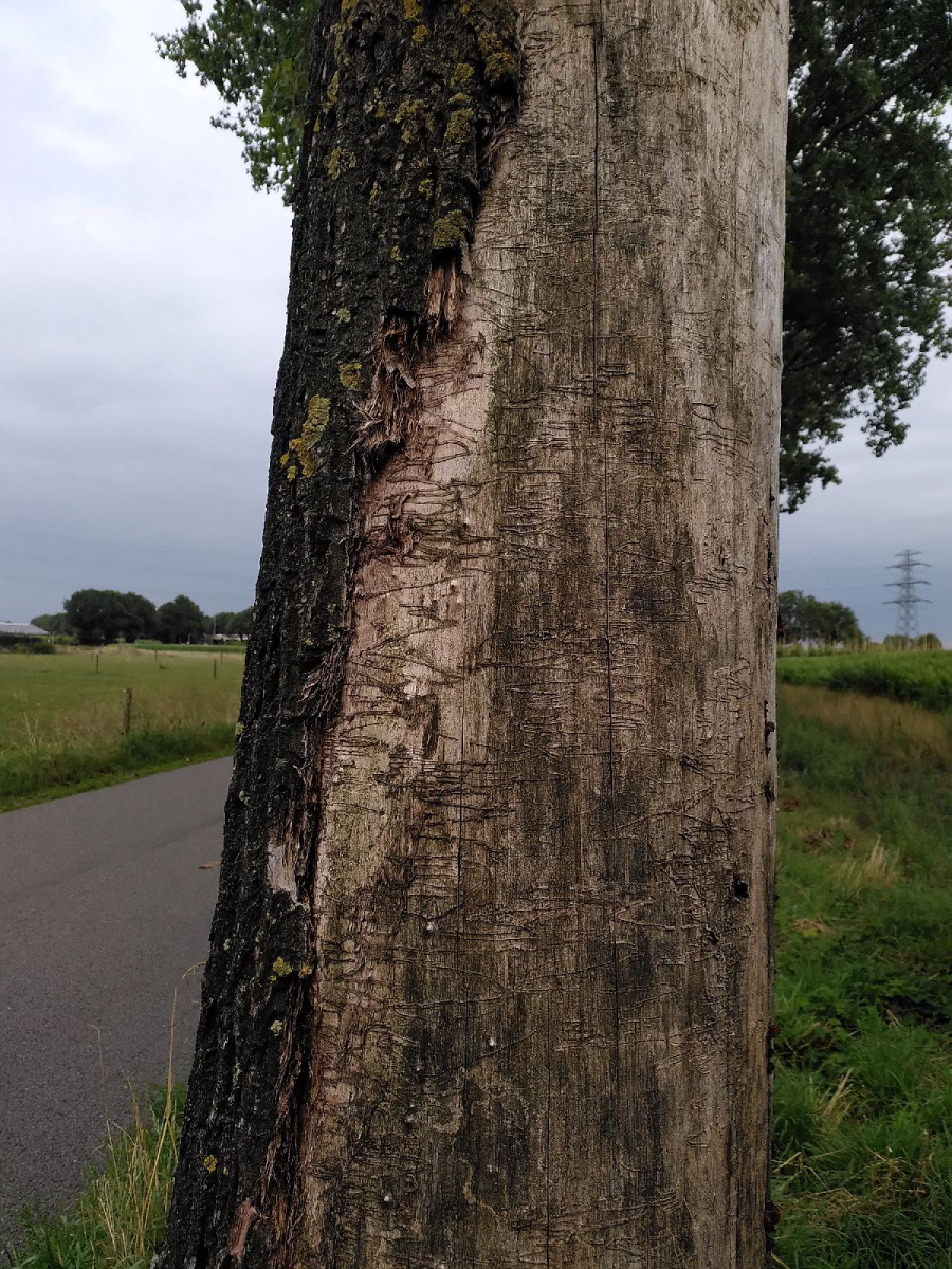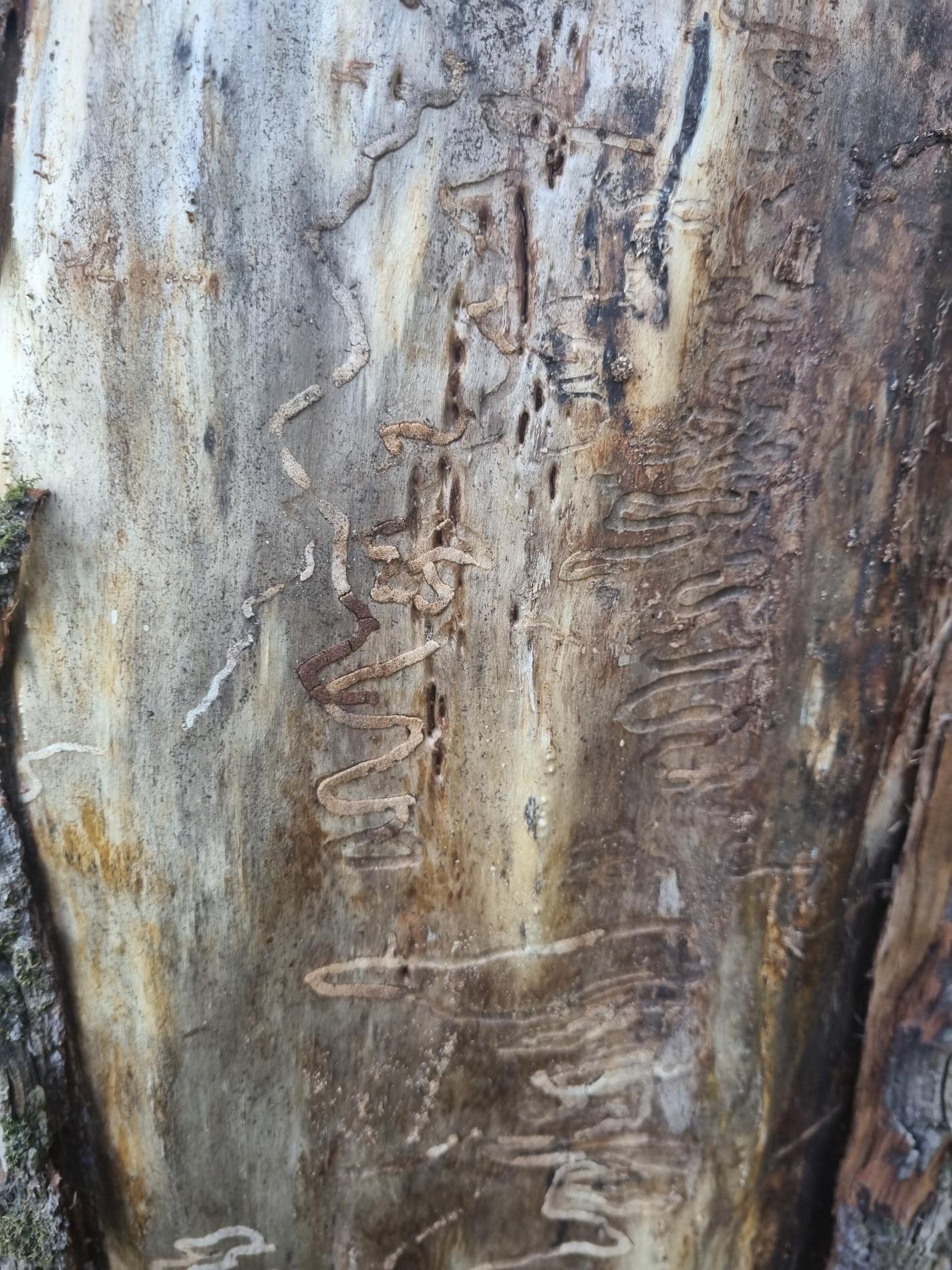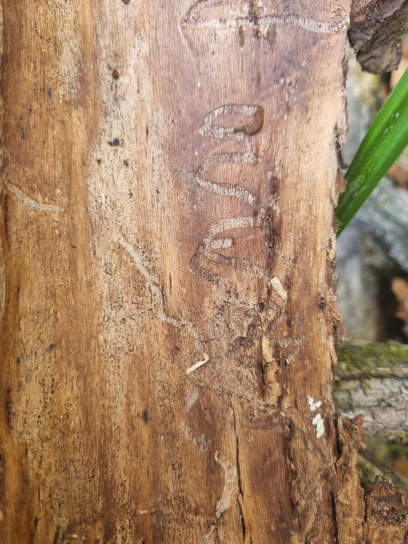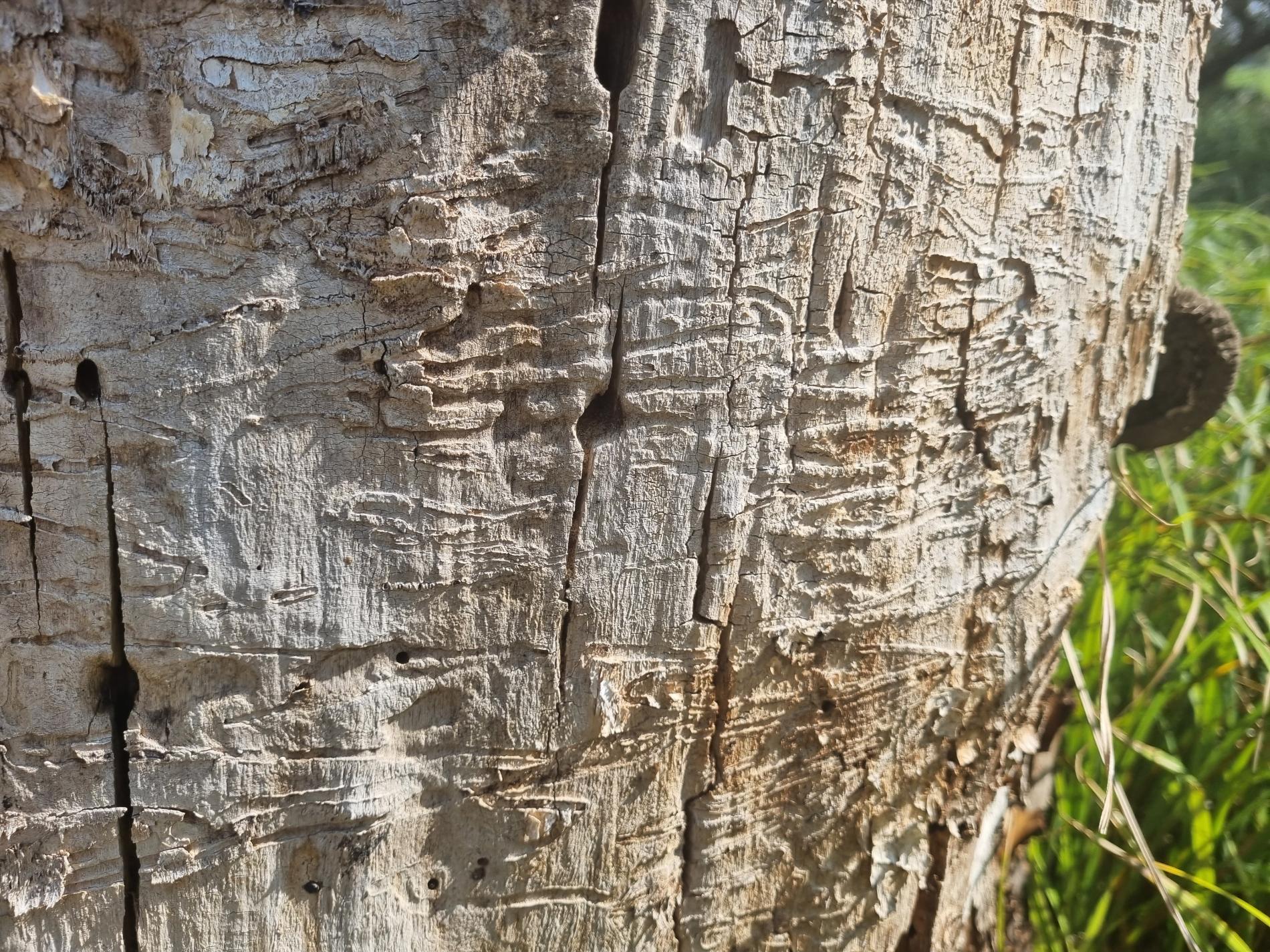 Medzi viditeľné známky napadnutia patria výletové otvory a veľké hadovité galériepožerky pod kôrou.