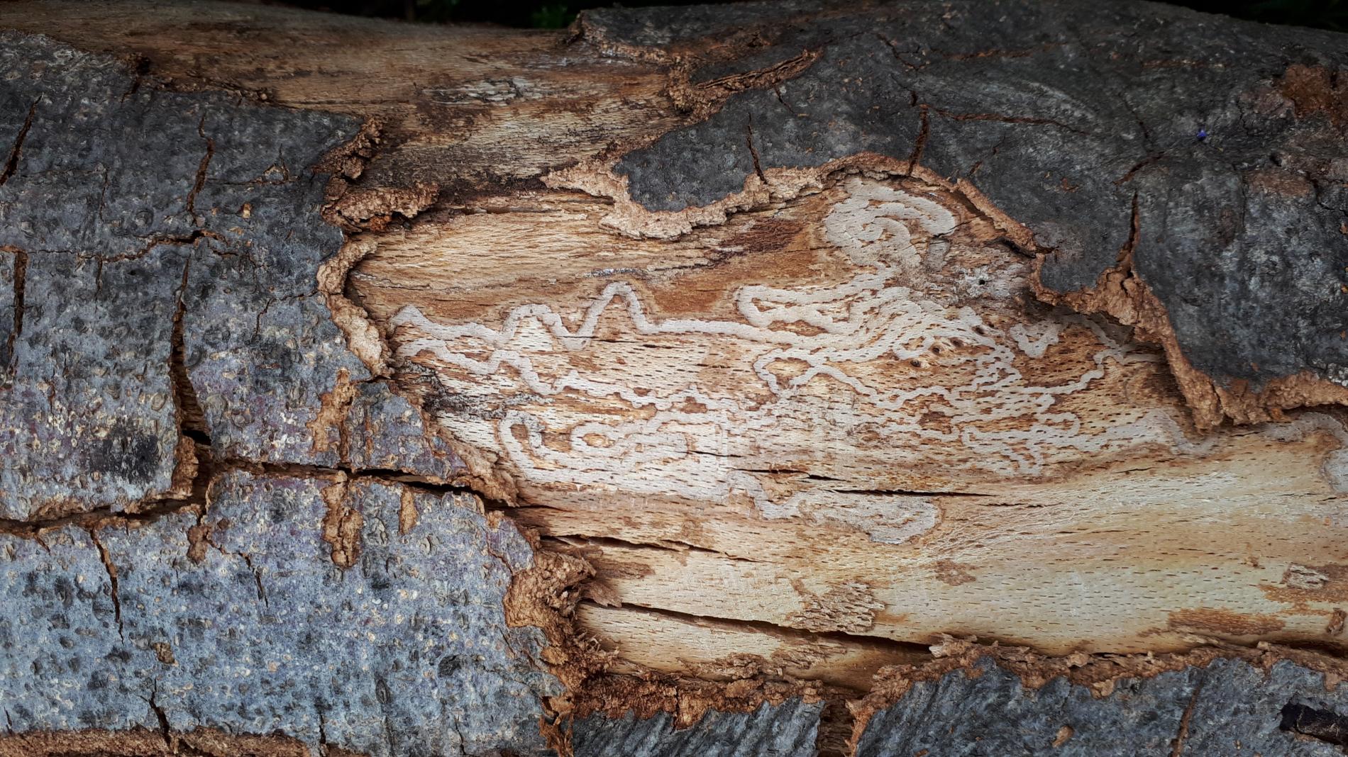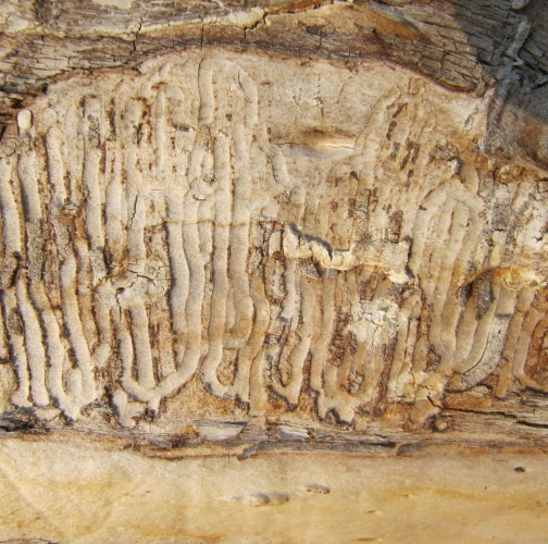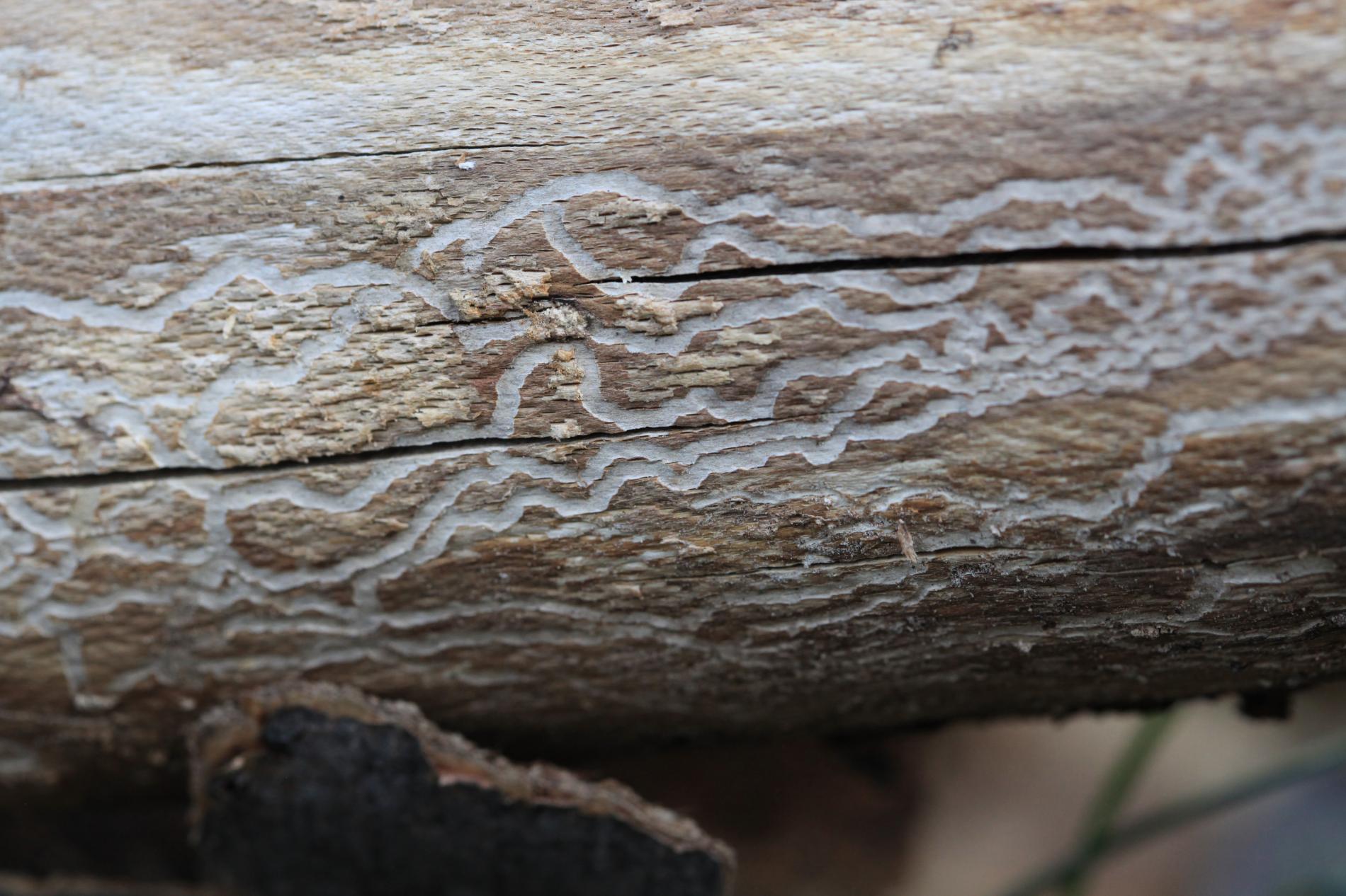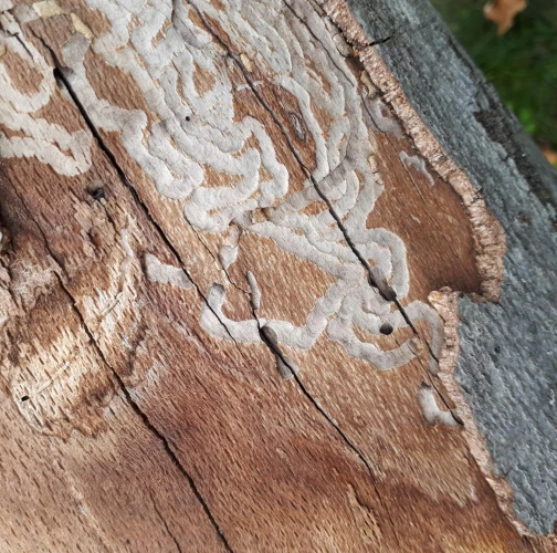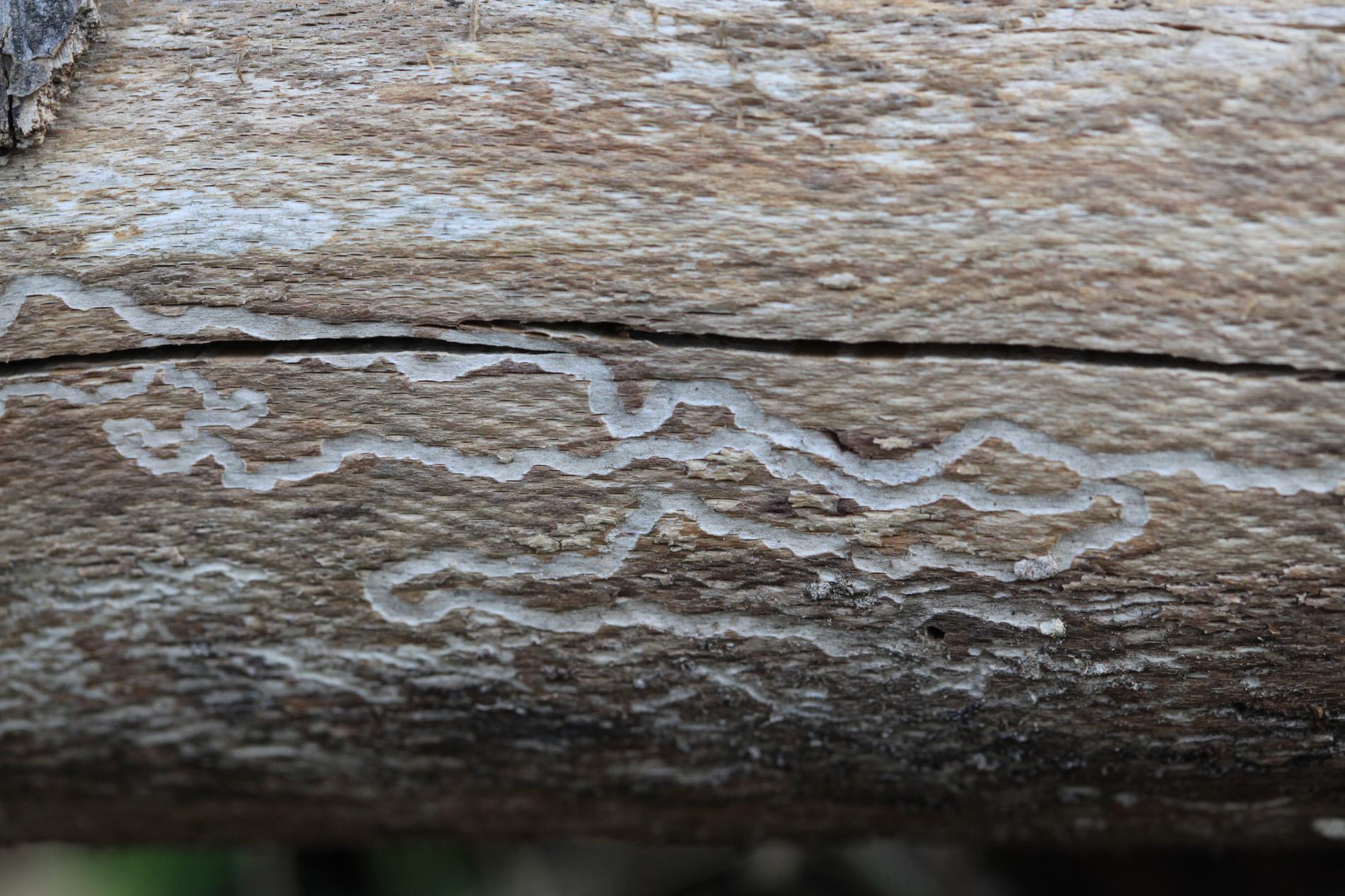 Hadovitý požerok pod kôrou vyplnený drvinou.