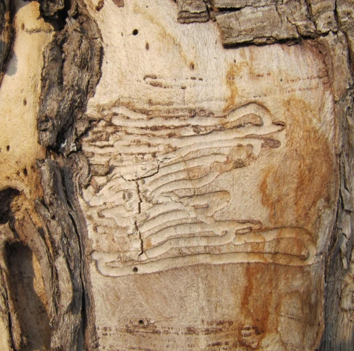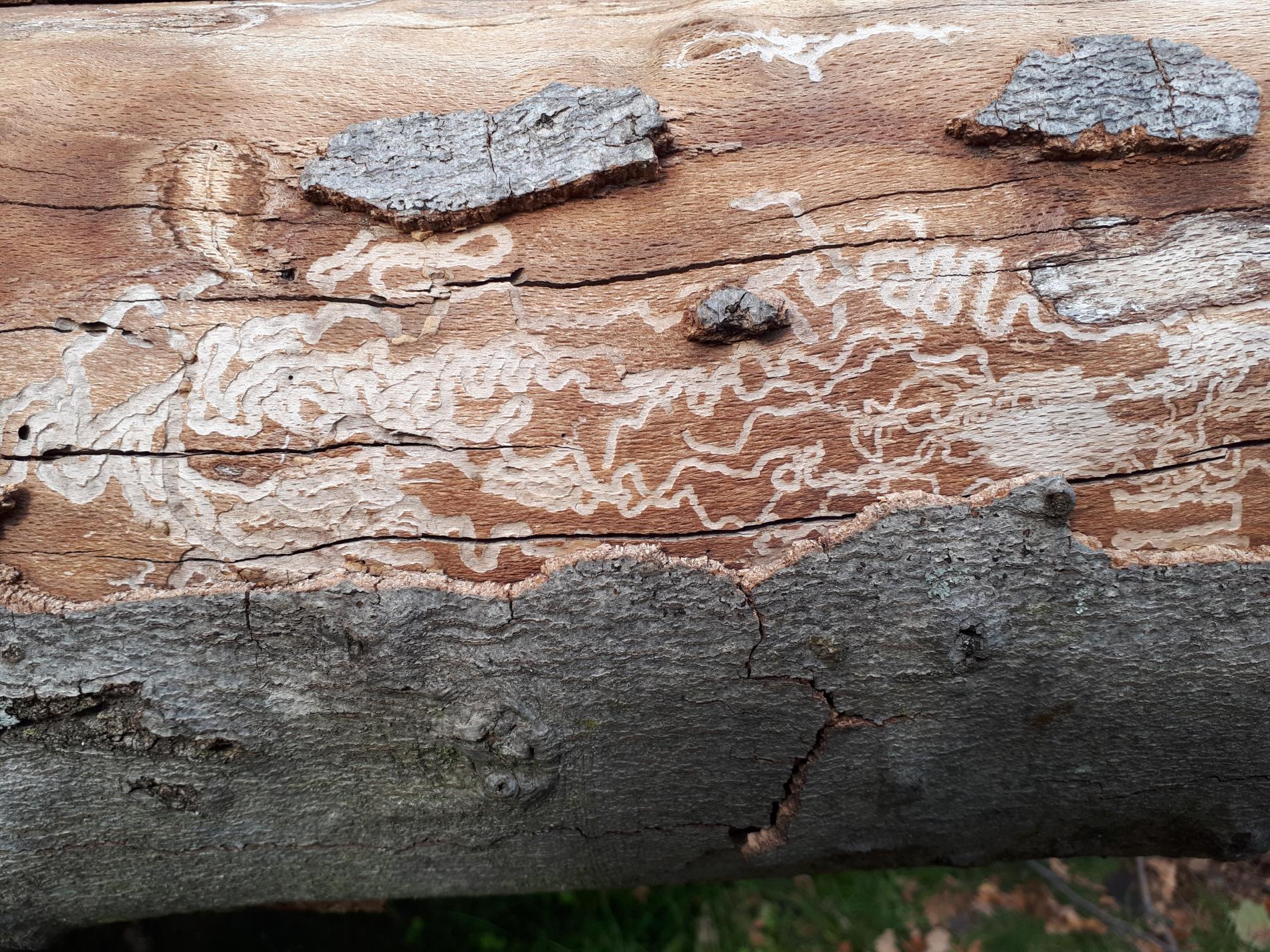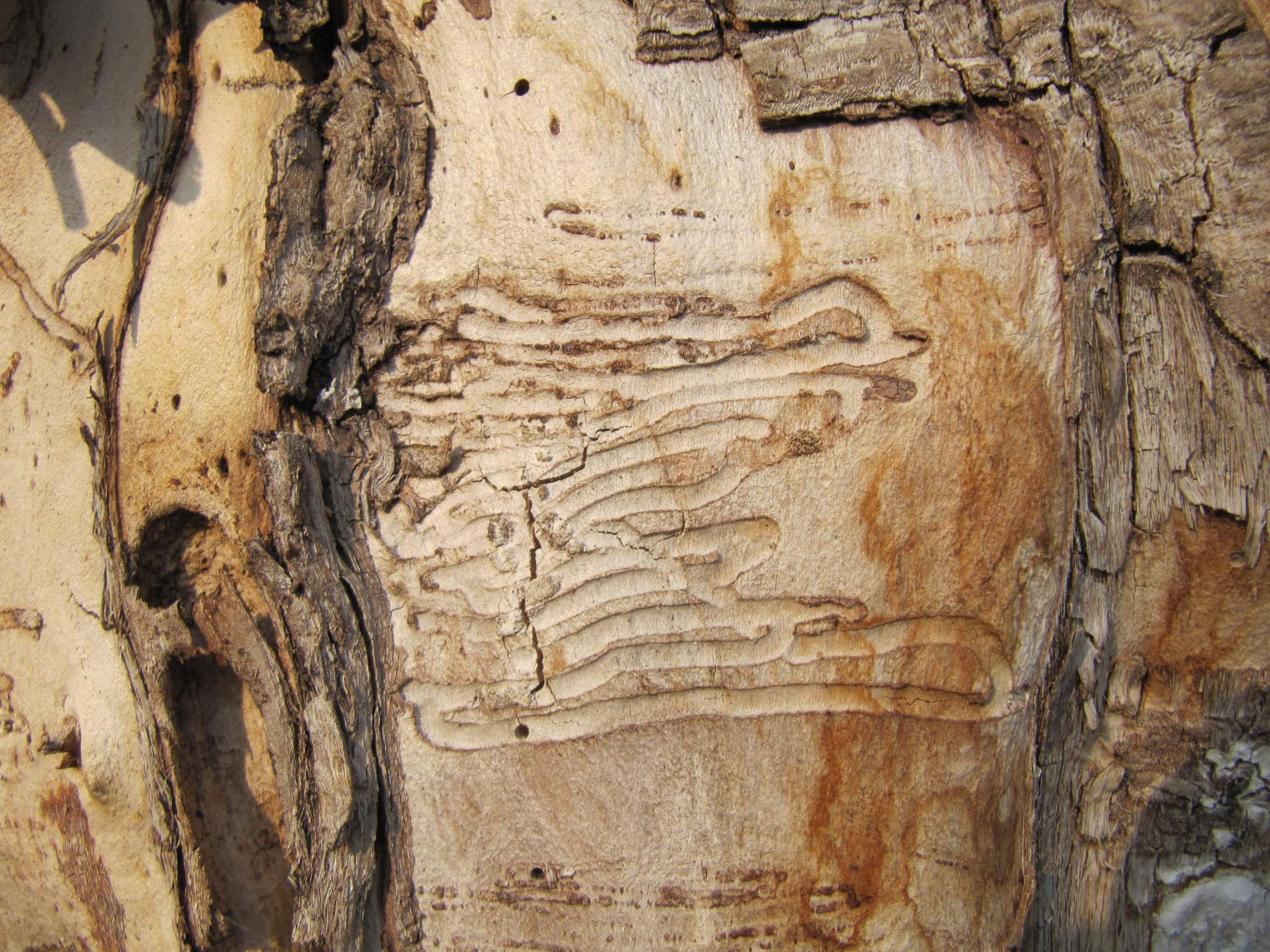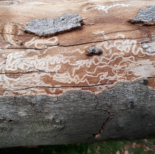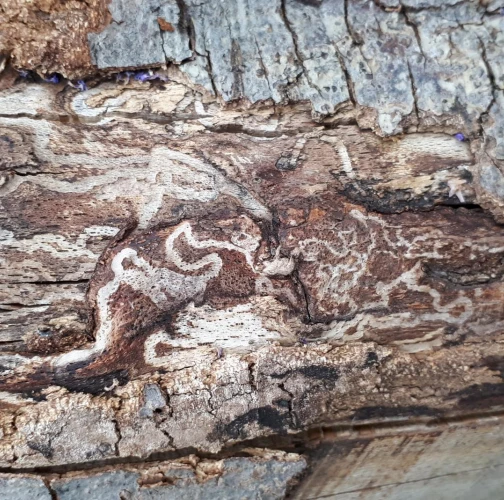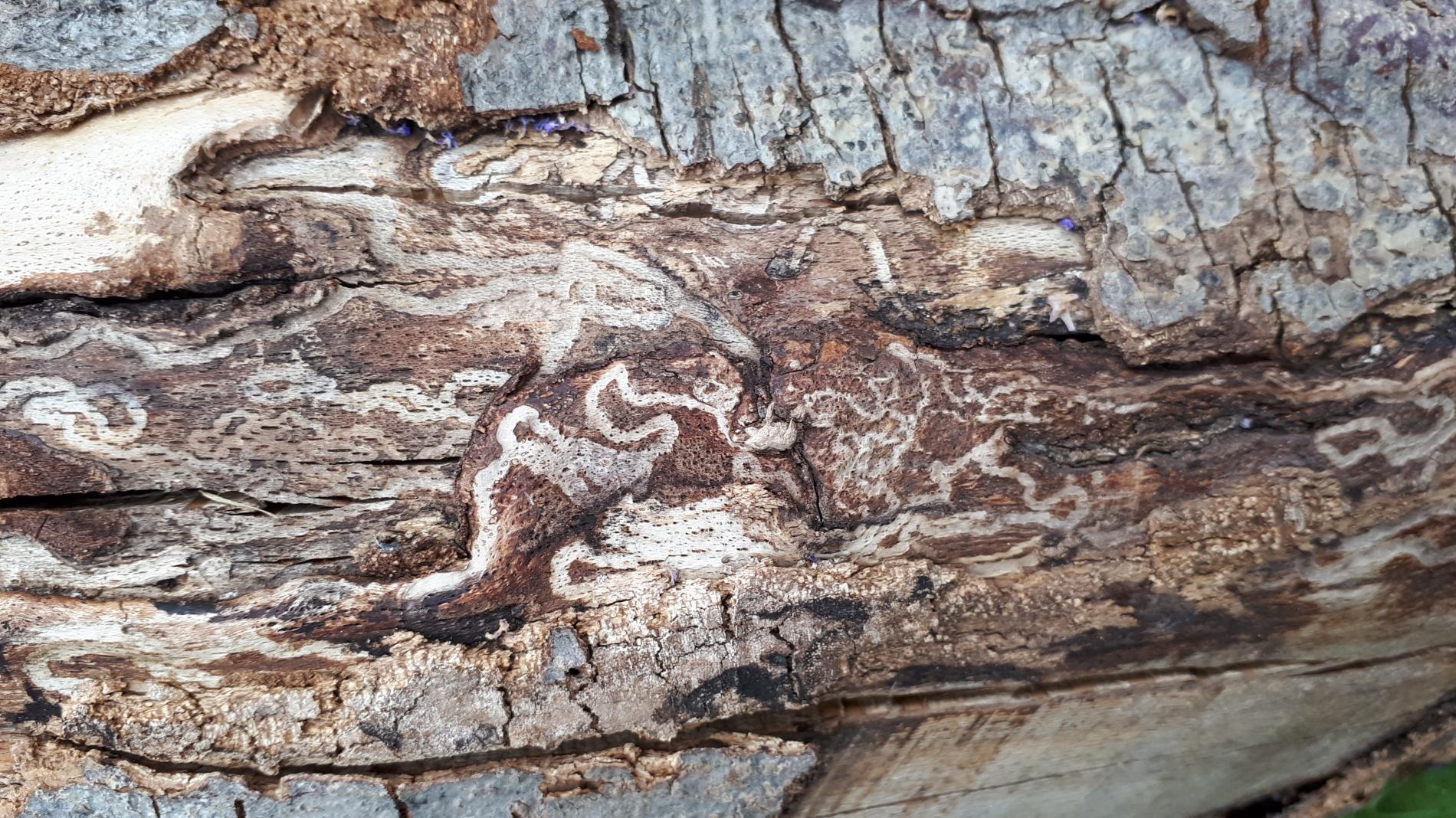 Hadovitý požerok pod kôrou vyplnený drvinou.