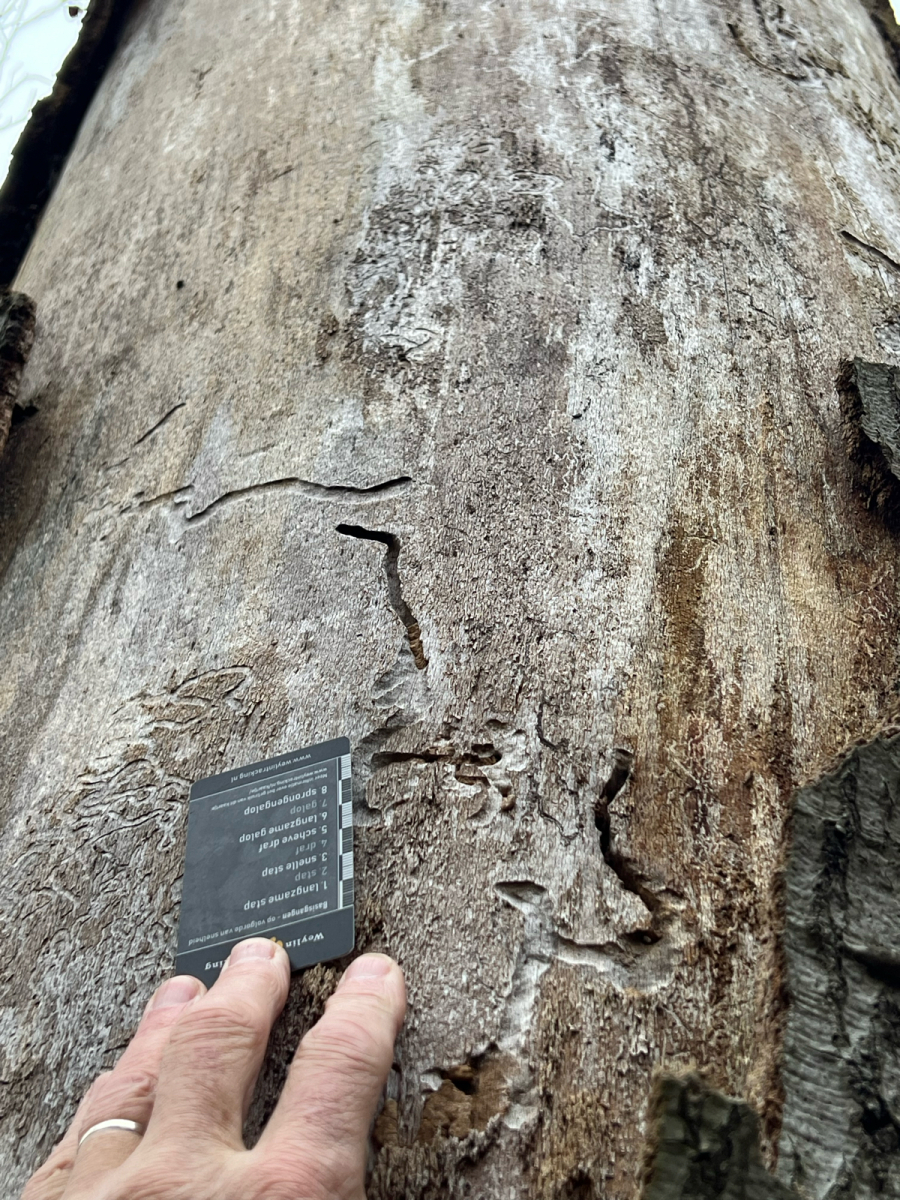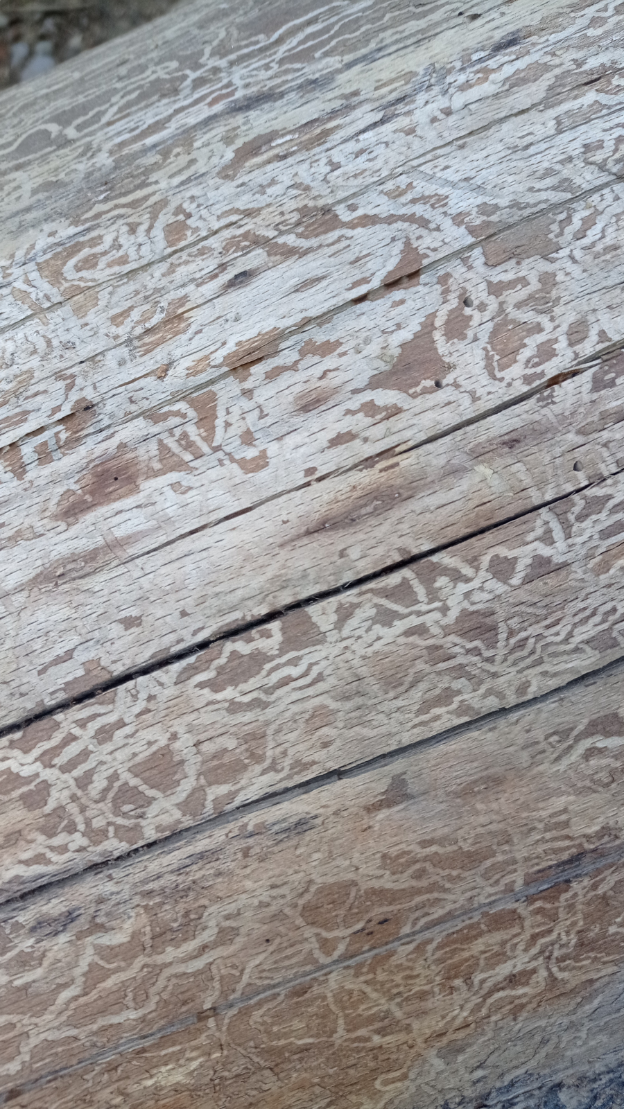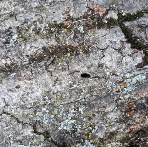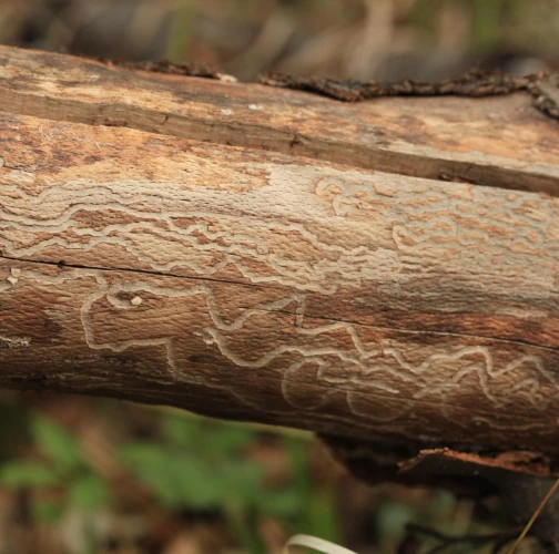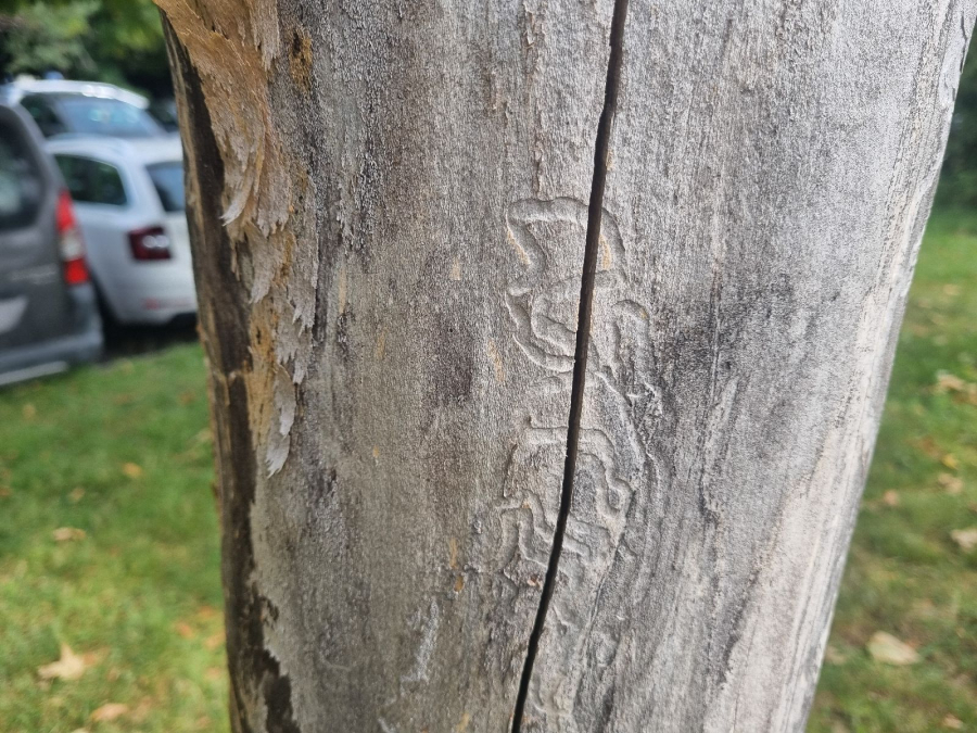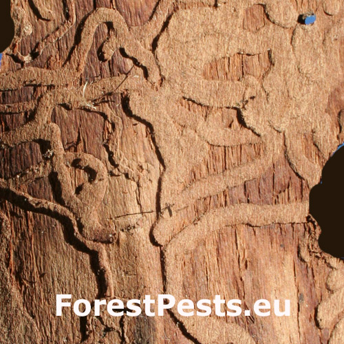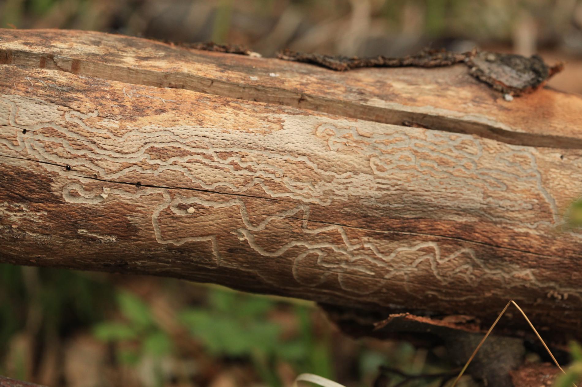 Hadovitý požerok pod kôrou vyplnený drvinou.