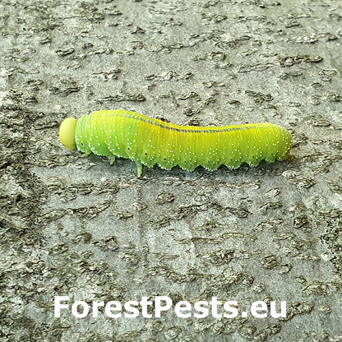 Defoliácia listov. Veľká, zelenožltá larva.