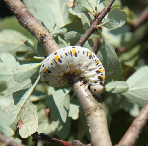Veľké belavé larvy s čierno – žltým vzorom. Defoliácia listov.