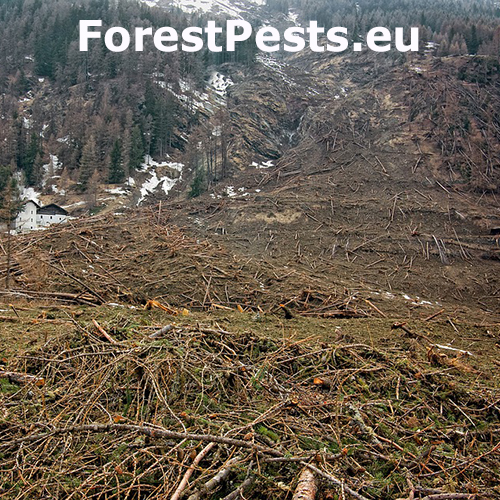 Vytrhané stromčeky, polámané kmene, vývraty. V Strednej Európe sa lavíny najčastejšie vyskytujú v oblasti Álp a Západných Karpát. Najčastejšie symptómy sú zlomy kmeňa, vývraty, vytrhané stromčeky. Sneh padá do údolia v smere najväčšieho spádu svahu, strháva všetko čo mu prekáža. Okrajové stromy pozdĺž lavínovej dráhy odierajú hrnúce kamene. V údolí lavína spravidla naráža do protiľahlého svahu, kde taktiež poškodzuje či ničí dreviny.