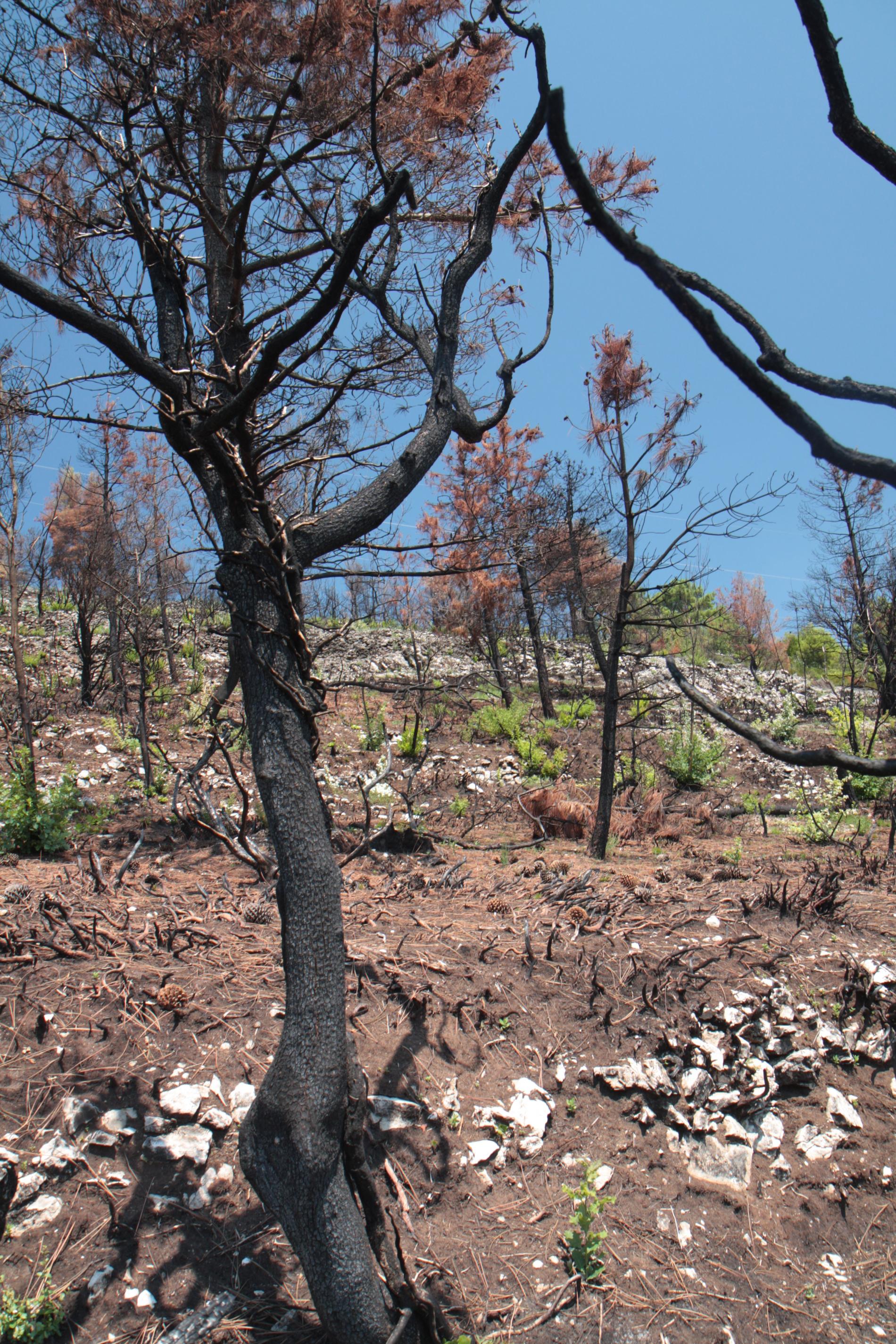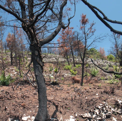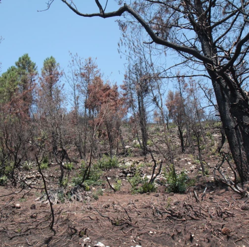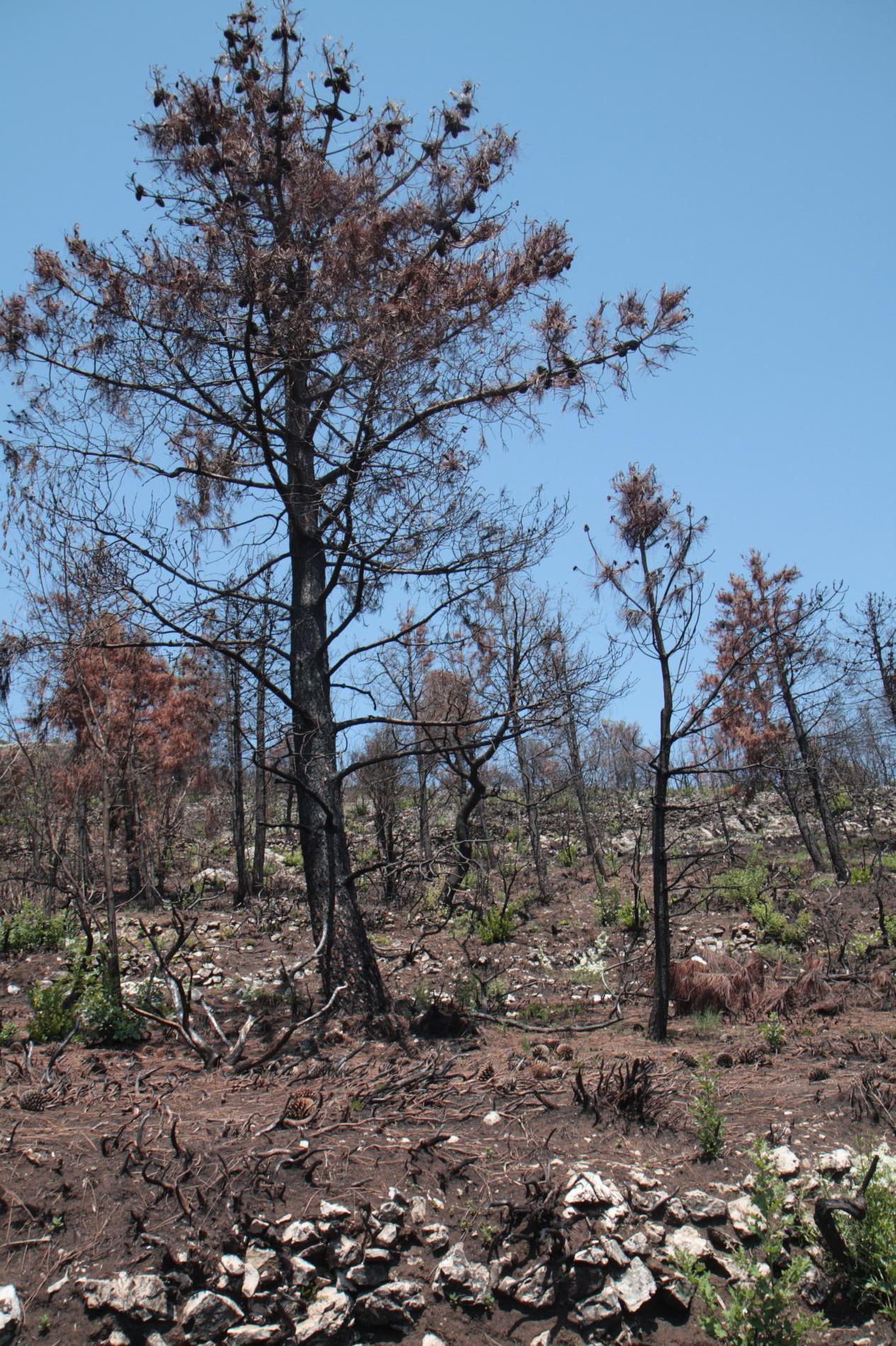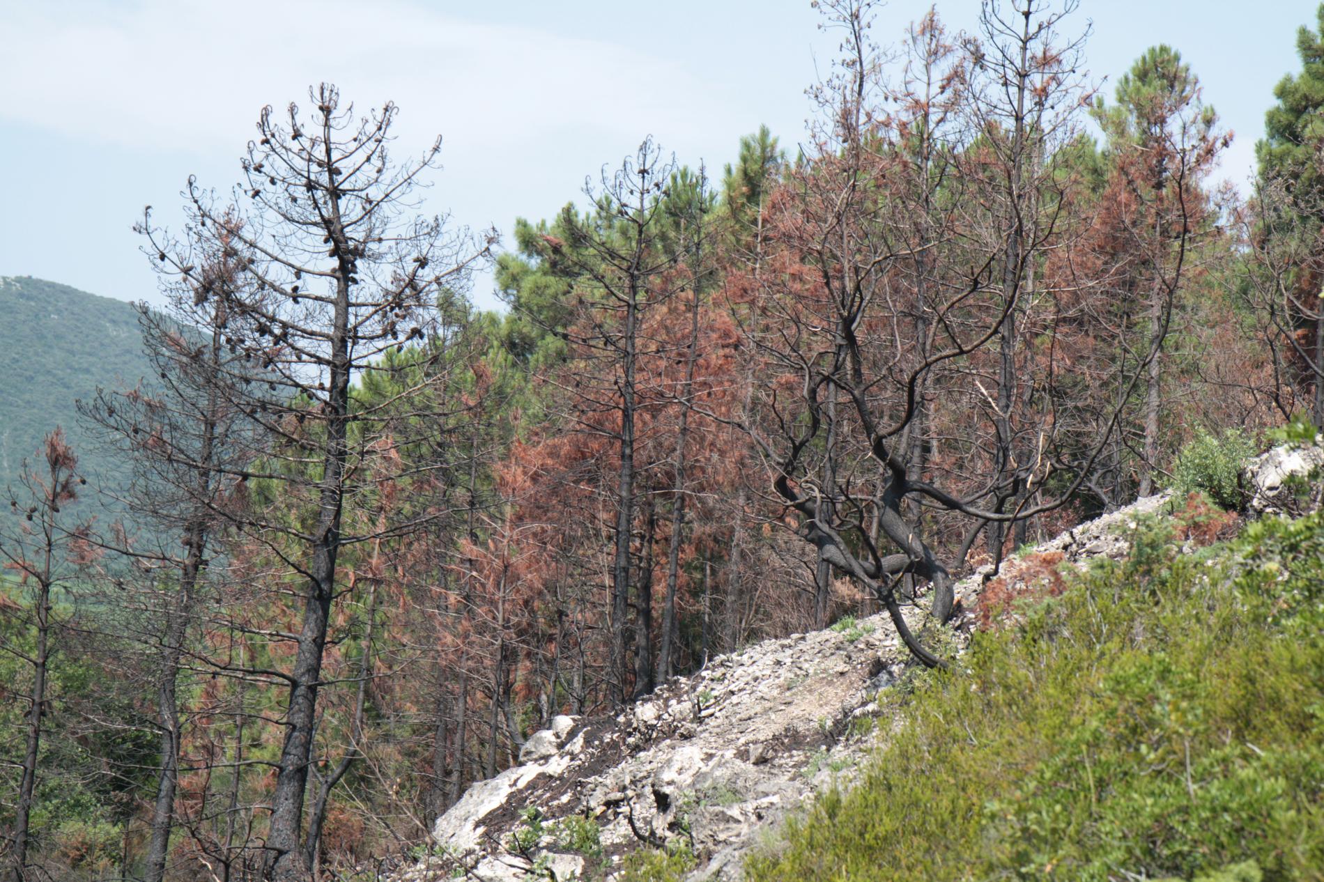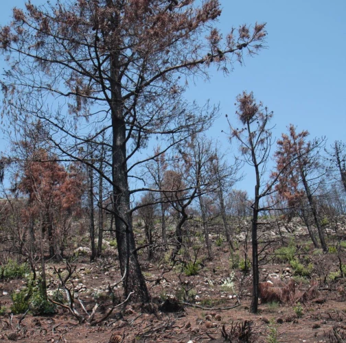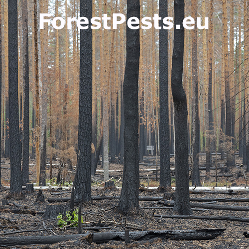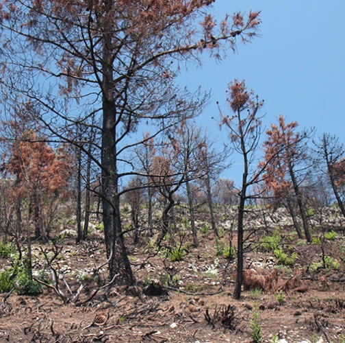 Spálená kôra, listy, ihlice, čierne sfarbenie po spálení.