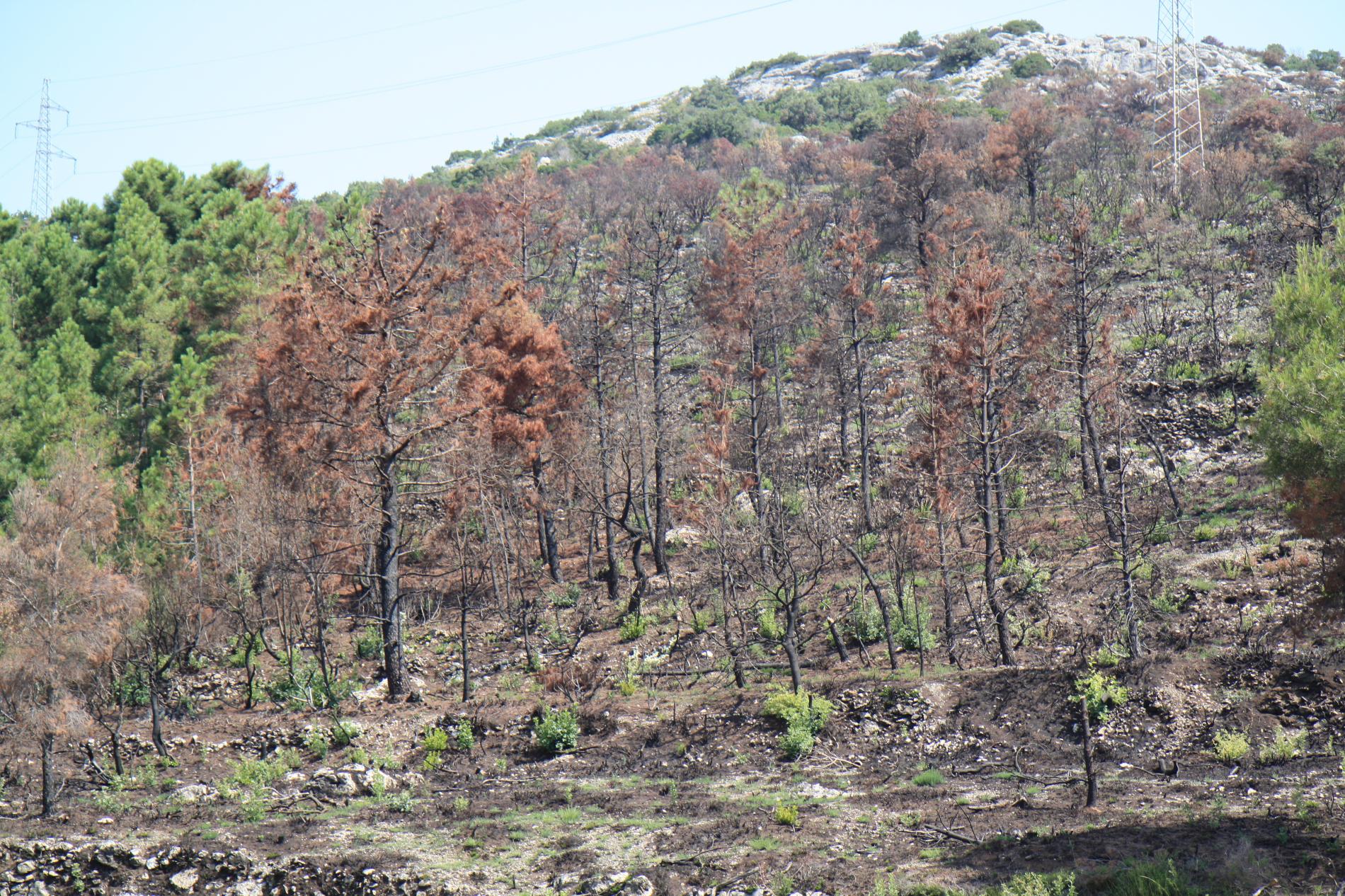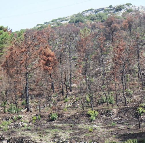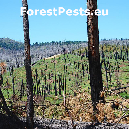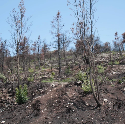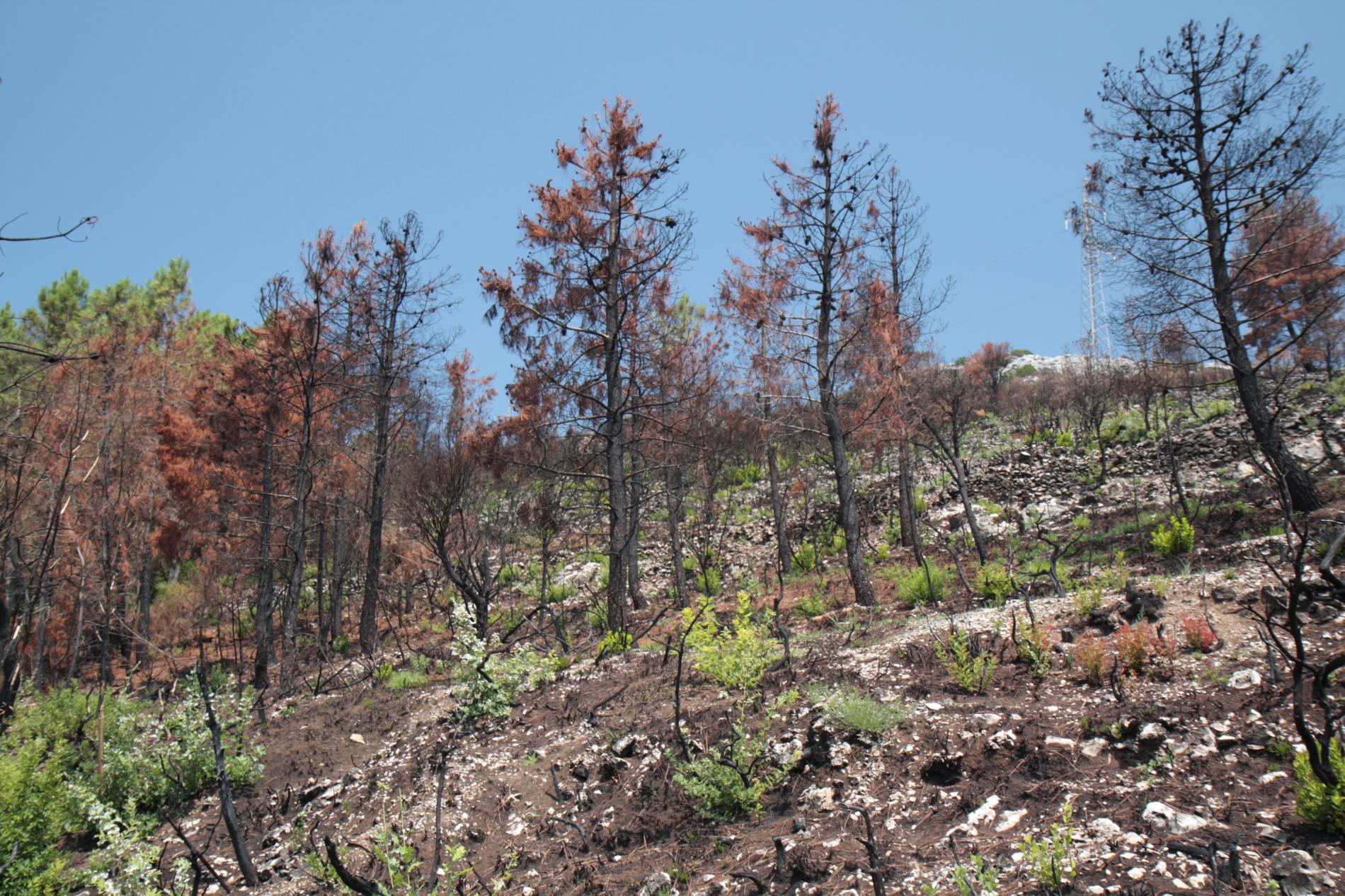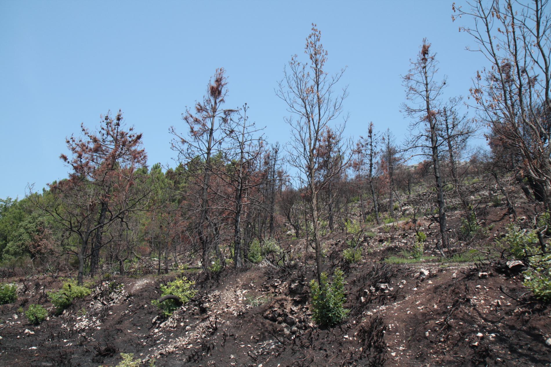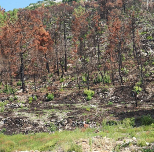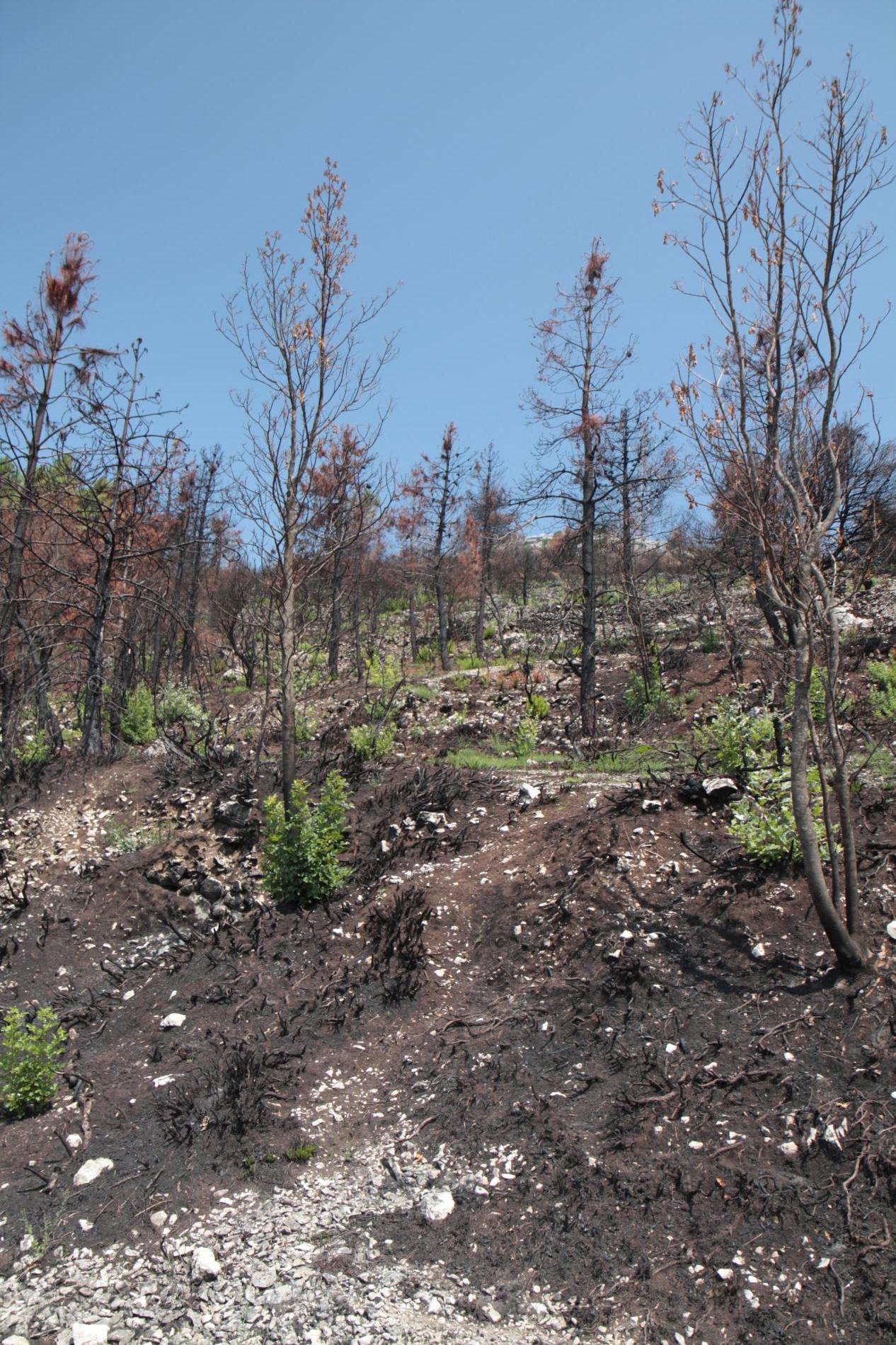 Spálená kôra, listy, ihlice, čierne sfarbenie po spálení.