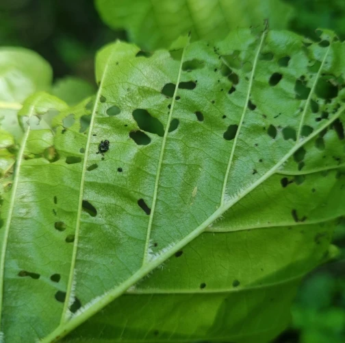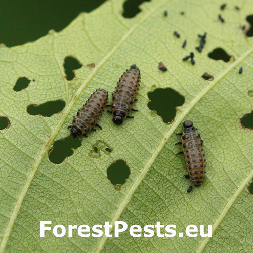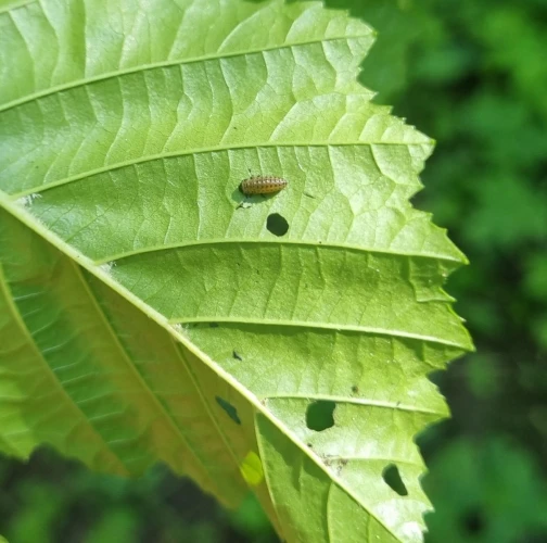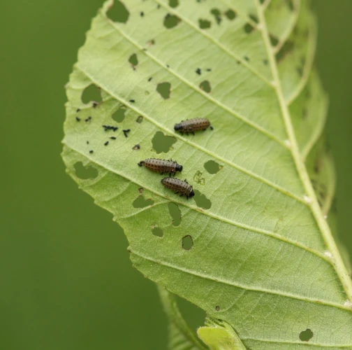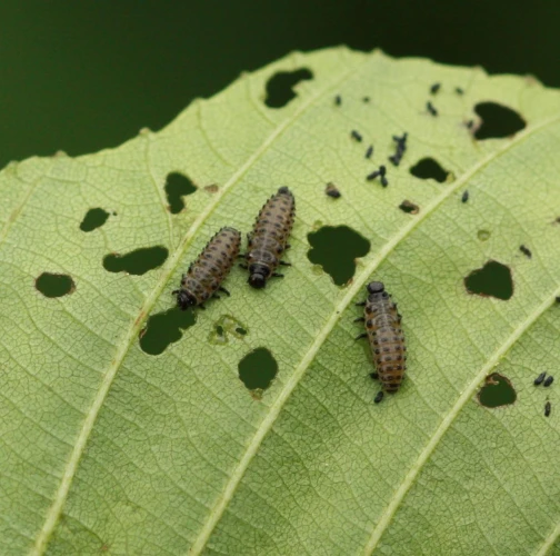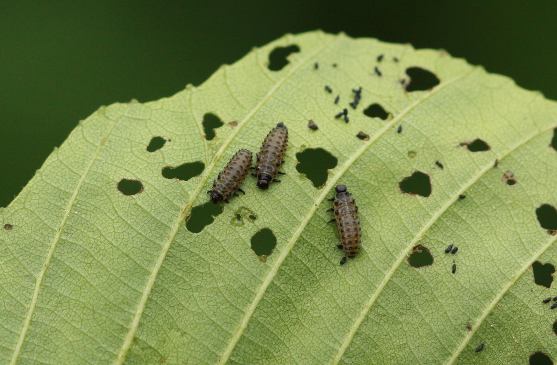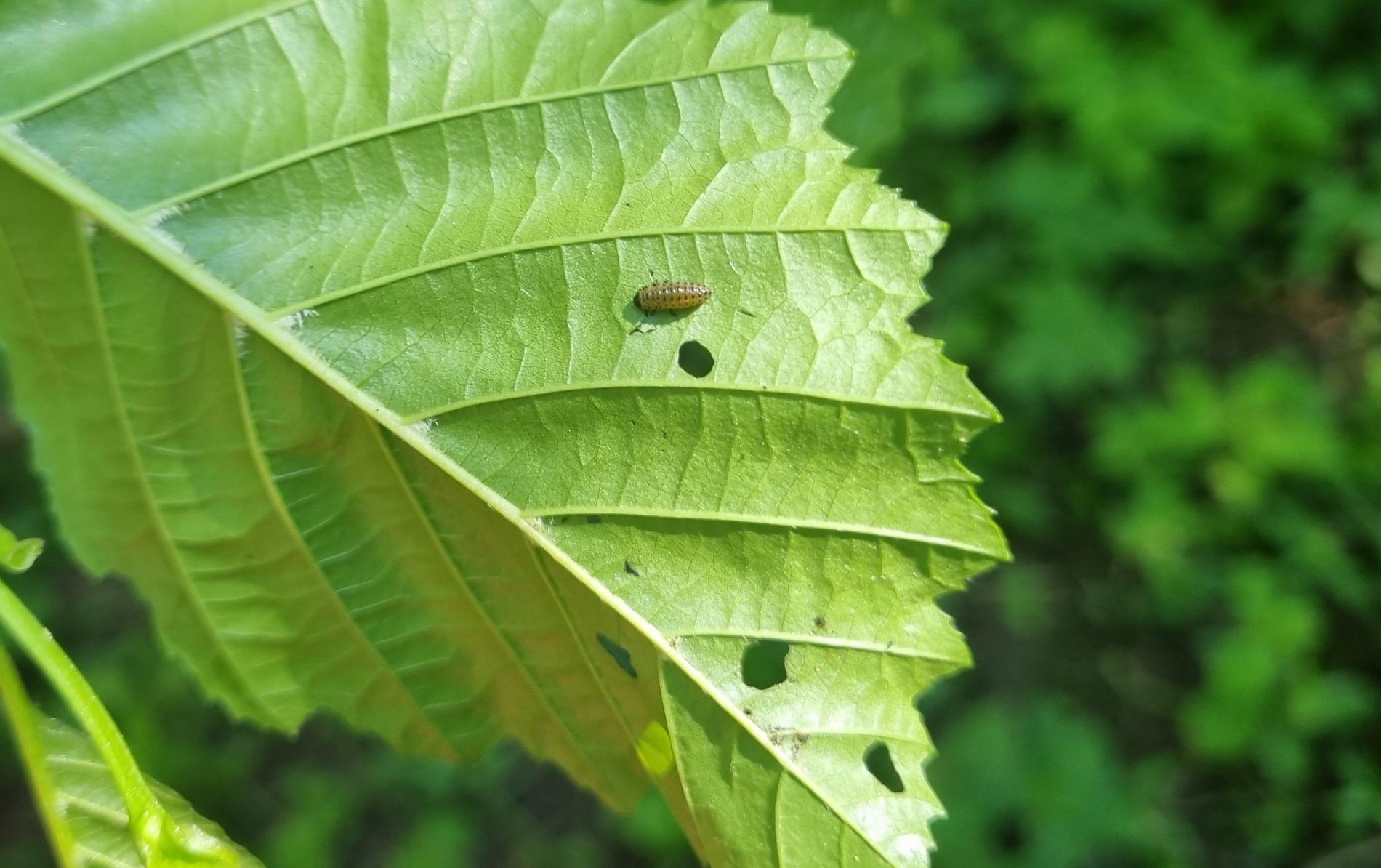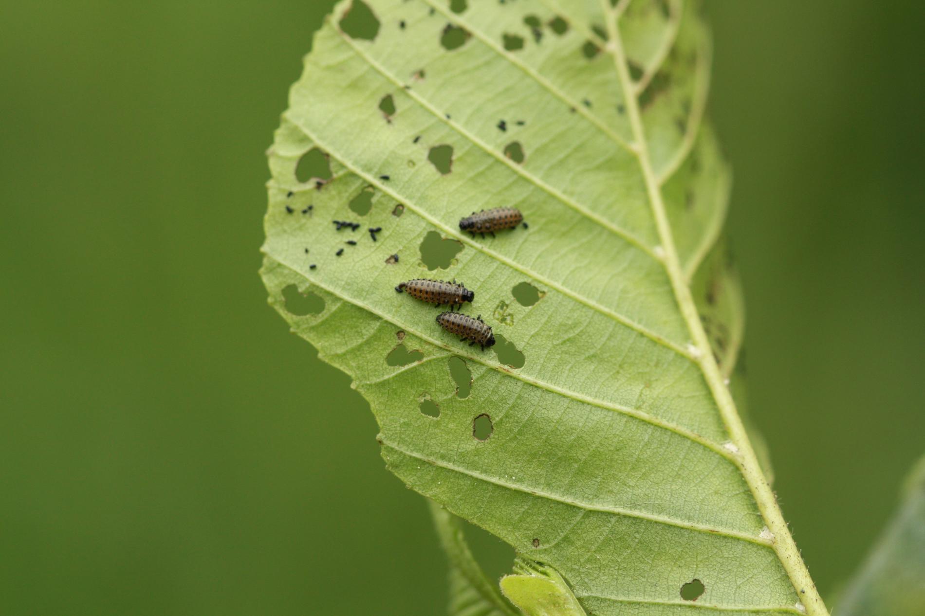 Larva a lesklý chrobák na liste. Poškodenie listov.