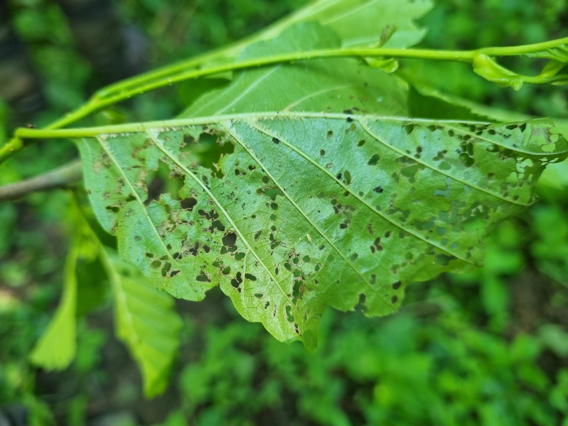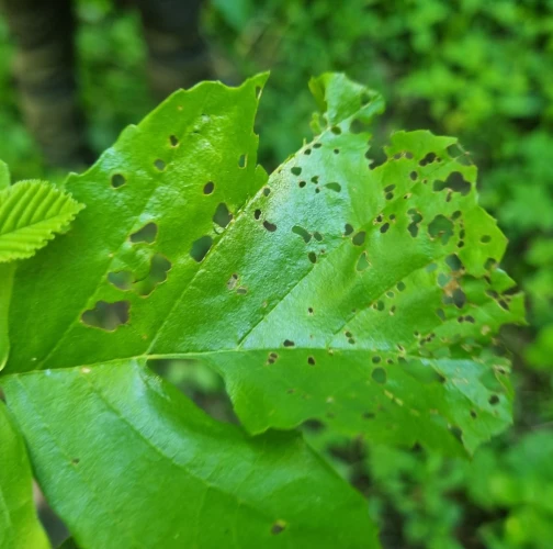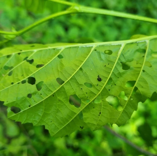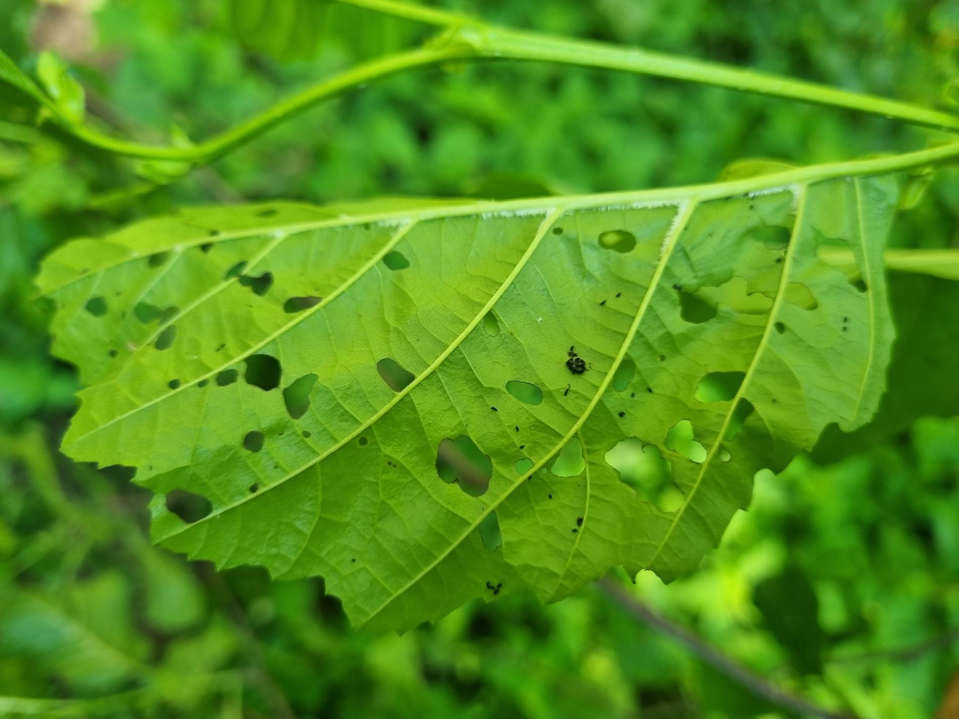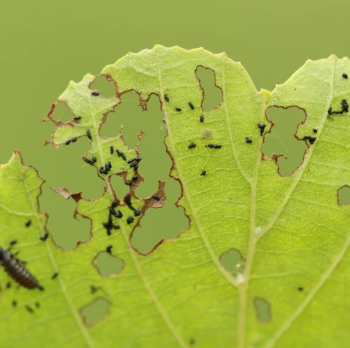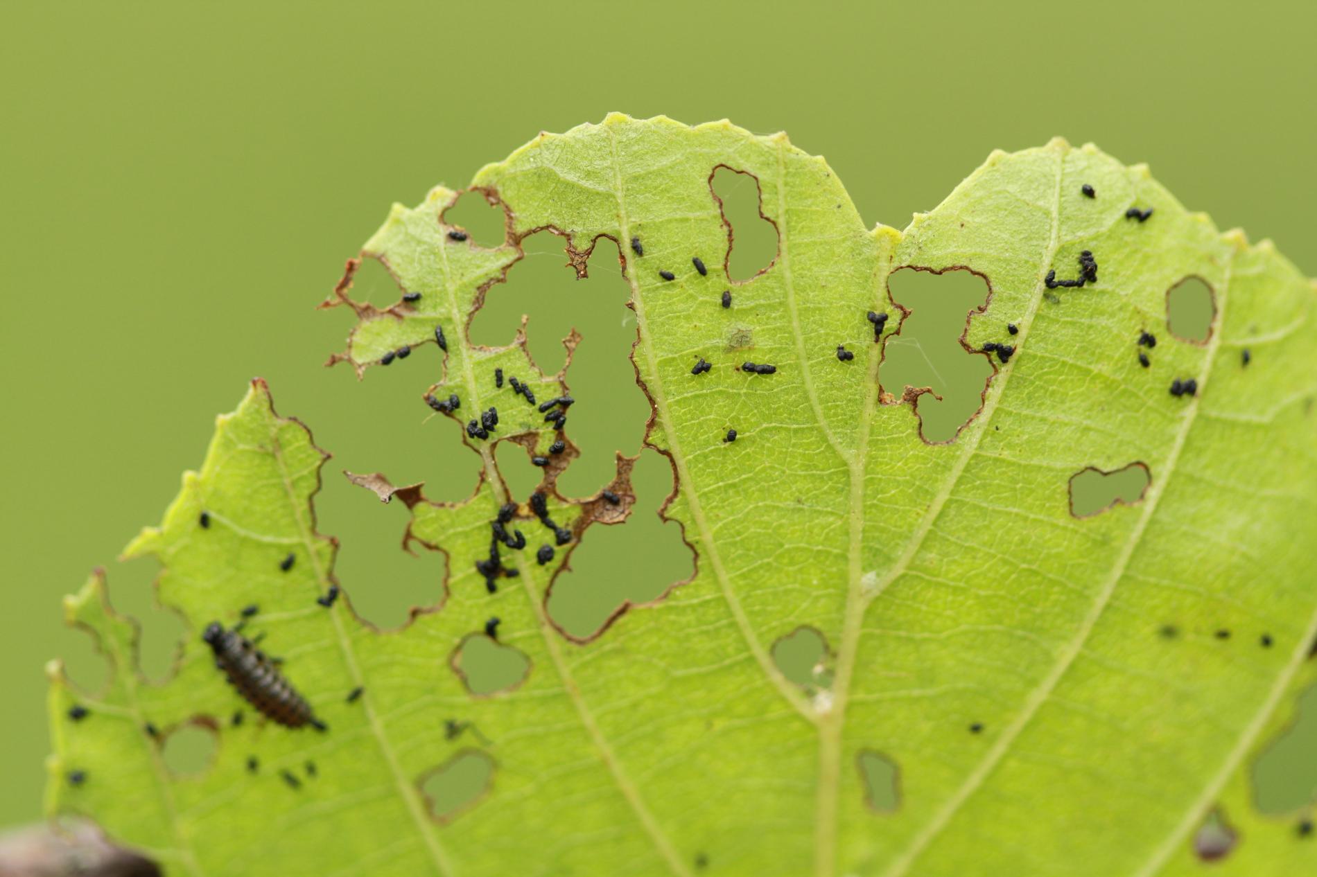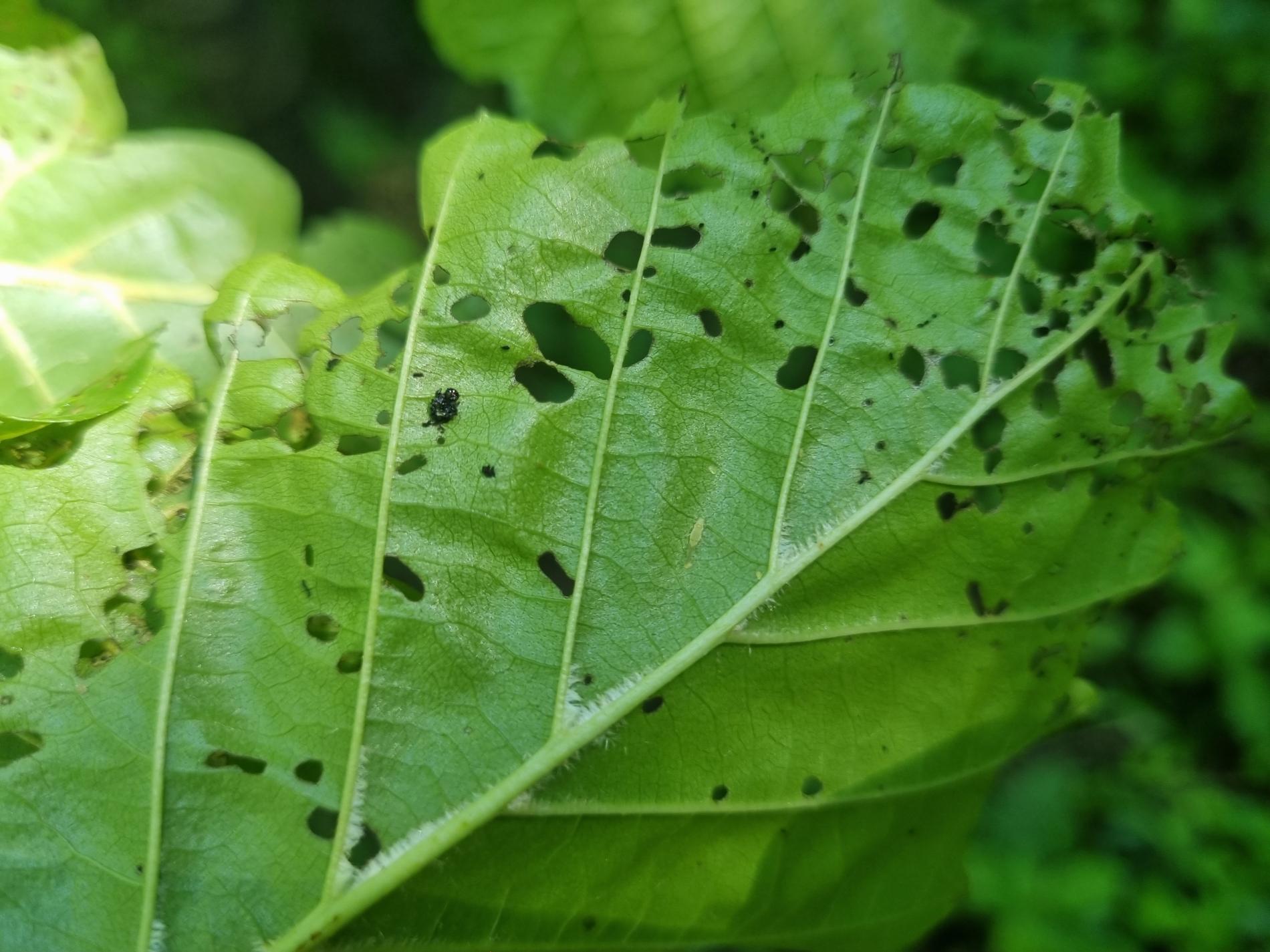Larva a lesklý chrobák na liste. Poškodenie listov.