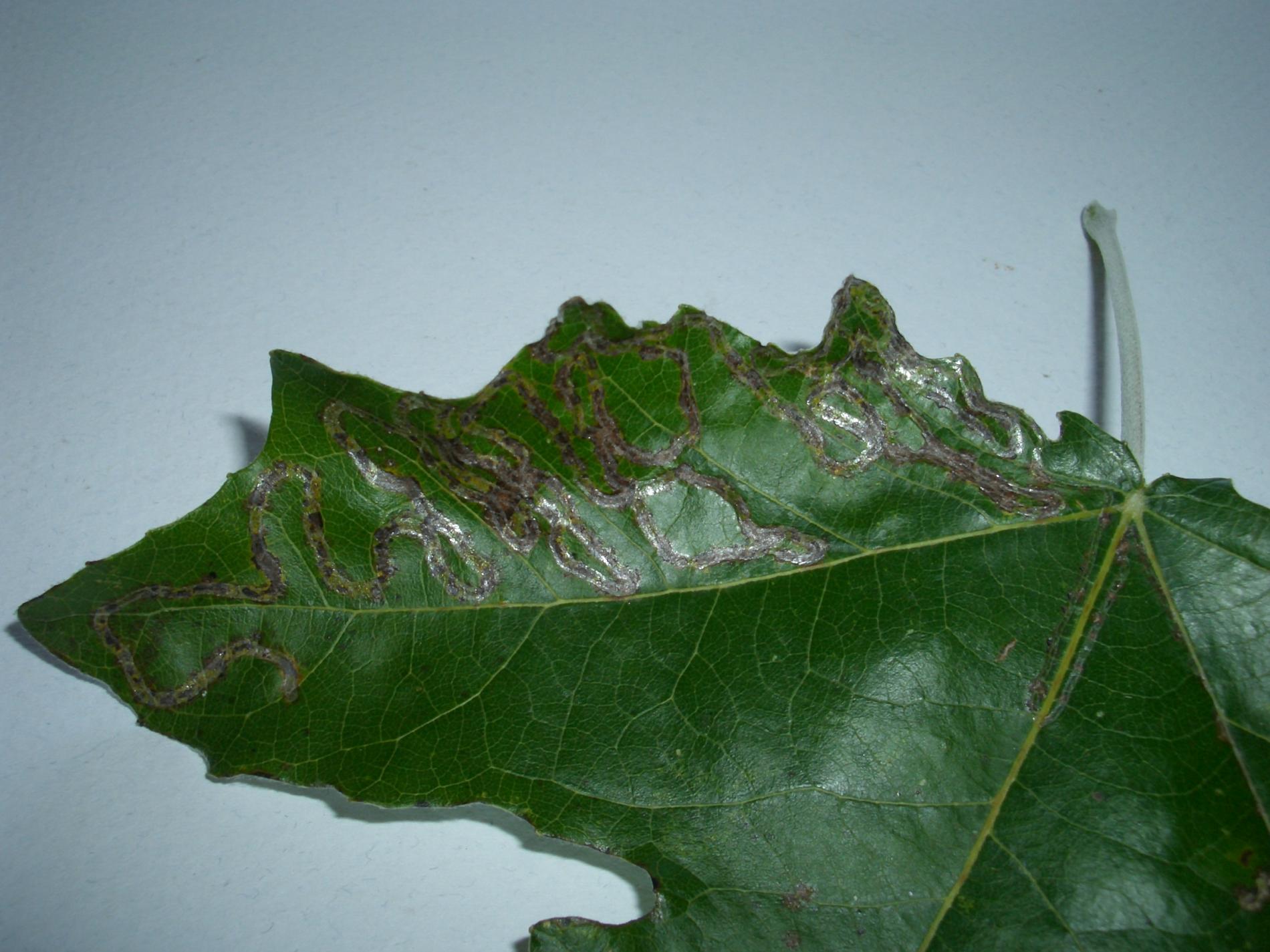 - Charakteristika mín: Požerok je výrazne kľukatý, často sa javí ako labyrint a je širší než míny iných druhov Phyllocnistis. Trus je uložený v strede a je veľmi výrazný. Okraj listu môže byť zahnutý.