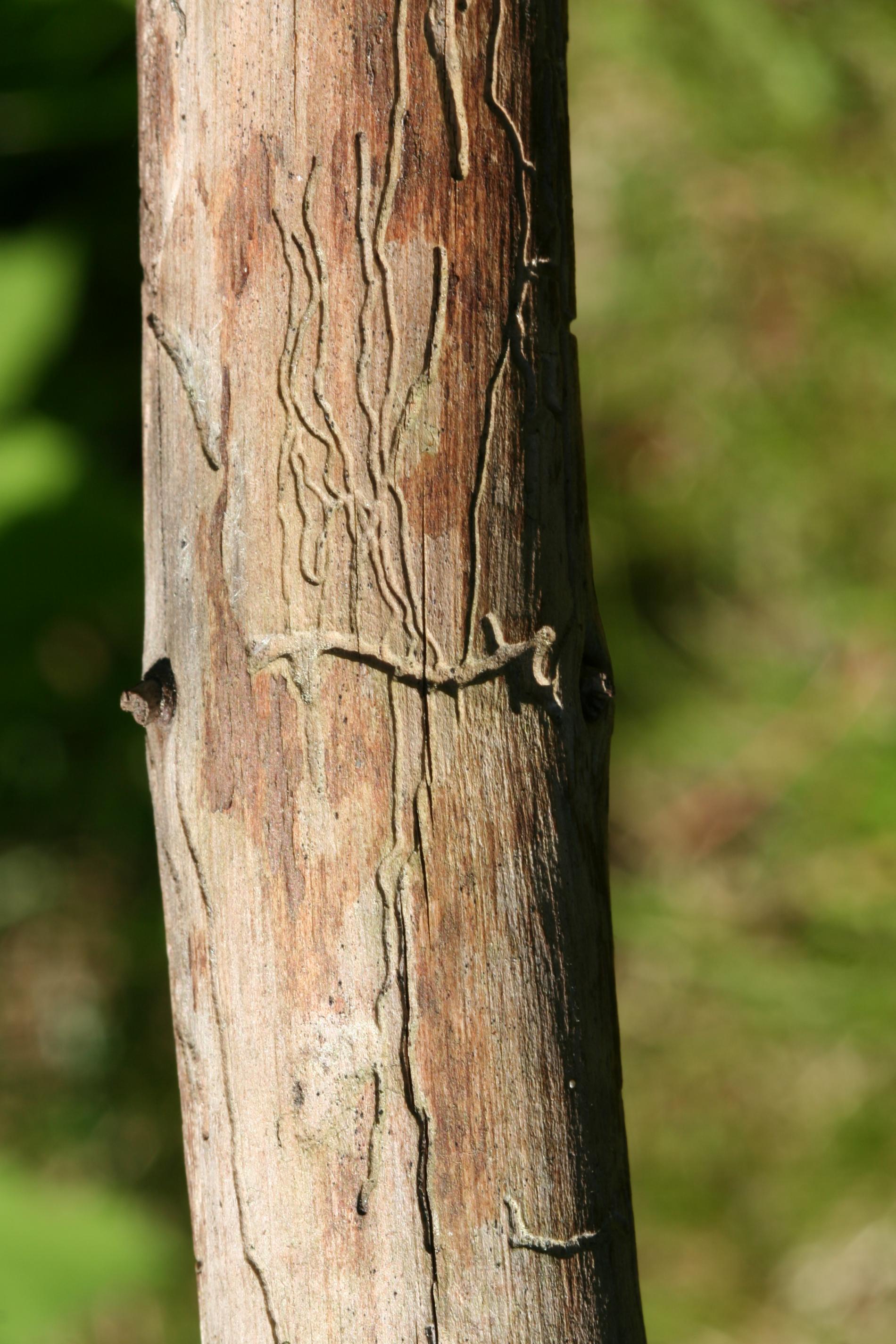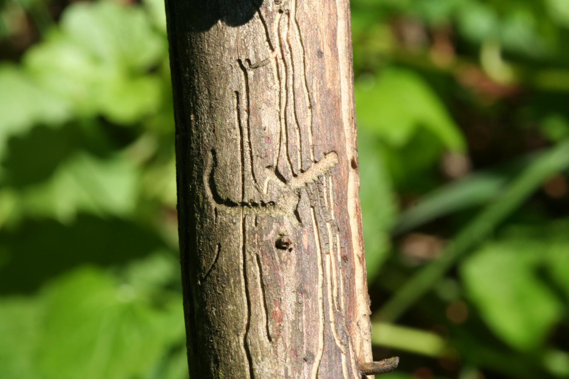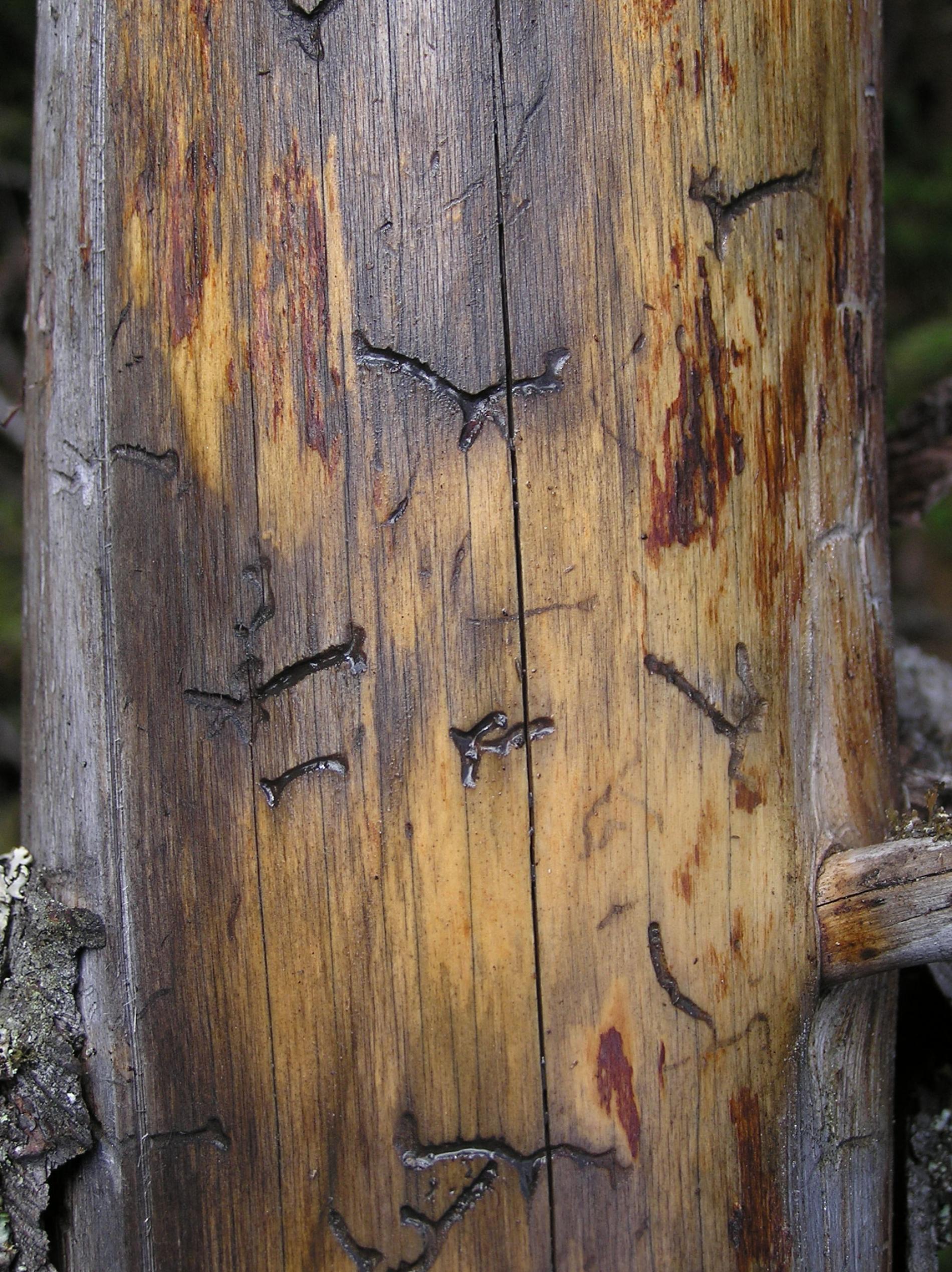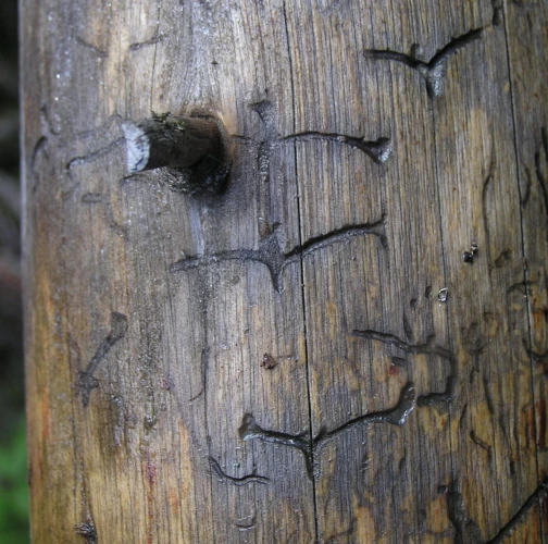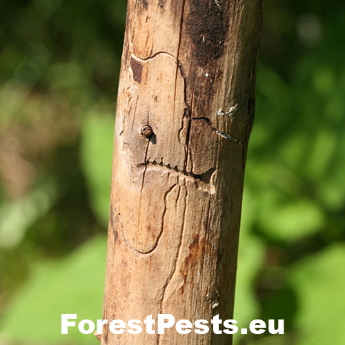 Imága vyhľadávajú tenké, odumierajúce smrekové vetvy, kde vyžiera typický fajkovitý požerok tvaru „V“.