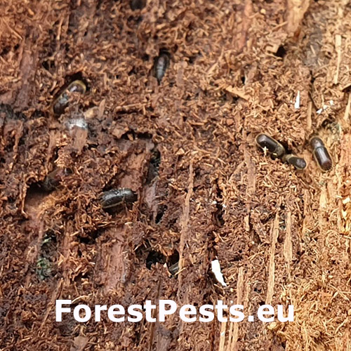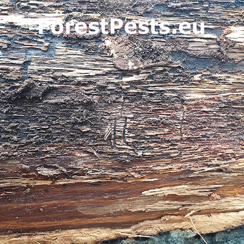 Pod kôrou sú prítomné hviezdicovité sústavy chodieb s viacerými materskými chodbami vybiehajúcimi z centrálnej komôrky. Na povrchu kôry sú viditeľné drobné okrúhle výletové otvory, často s jemnými drvinkami.