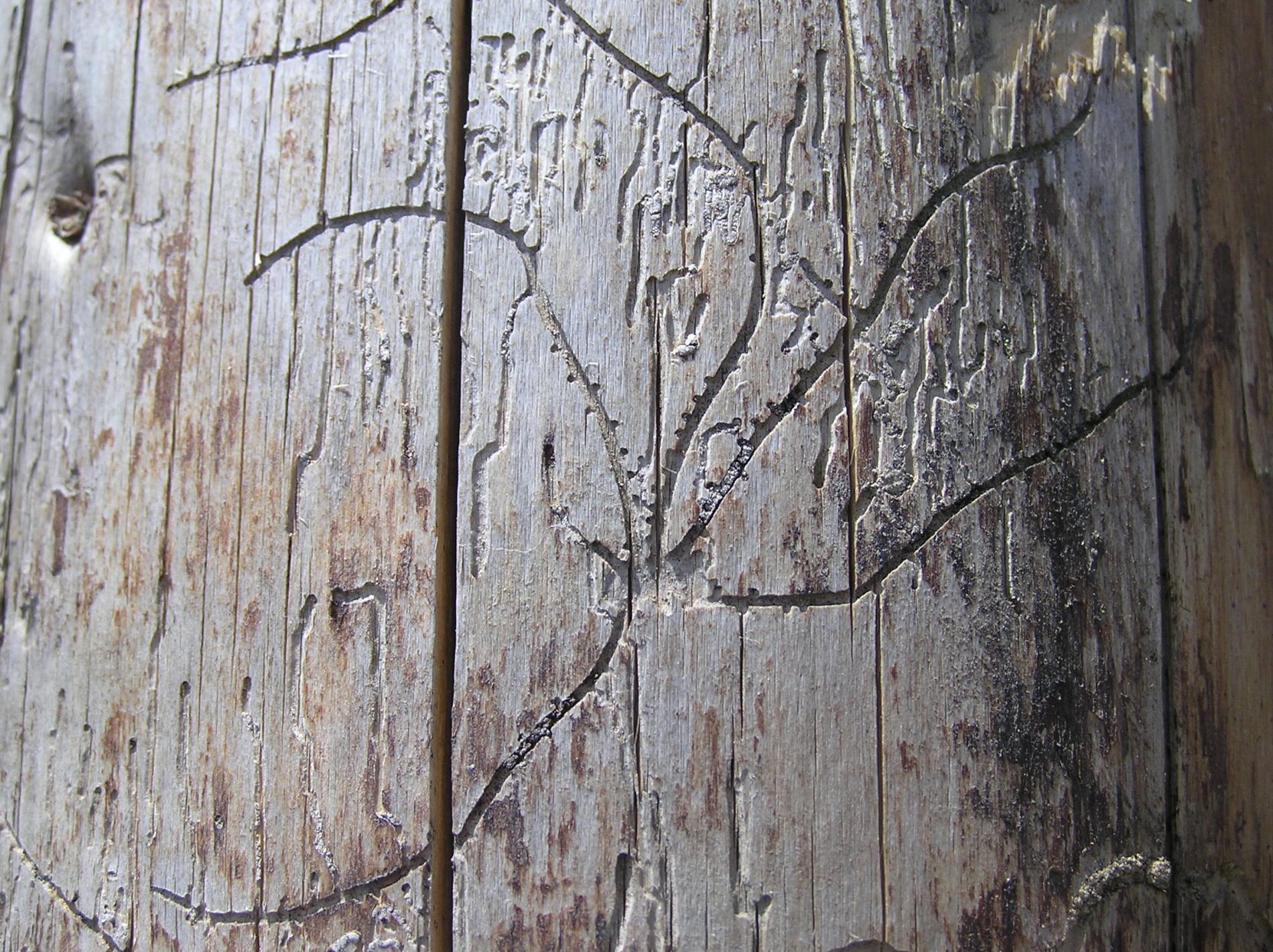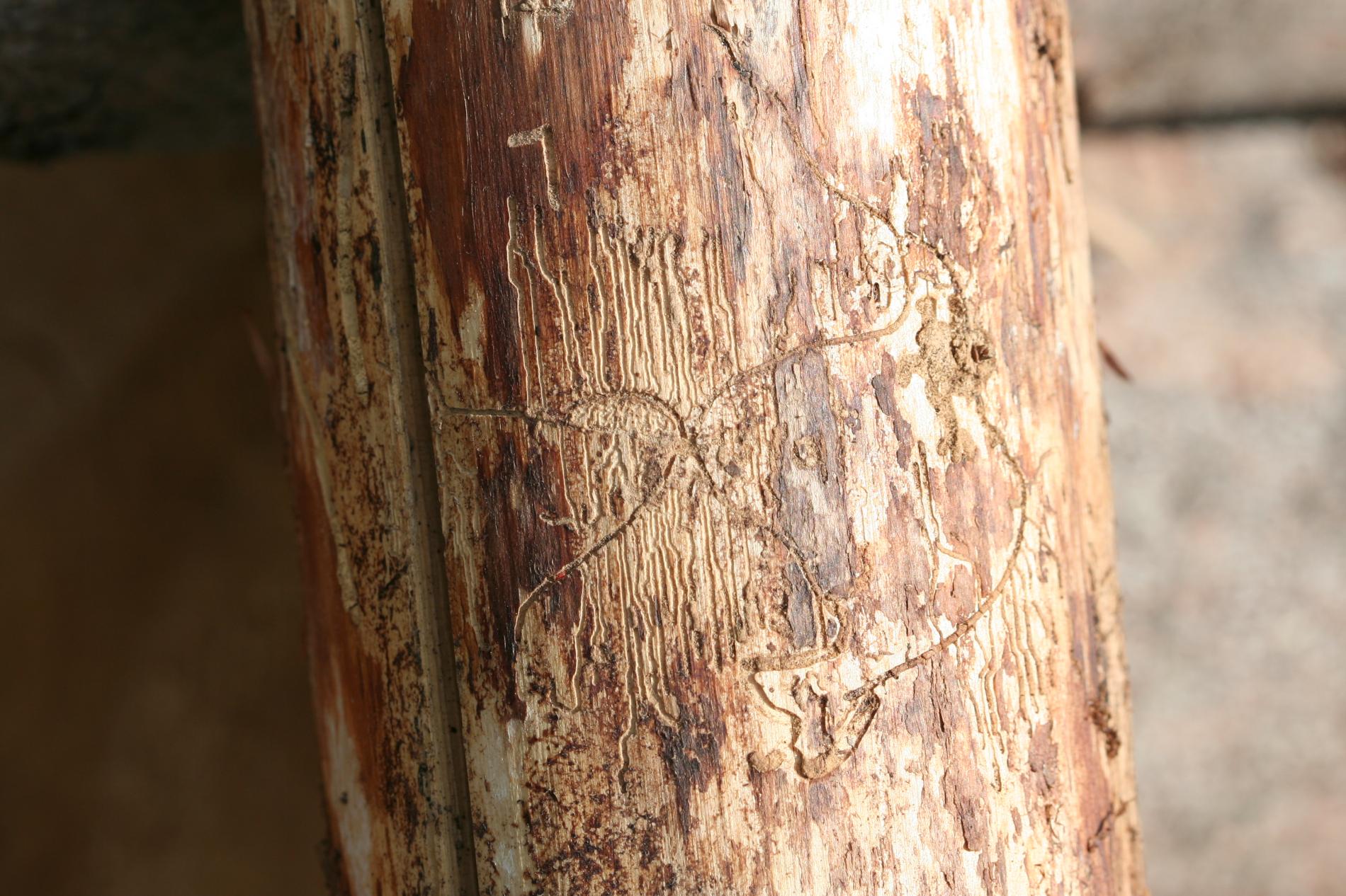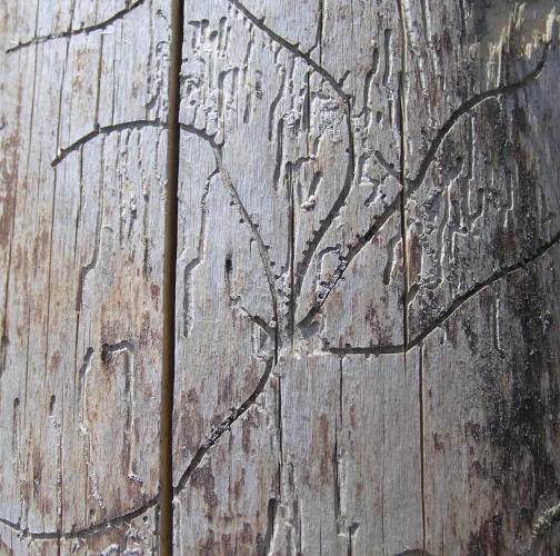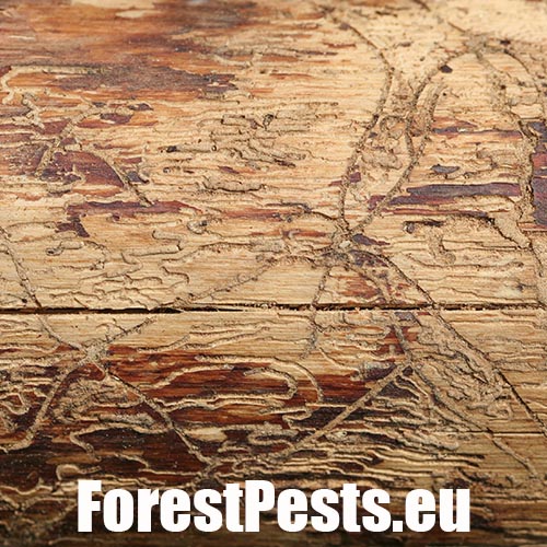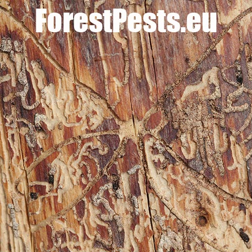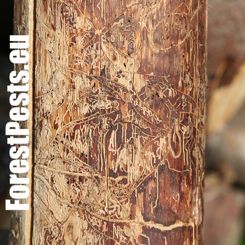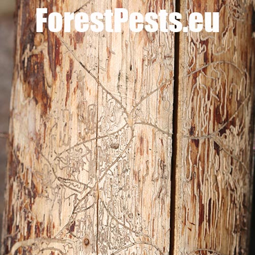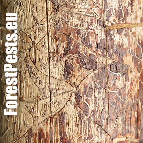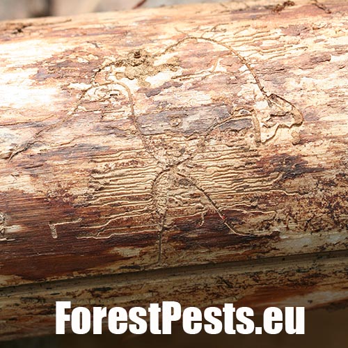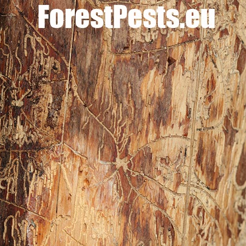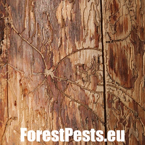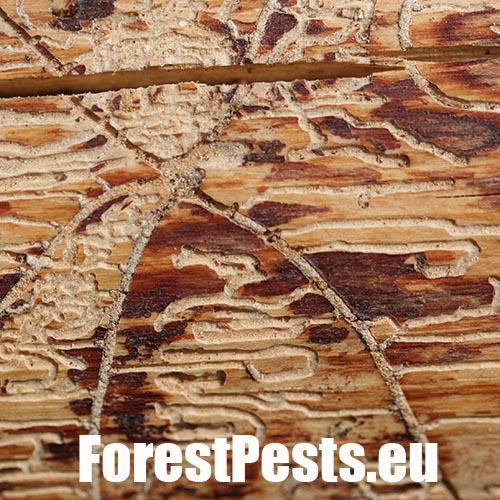 Požerky pod kôrou. Poškodené stromy menia farbu ihličia najmä na najviac obsadených vetvách, ktoré postupne odumierajú. Pri silnom napadnutí z nich opadáva kôra.