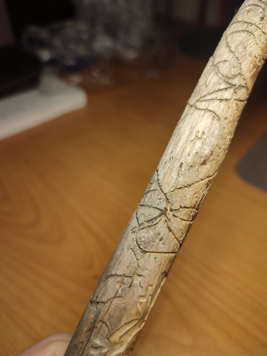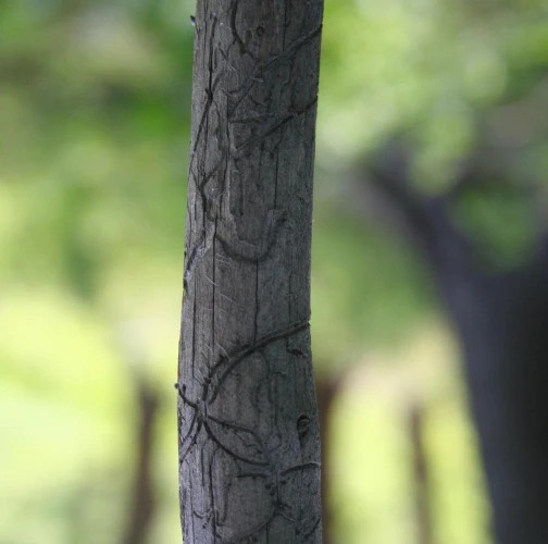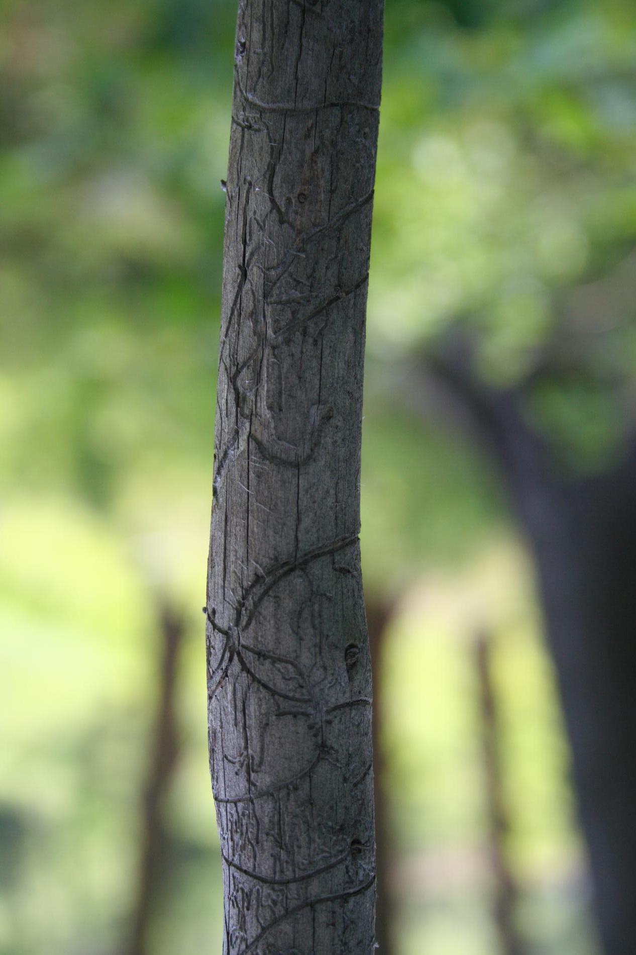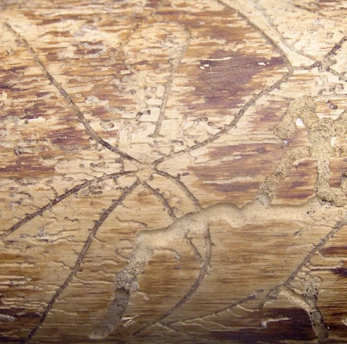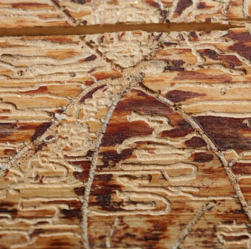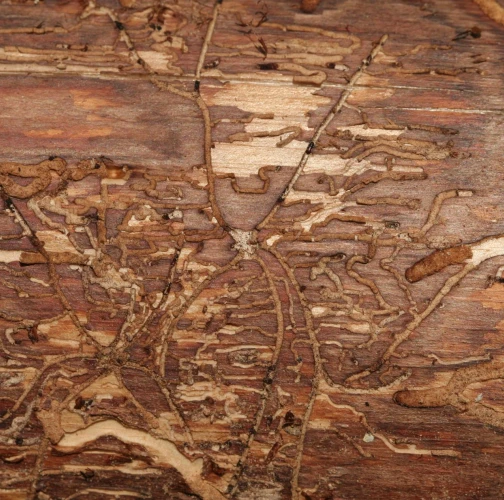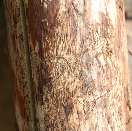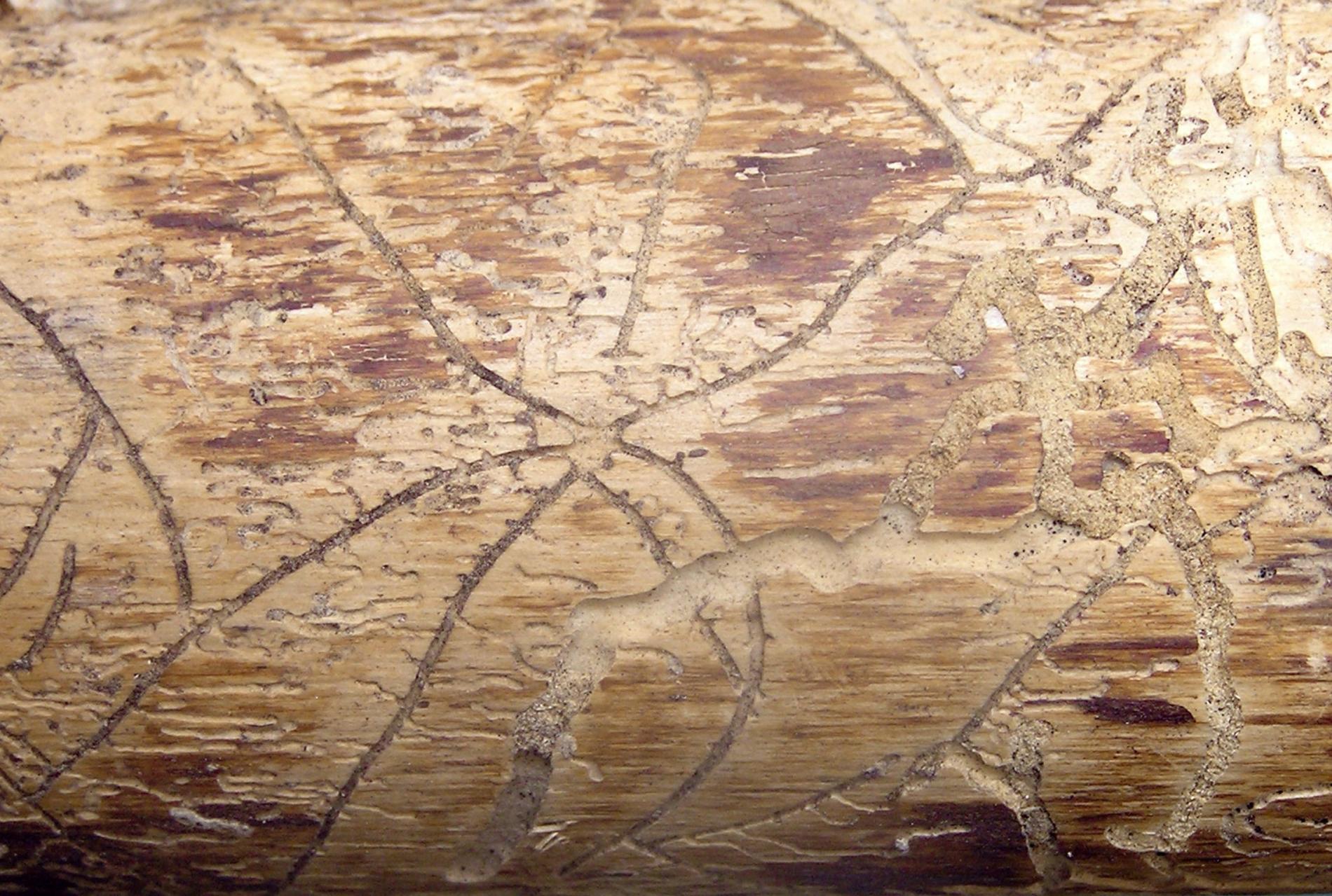Požerky pod kôrou. Poškodené stromy menia farbu ihličia najmä na najviac obsadených vetvách, ktoré postupne odumierajú. Pri silnom napadnutí z nich opadáva kôra.