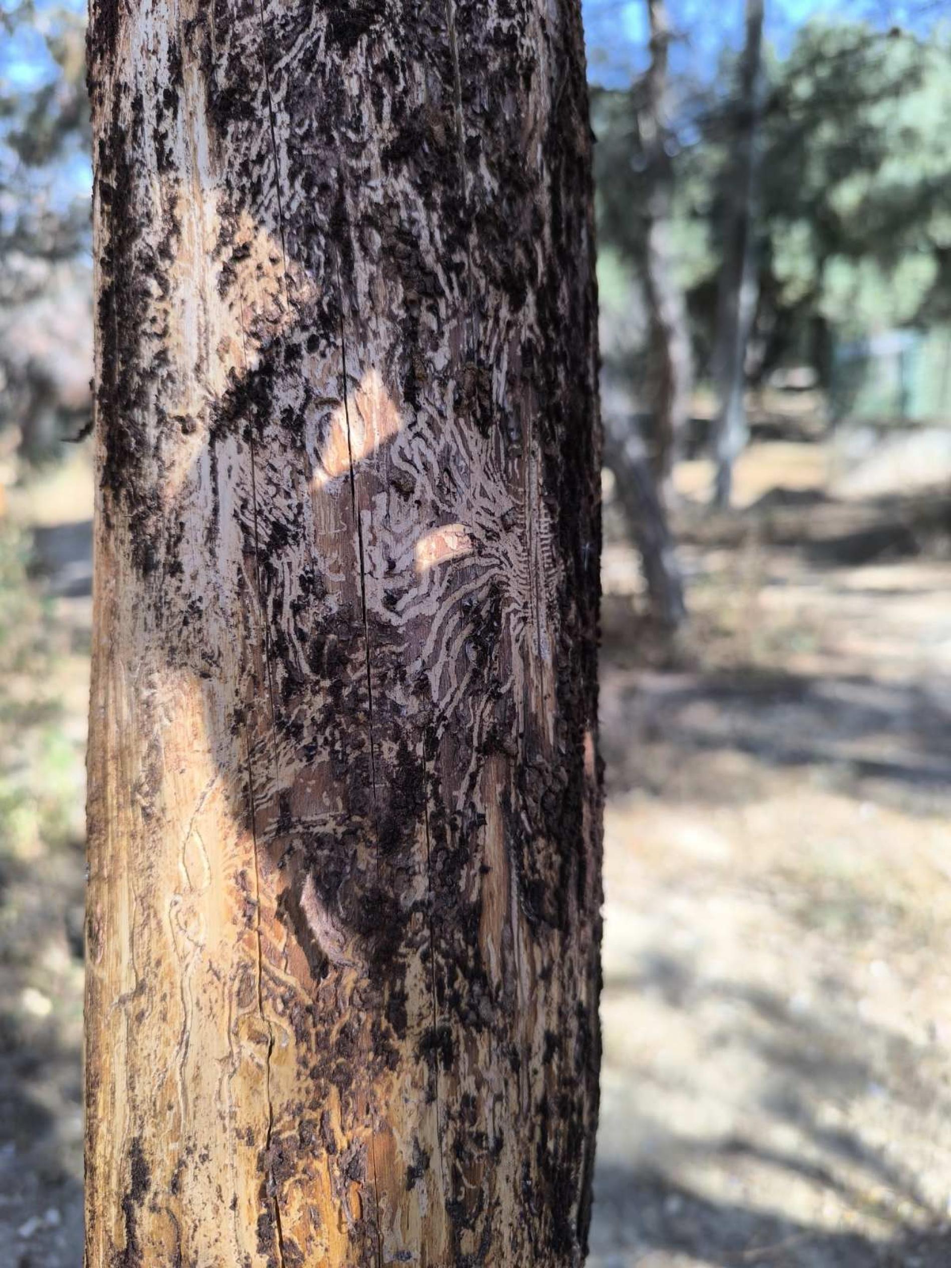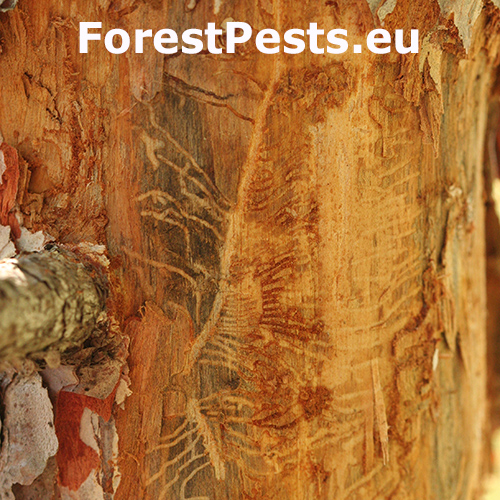 Na kôre sú viditeľné výrony živice a červenkasté drviny; pod kôrou kľukaté larválne chodby – larválny systém je vertikálny.