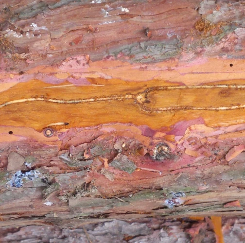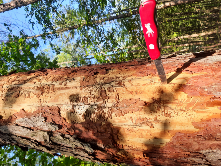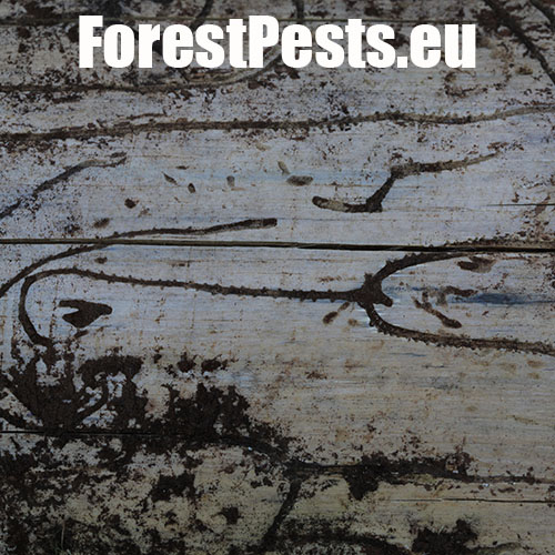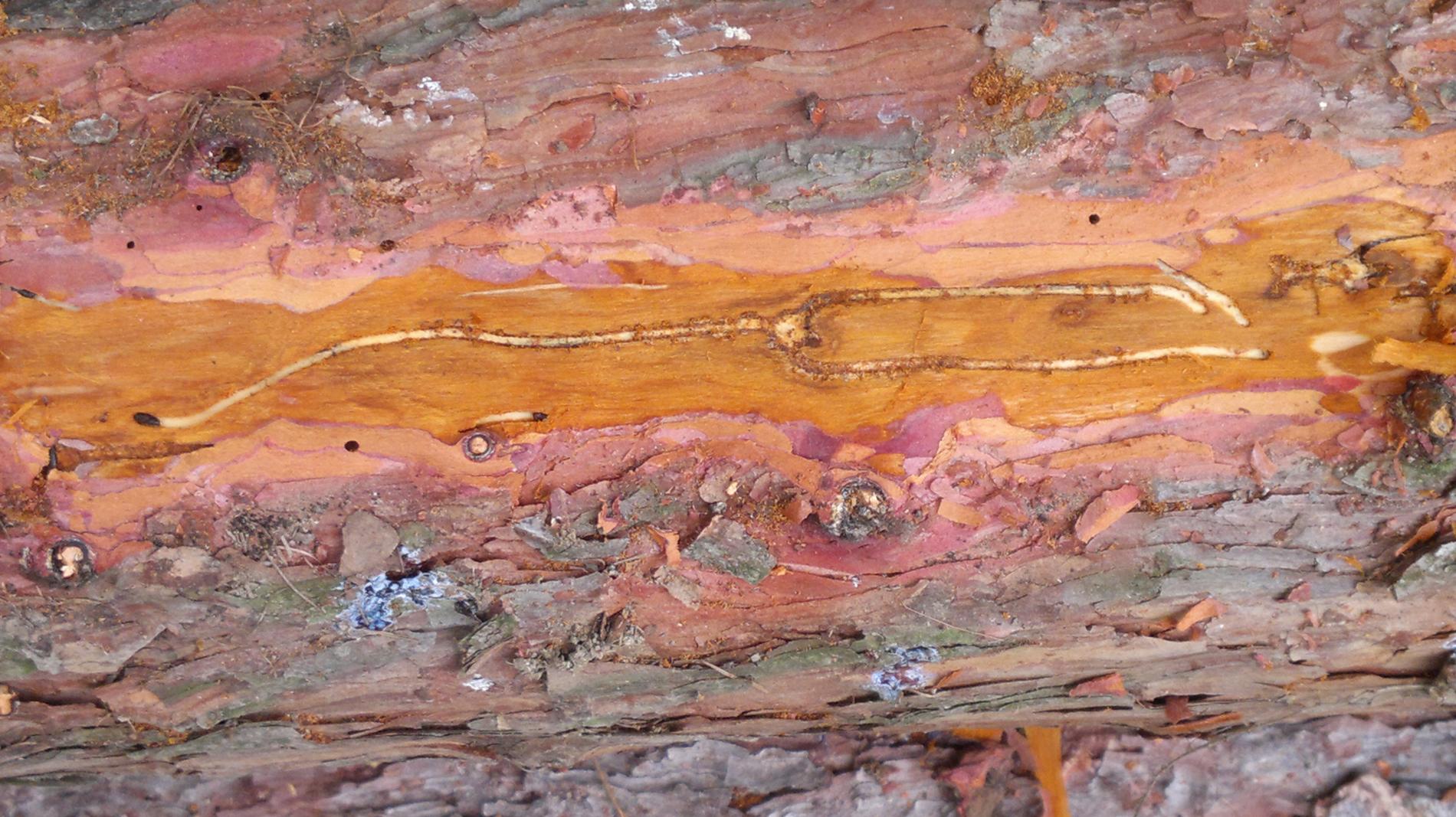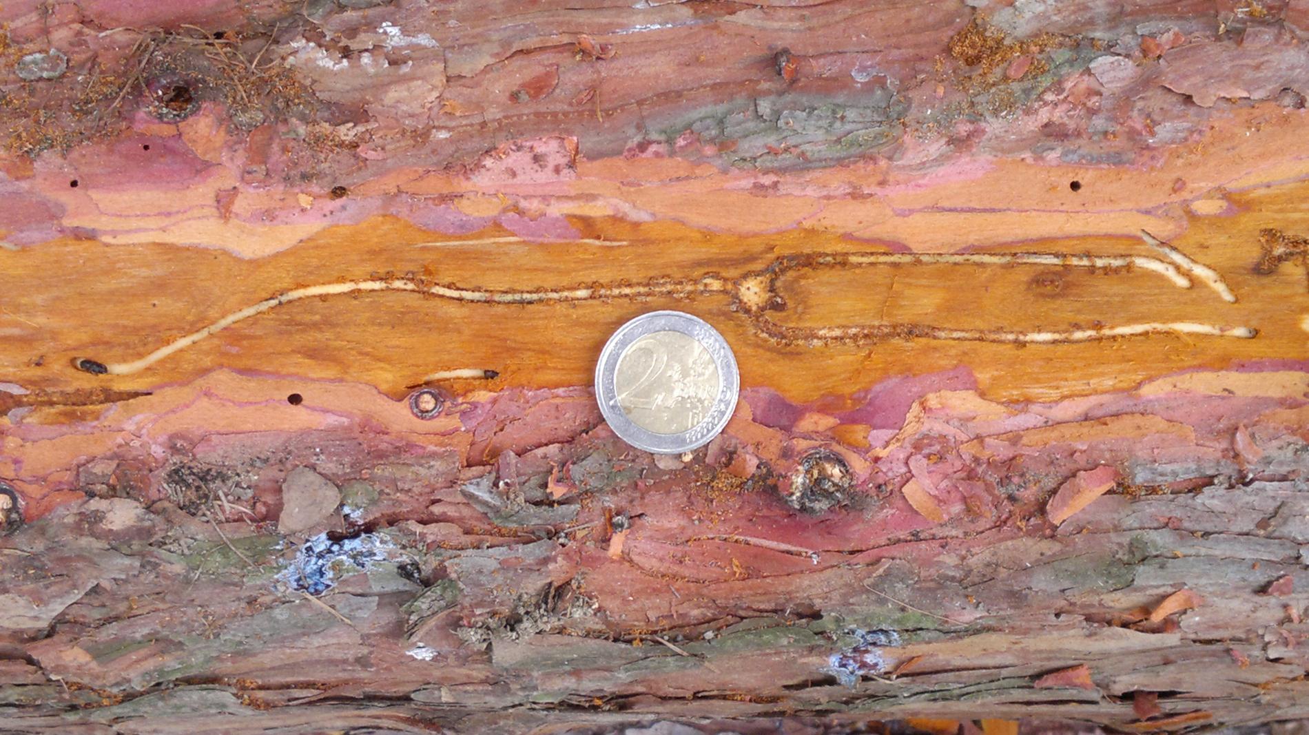 Požerok pod kôrou na kmeni.