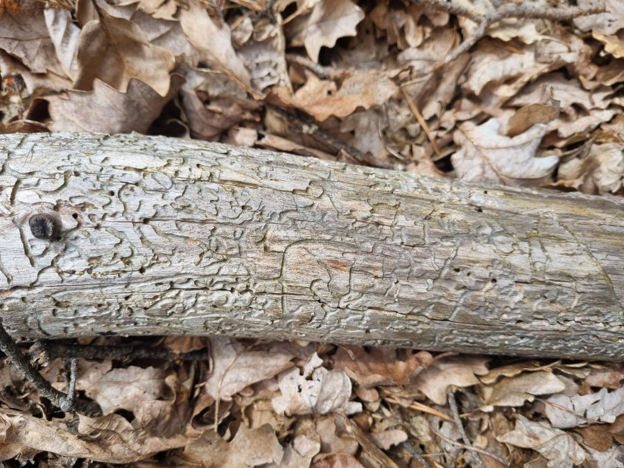 Požerok hlboko zarezaný v beli. Chodby upchané drvinkami aspoň z časti.