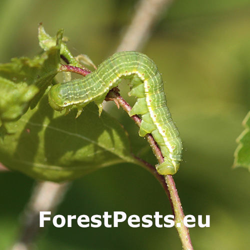 Zelená húsenica na listoch alebo na vetvičkách. Defolácia koruny.