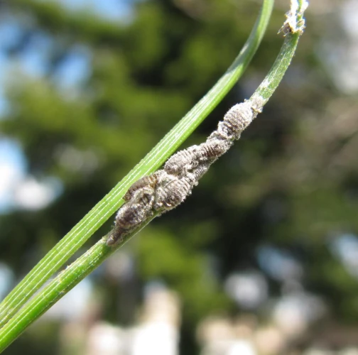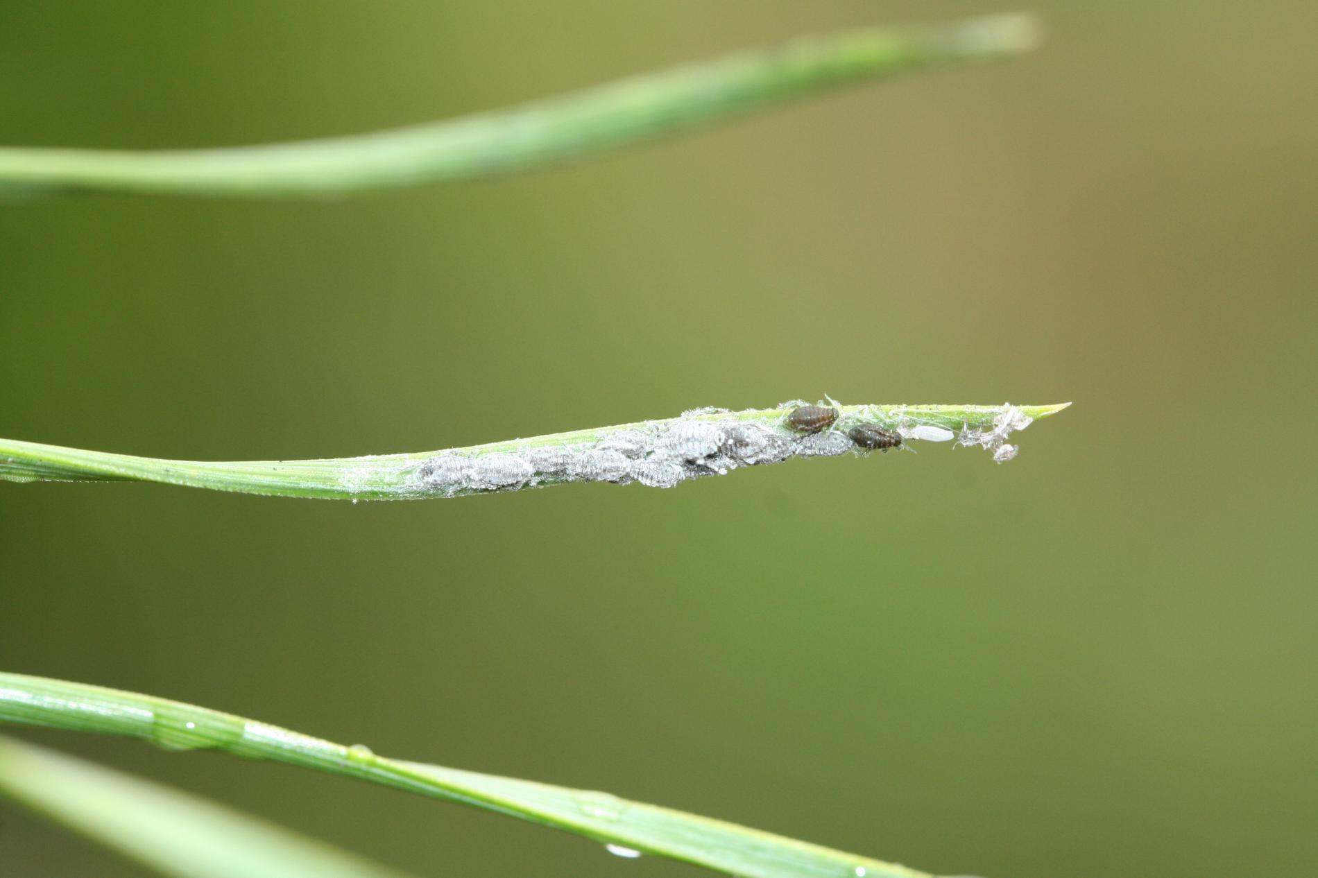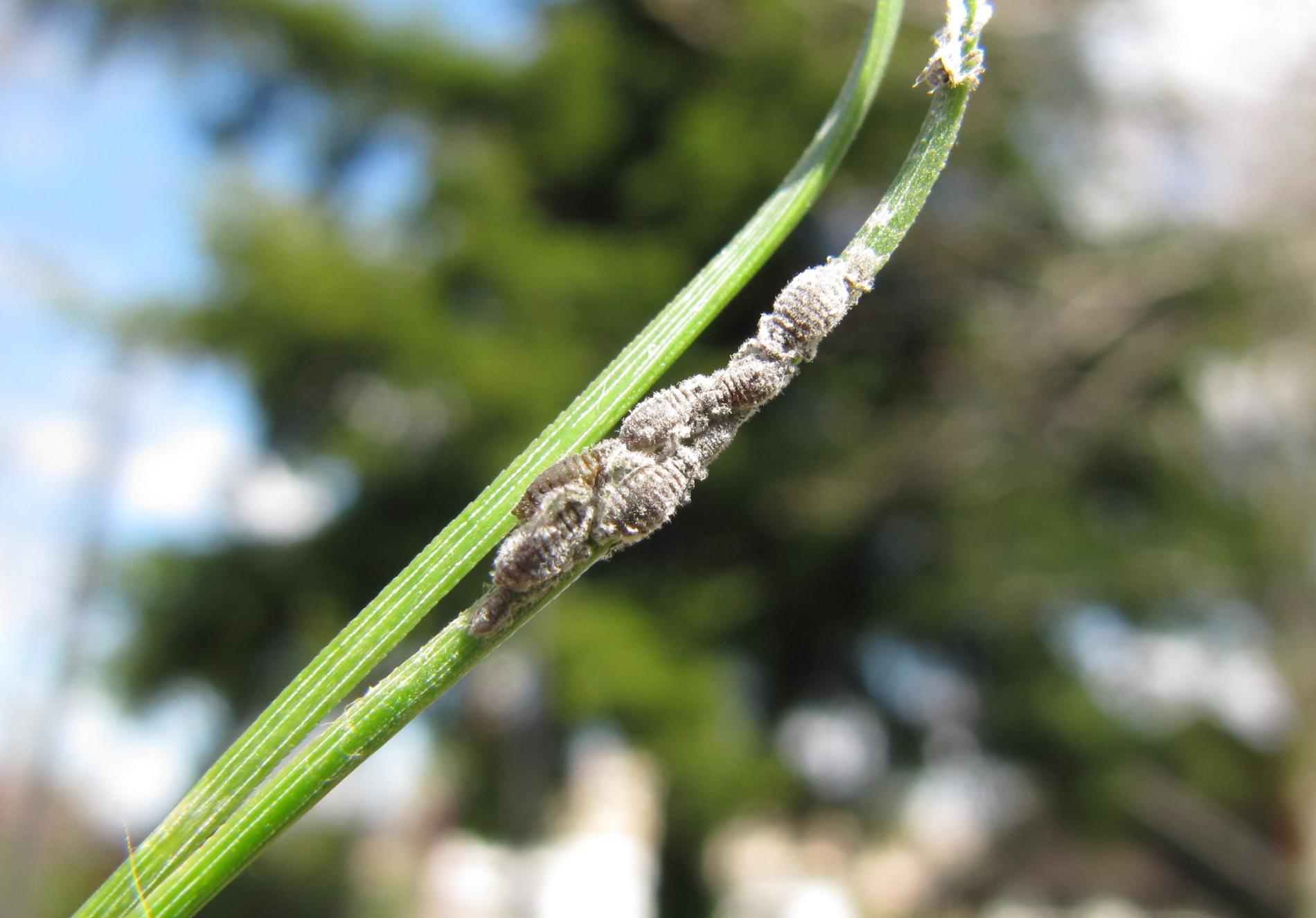 Veľmi hojná, sivá voška, ktorá žije v malých kolóniách na ihliciach. Vošky sú usporiadané v rade za sebou a sú pokryté sivastým, voskovitým povlakom. Cicaním oslabujú stromy a tvorbou živice môže spôsobovať upchávanie prieduchov nečistotami.