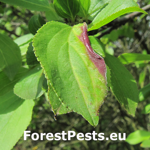 Okraje listov Rhamnus cathartica sú zvinuté smerom nahor, zhrubnuté a môžu prechádzať zo zelenej farby na žltú alebo červenkastú. Spodná strana napadnutých listov je často husto chlpatá.