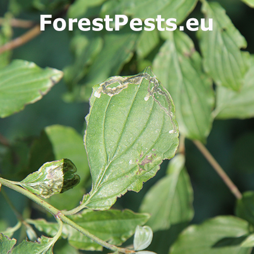 Larvy vytvárajú serpentínové míny na hornej strane listov.