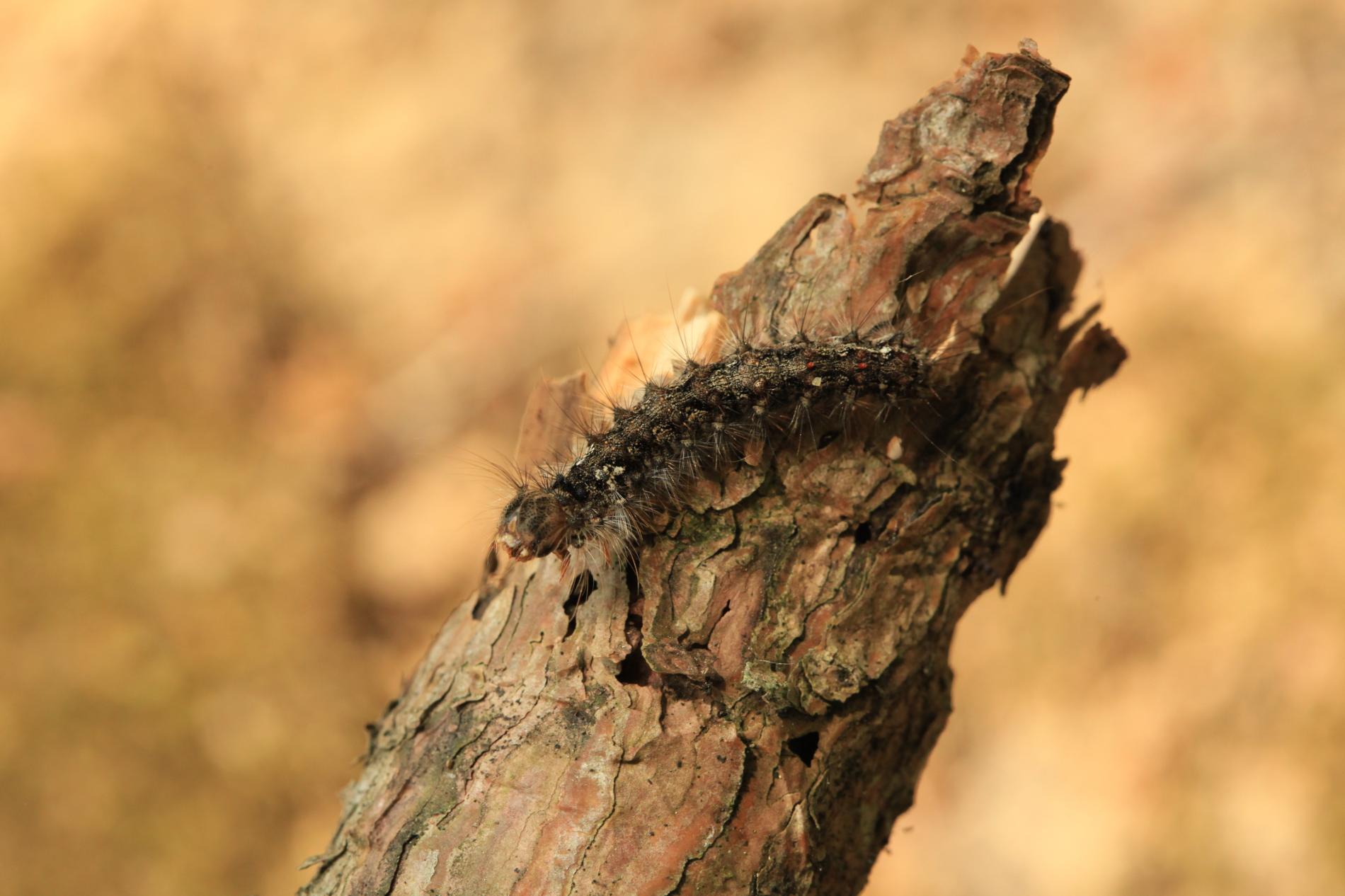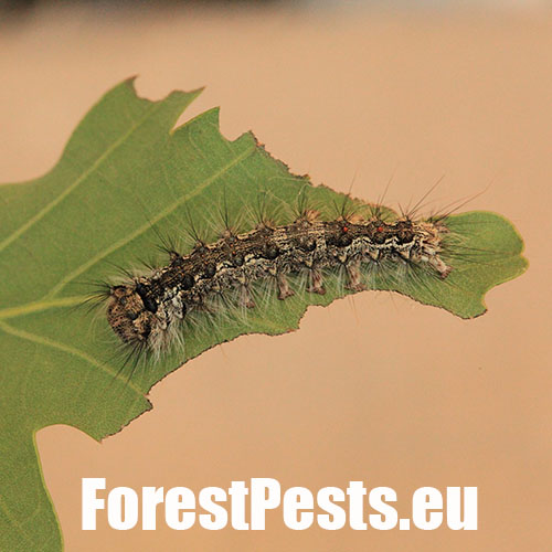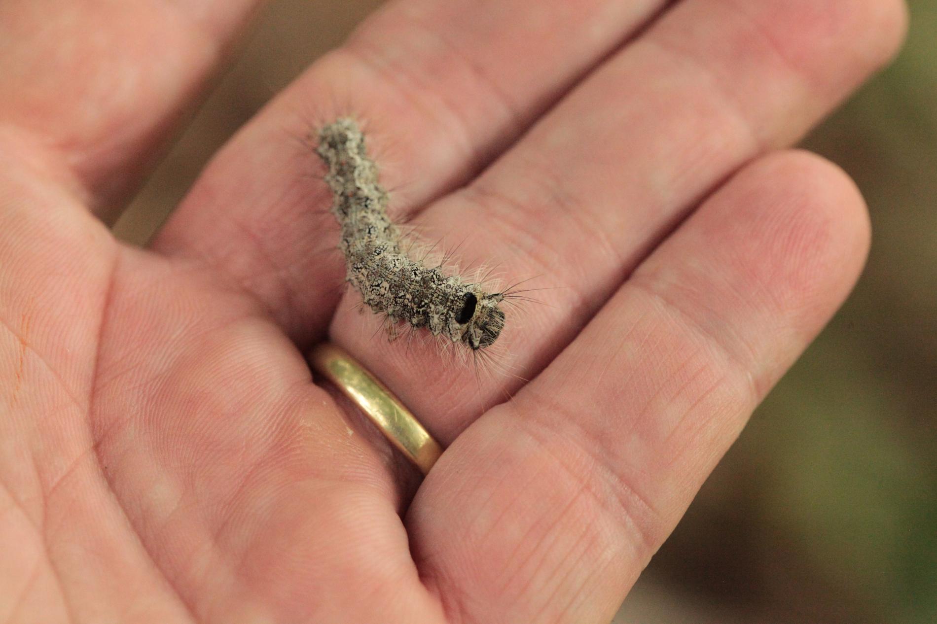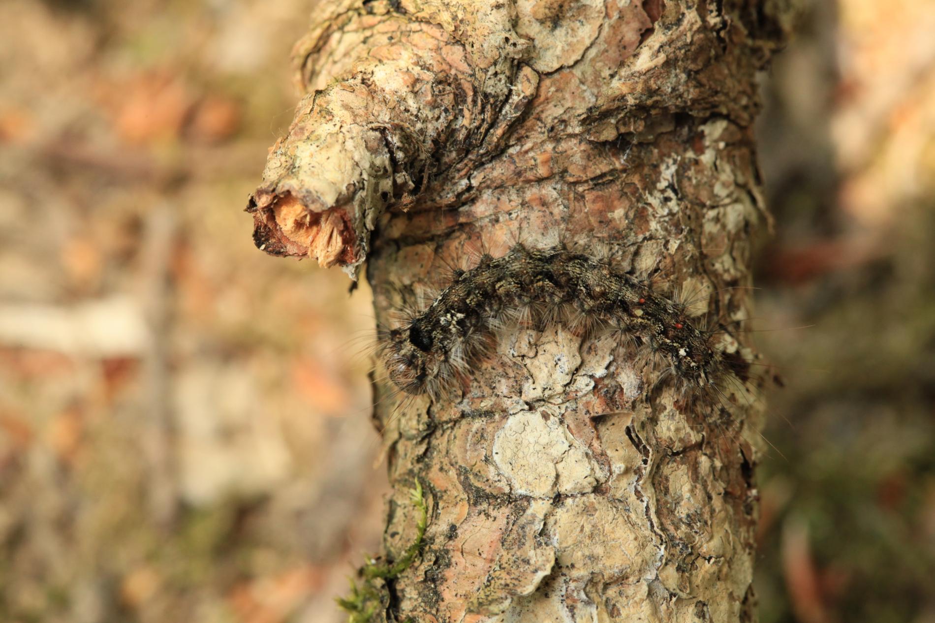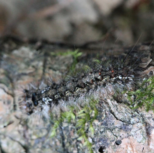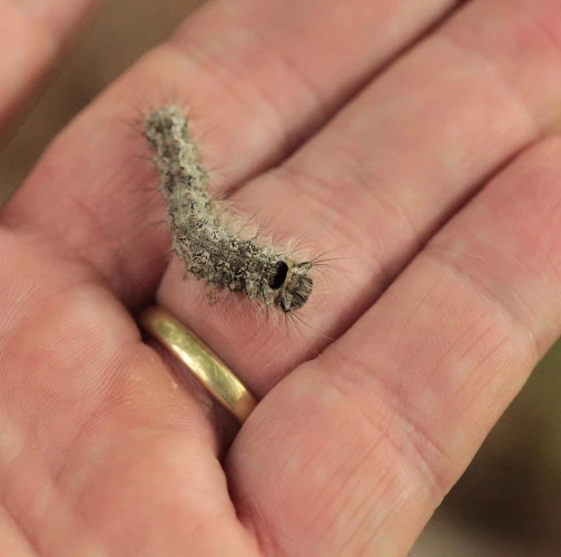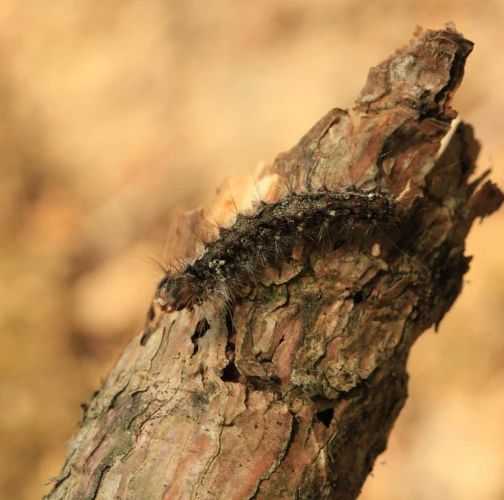 Sivá, chlpatá húsenica. Žer na ihliciach.