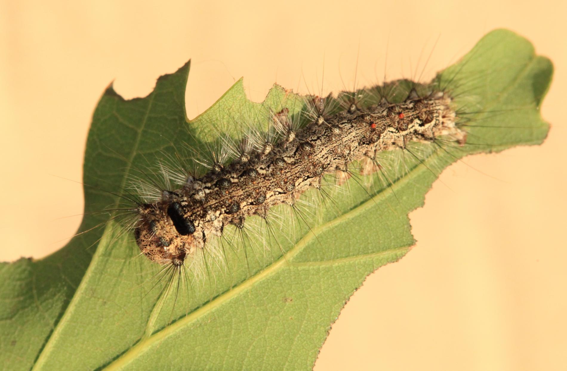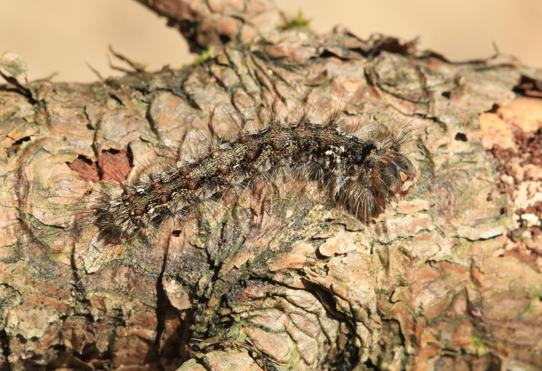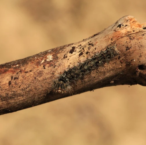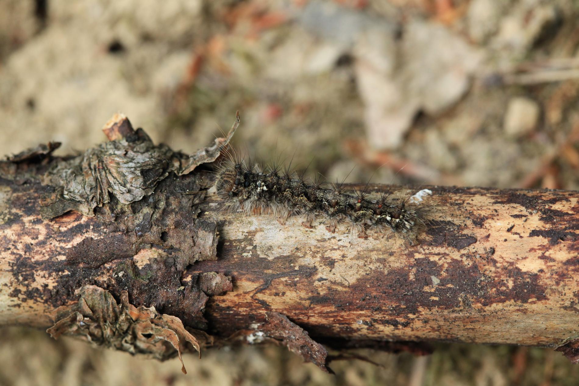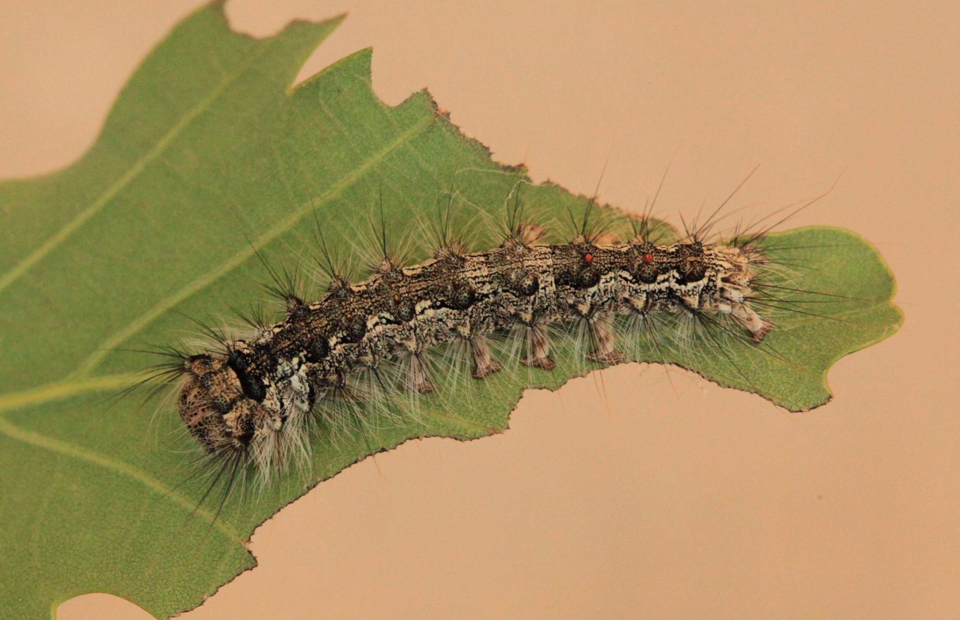 Sivá, chlpatá húsenica. Žer na ihliciach.