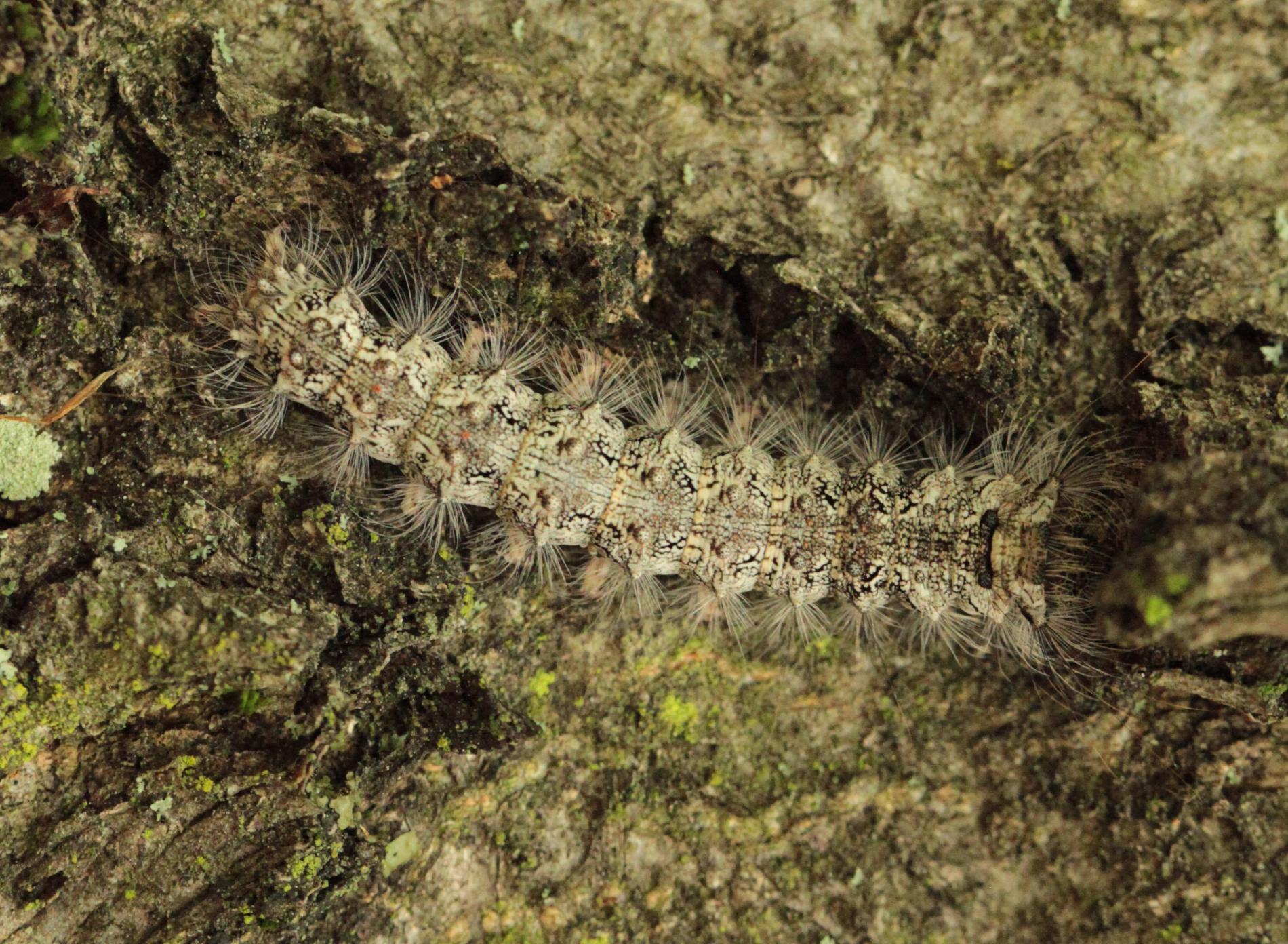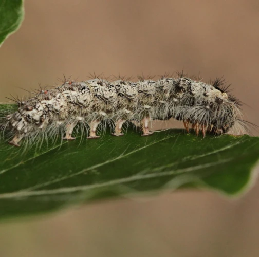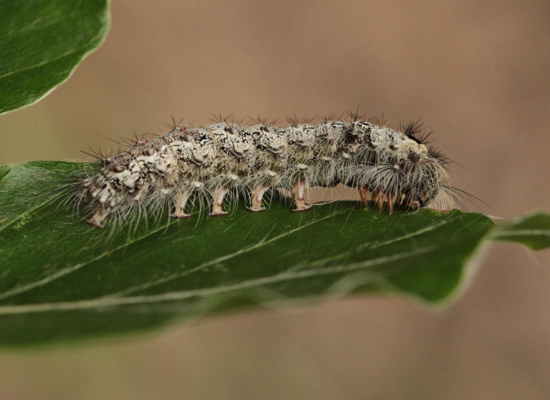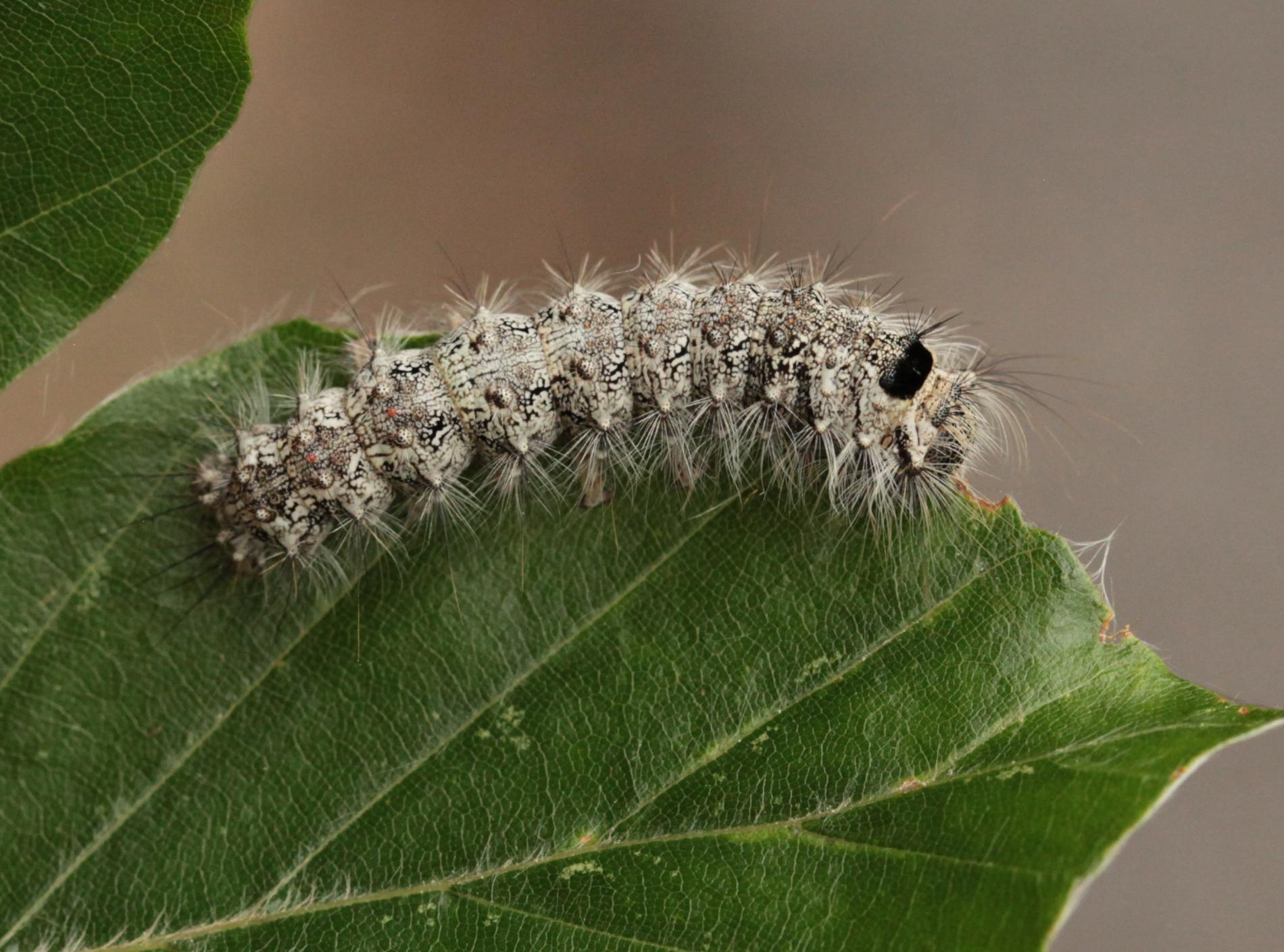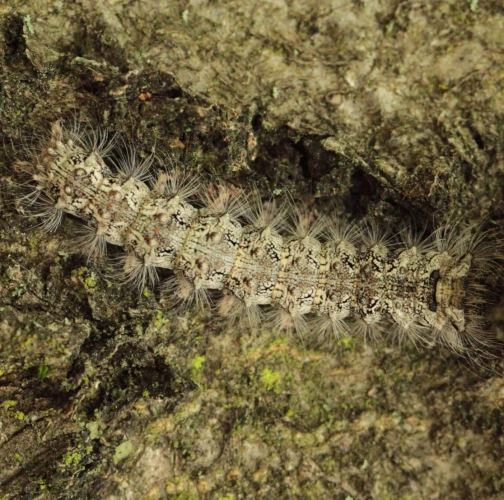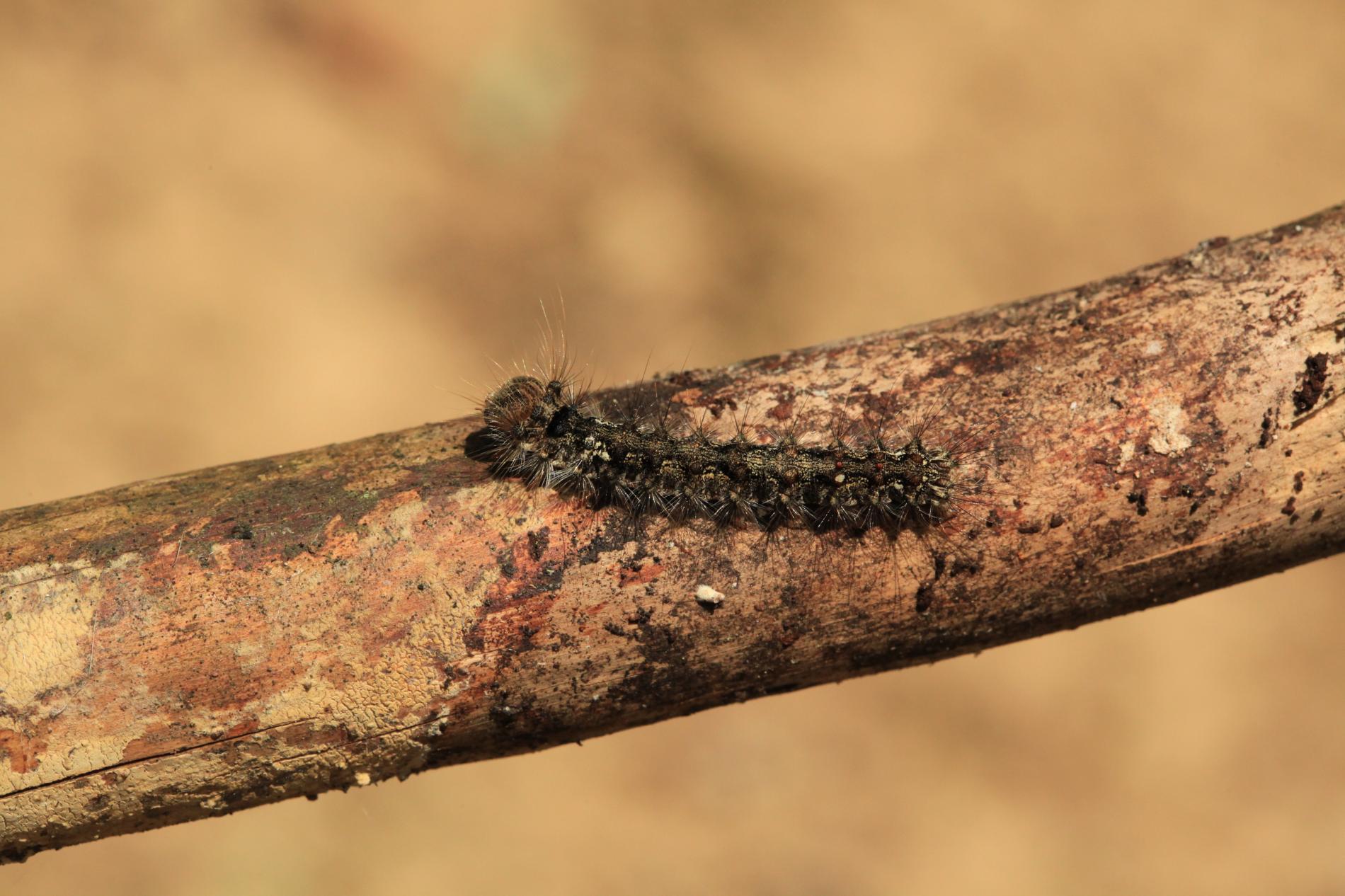 Sivá, chlpatá húsenica. Žer na ihliciach.