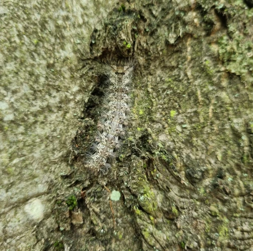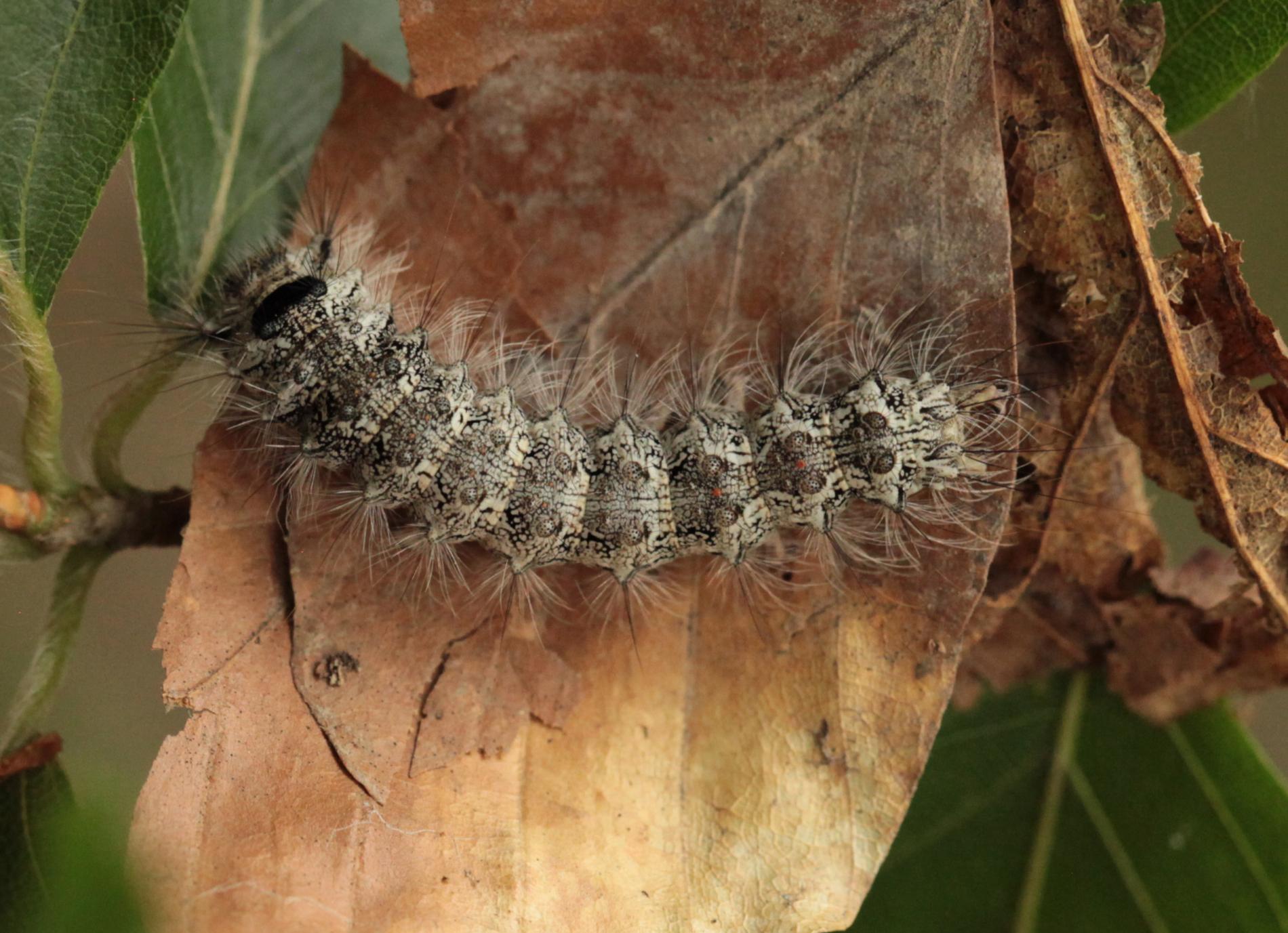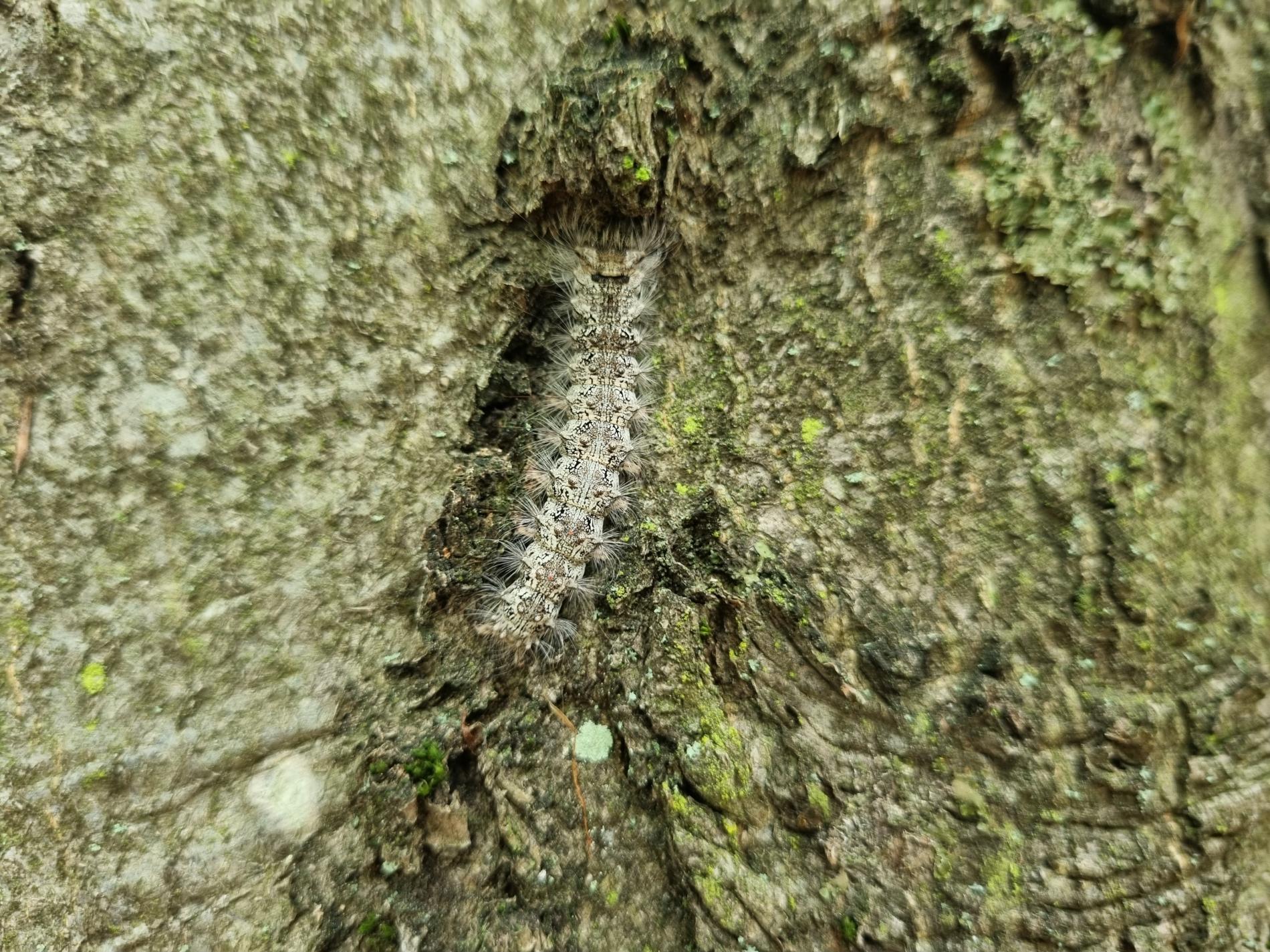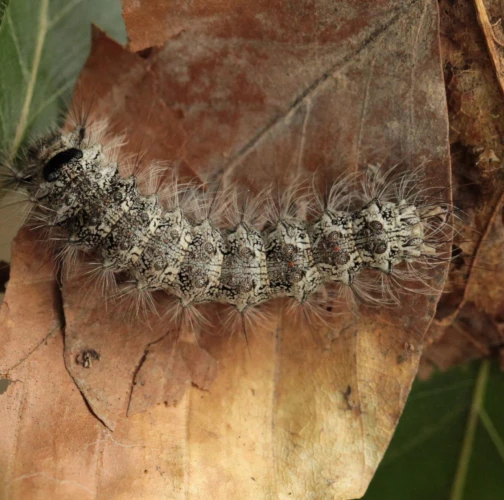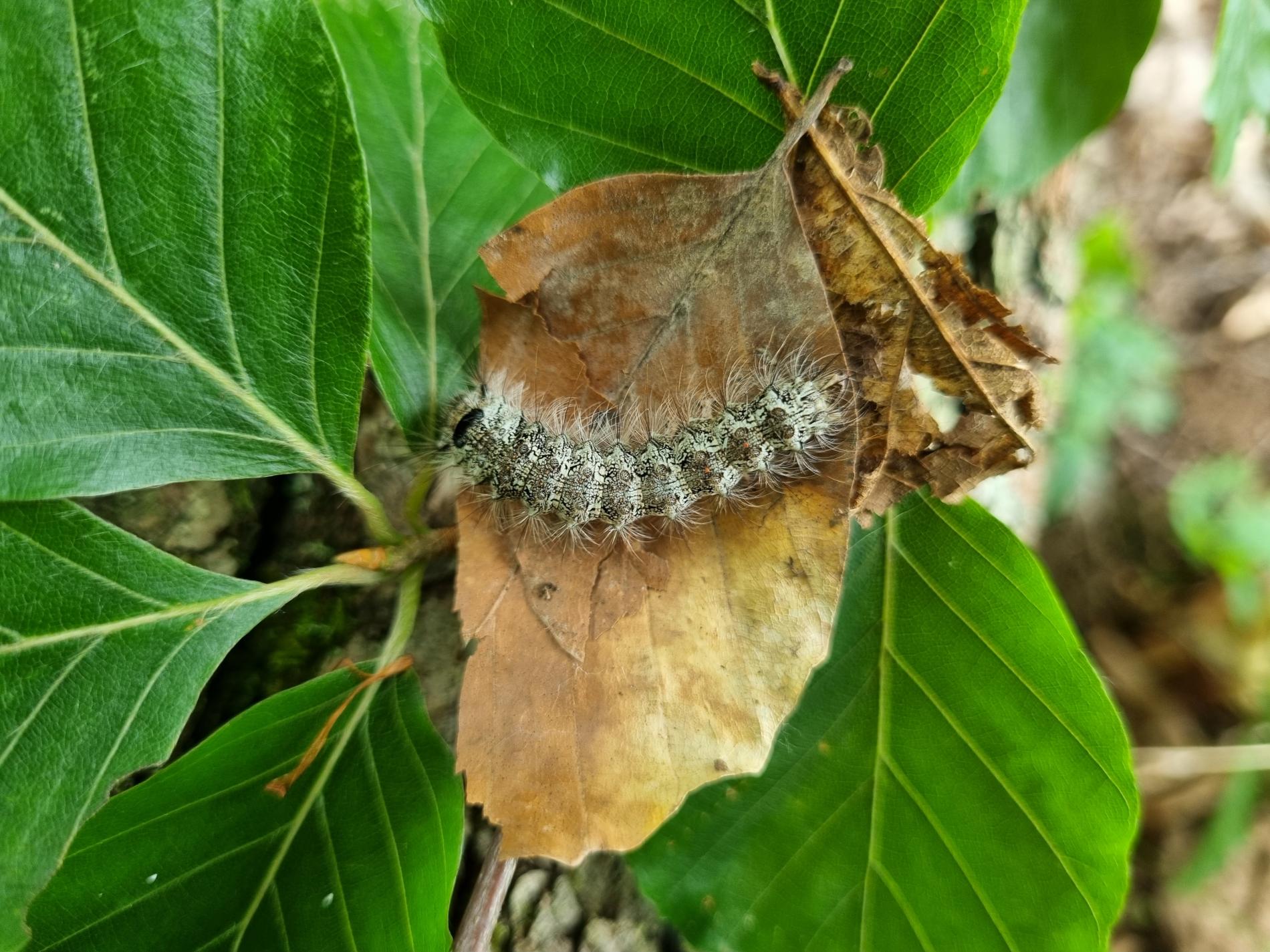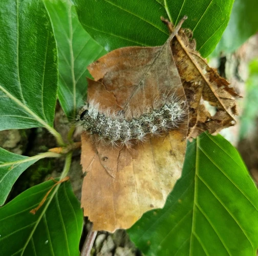 Sivá, chlpatá húsenica. Žer na ihliciach.