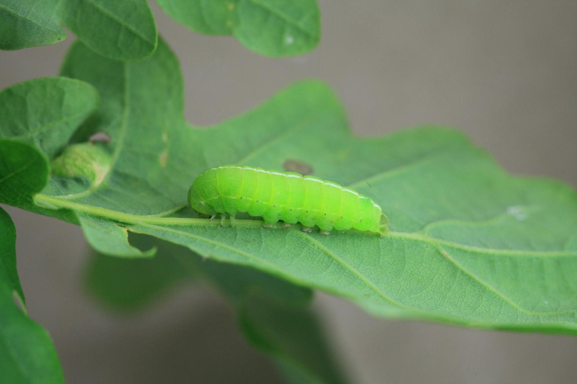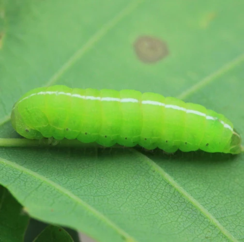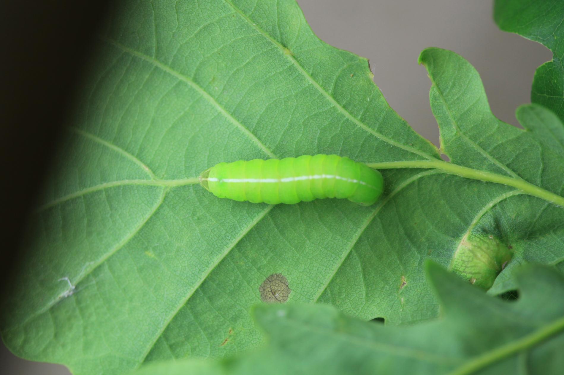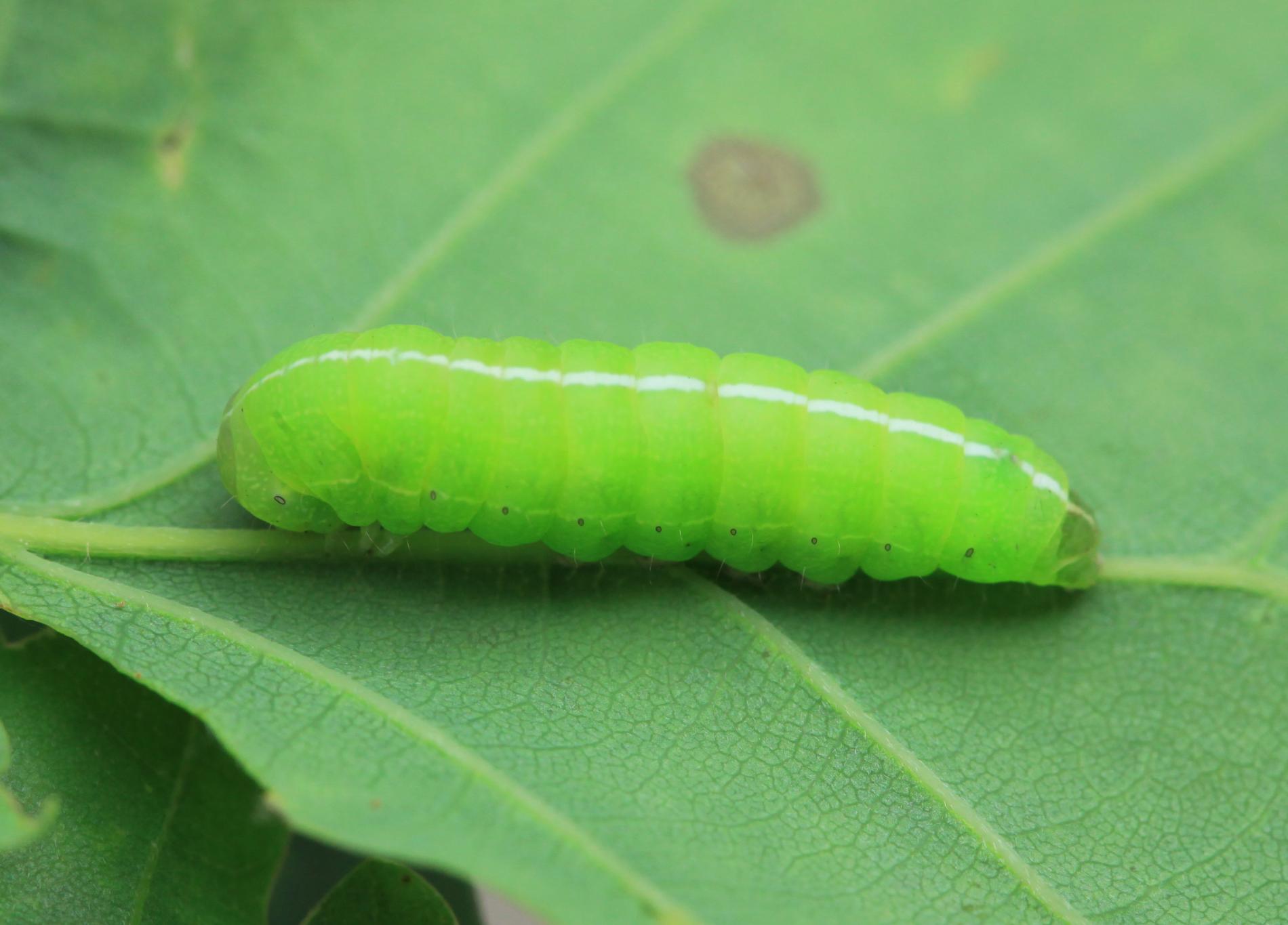 Húsenica je svetlo žlto zelená až zelená s bielym pozdĺžnym pásom na chrbte a s dvomi menej výraznými pásmi po stranách.