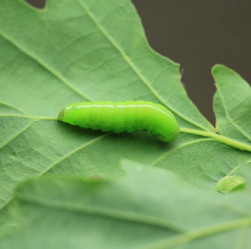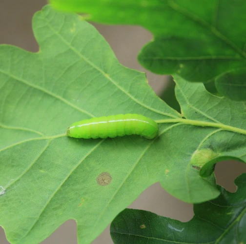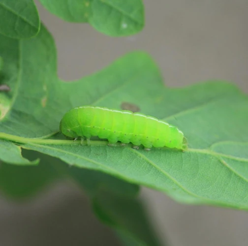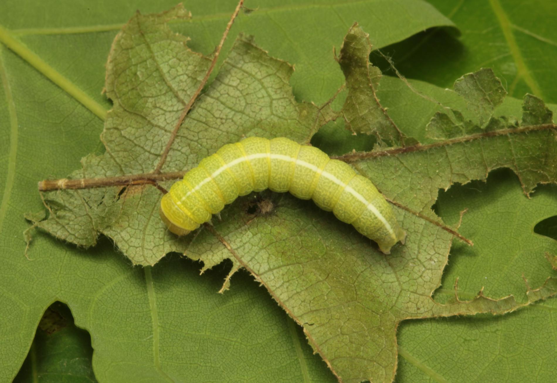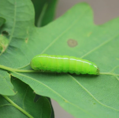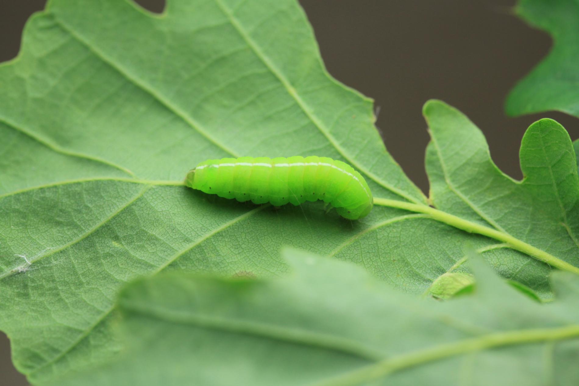 Húsenica je svetlo žlto zelená až zelená s bielym pozdĺžnym pásom na chrbte a s dvomi menej výraznými pásmi po stranách.