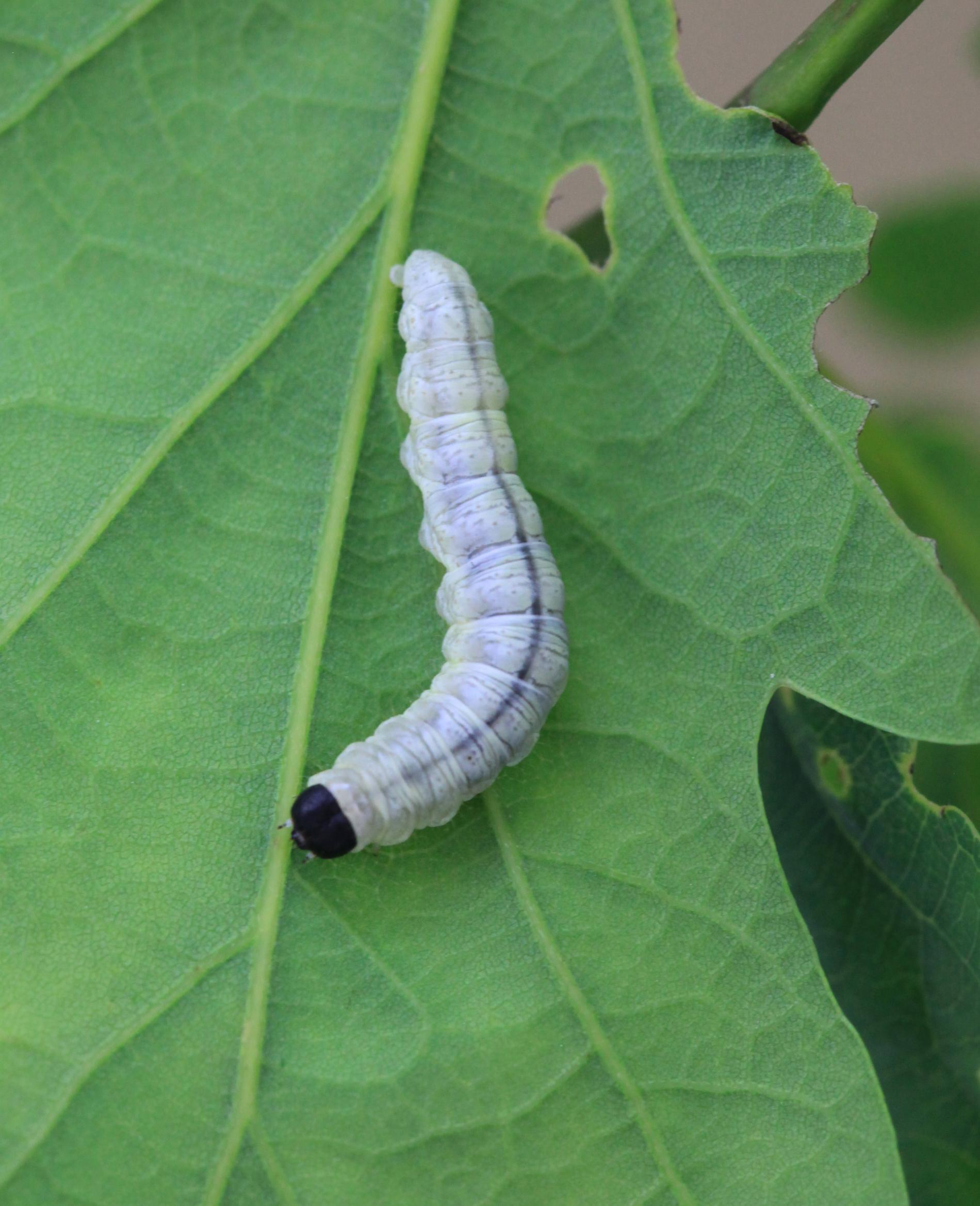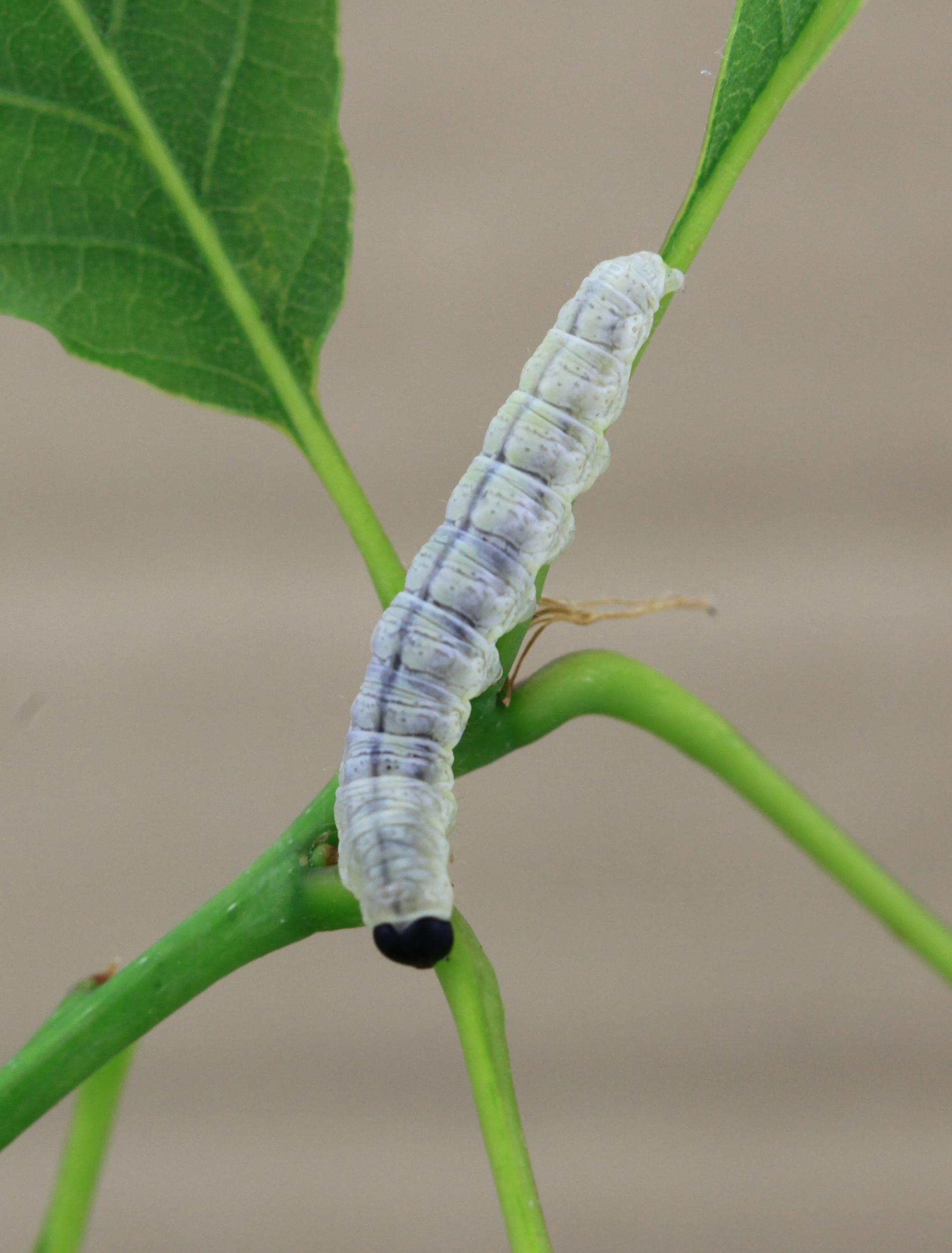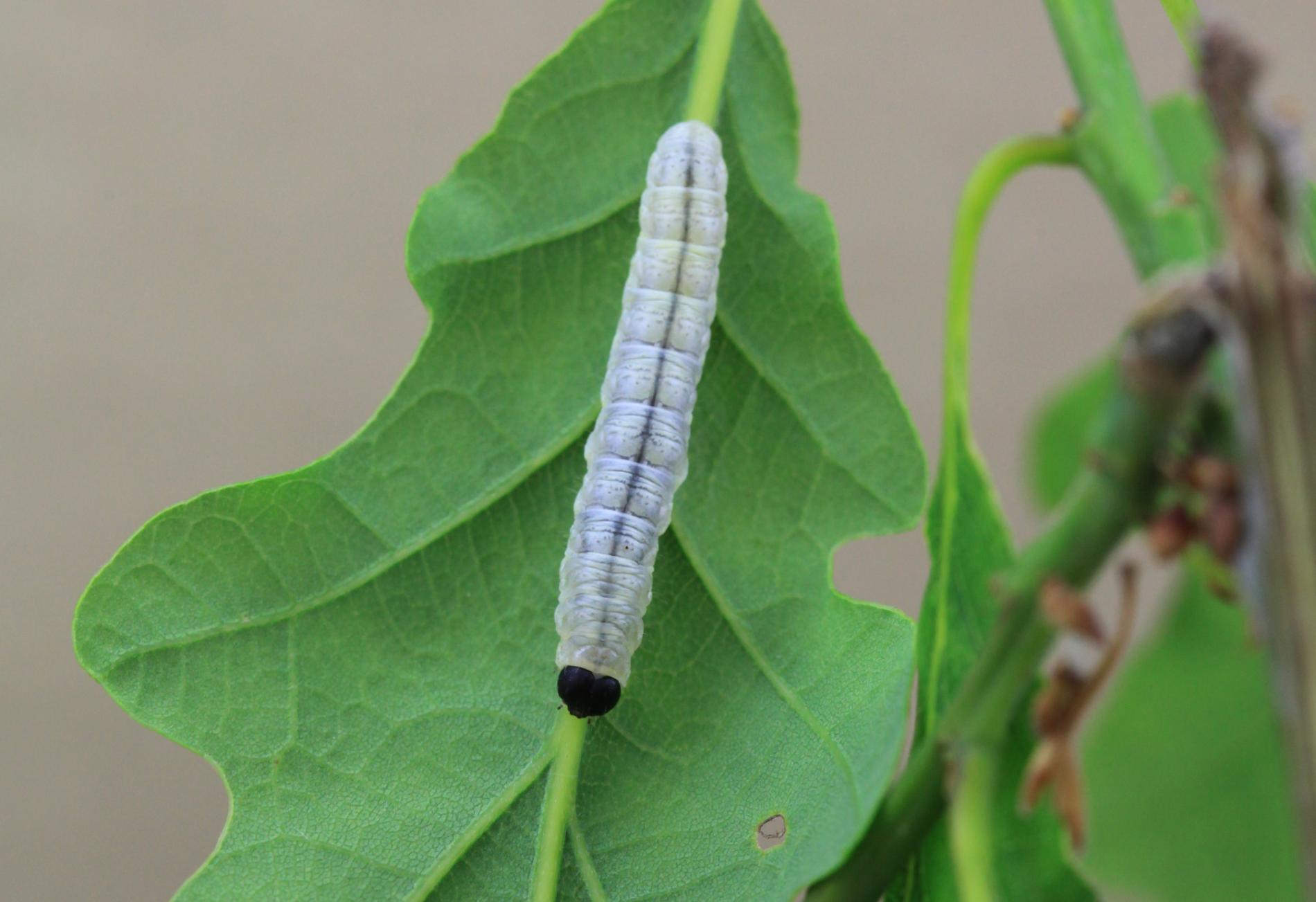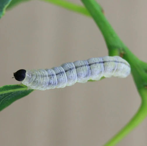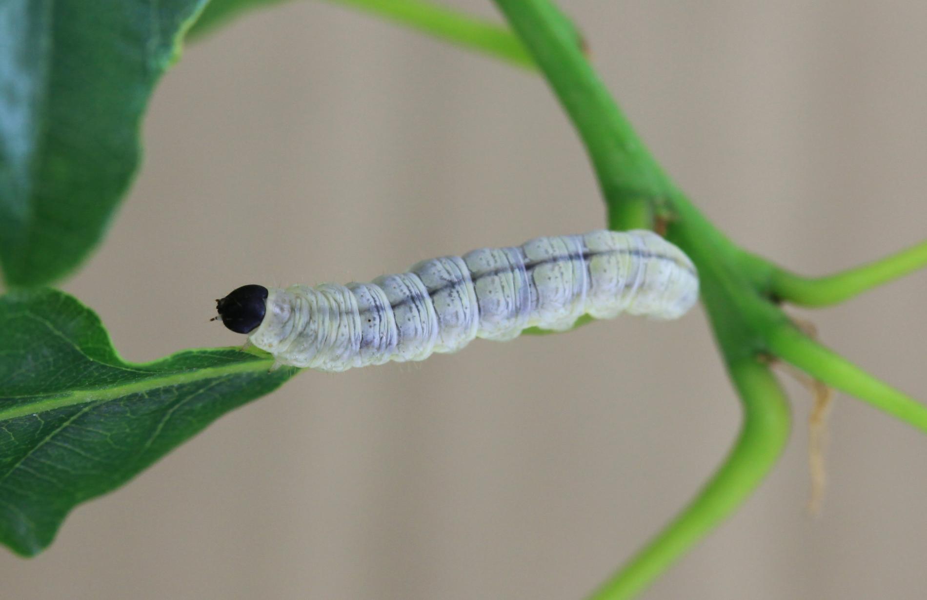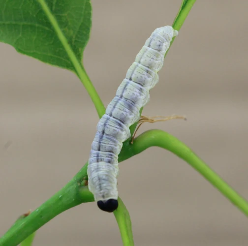 Húsenica je žlto zelená s výraznou čiernou hlavou.