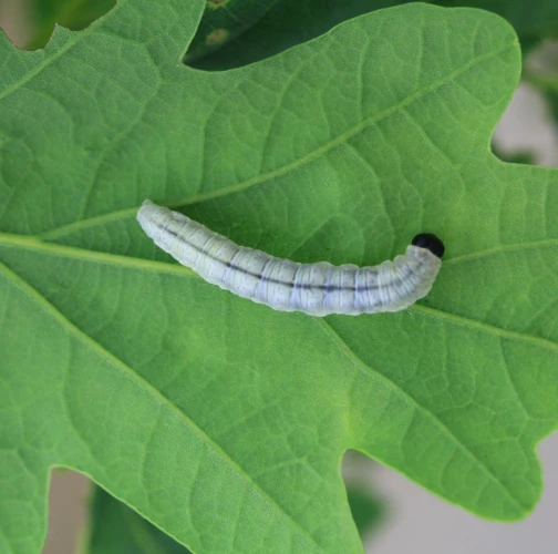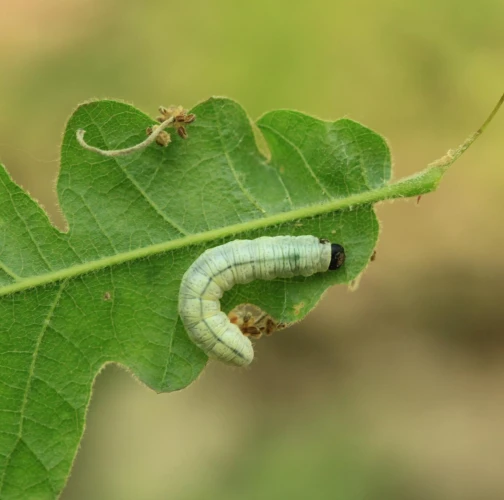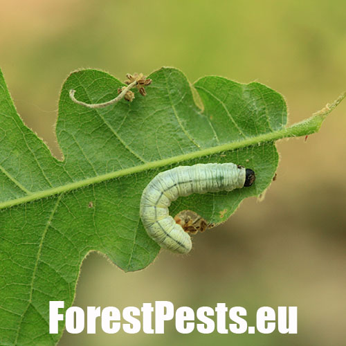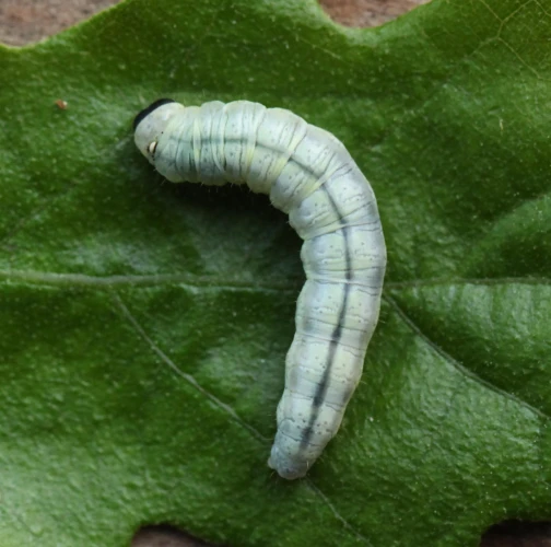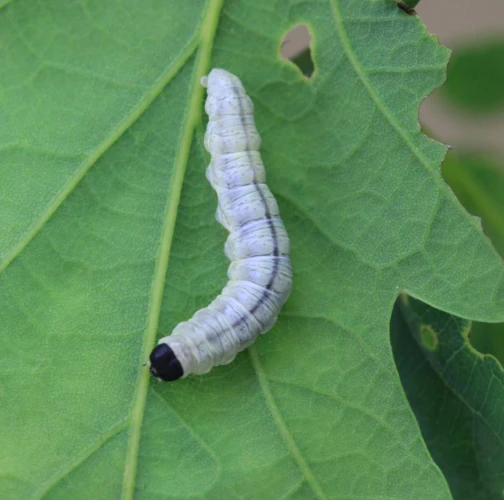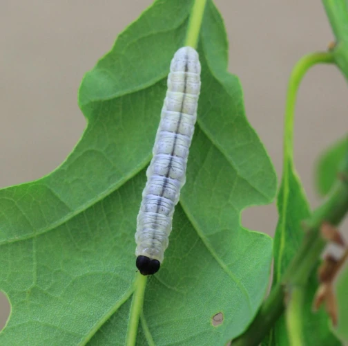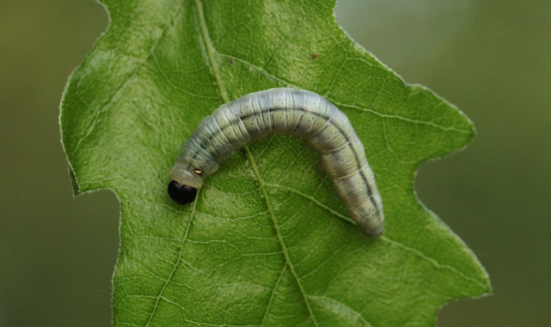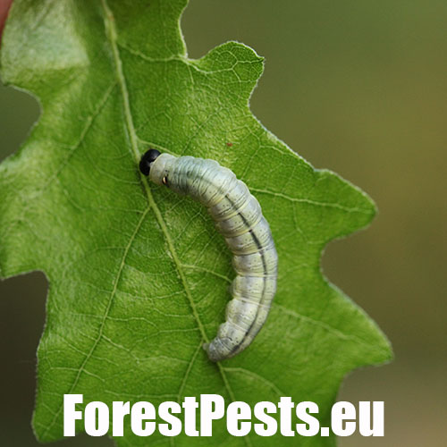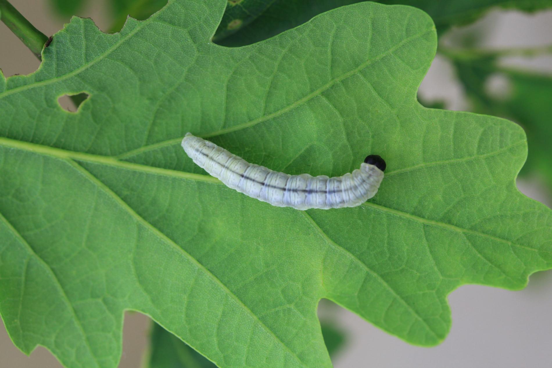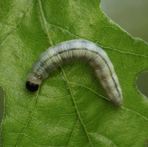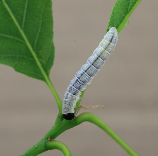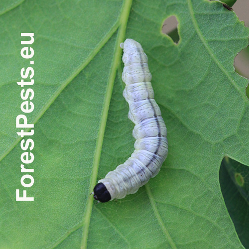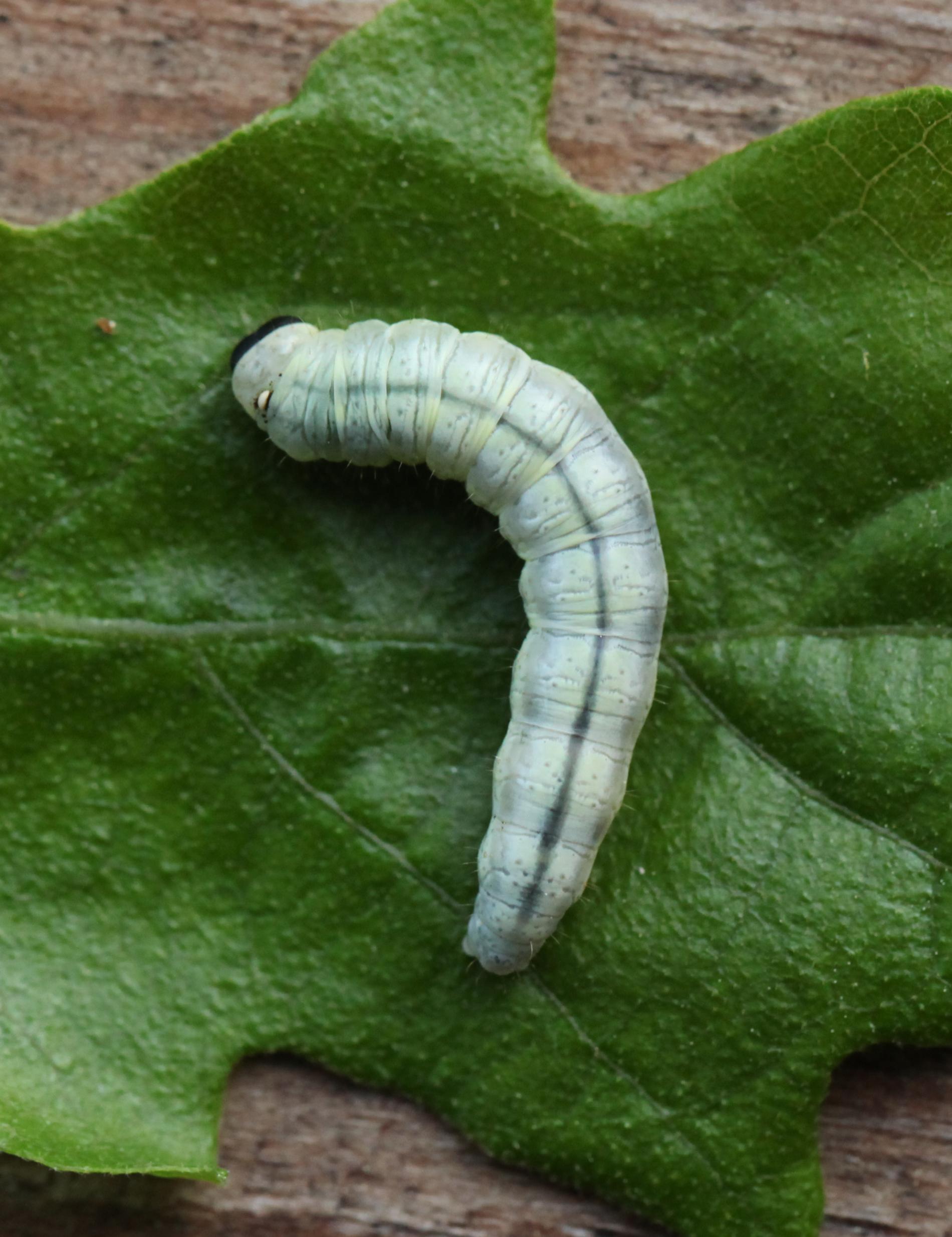 Húsenica je žlto zelená s výraznou čiernou hlavou.