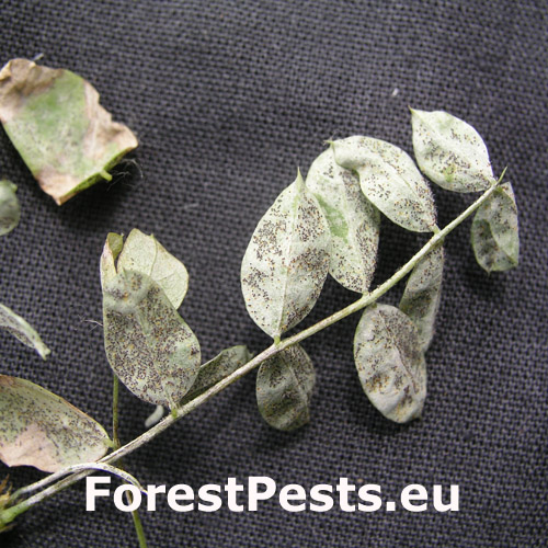Biele epifytické mycélium a konídie sú prítomné na oboch stranách listov a mladých výhonkov, pričom vytvárajú kolónie nepravidelného tvaru, tie sa časom spájajú a pokrývajú celý list. Žltooranžové a čierne kleistotéciá sa začínajú na listoch objavovať už od polovice júna. V prípade silnej infekcie listy odumierajú a výhonky deformujú. Huba je inváznym druhom pôvodom v Ázii a od polovice 90. rokov 20 st. je postupne zisťovaná v európskych štátoch. V roku 2005 bola prvýkrát zistená aj na Slovensku, na listoch karagany stromovitej v mestskej zeleni v Banskej Štiavnici