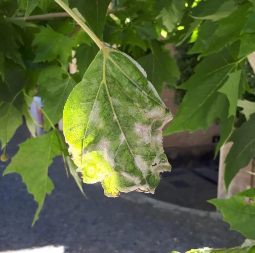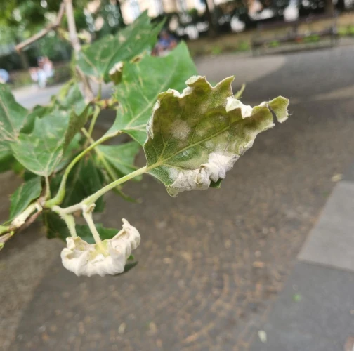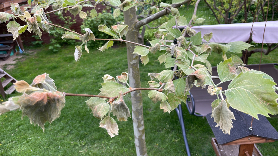 Biele povlaky a následné deformácie na listoch ako aj na iných častiach platanov.