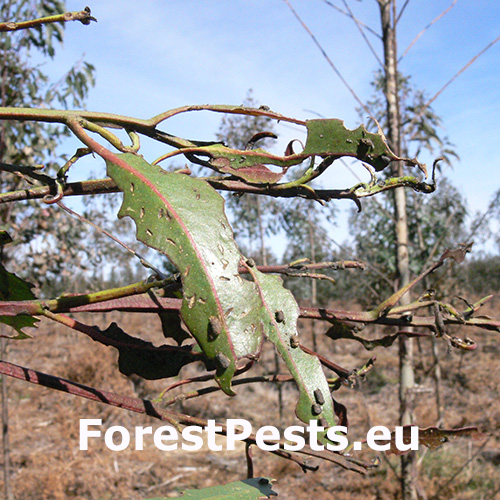 Najvýraznejším príznakom výskytu Gonipterus scutellatus je strata listov. Chrobáky a larvy konzumujú listy, čo spôsobuje, že stromy majú riedke alebo úplne holé konáre. Dospelé chrobáky majú charakteristický tvar tela a živia sa tiež listami - vytvárajú v listoch nepravidelné diery a zárezy. Larvy tiež poškodzujú listy, čím spôsobujú ďalšie škody. Dlhodobá strata a opadávanie listov môže viesť k zakrpatenému rastu a oslabeným stromom, ktoré sú náchylnejšie na ďalšie stresy a choroby.