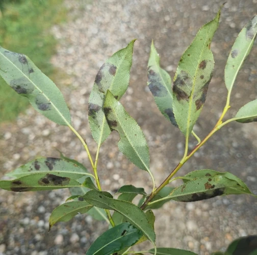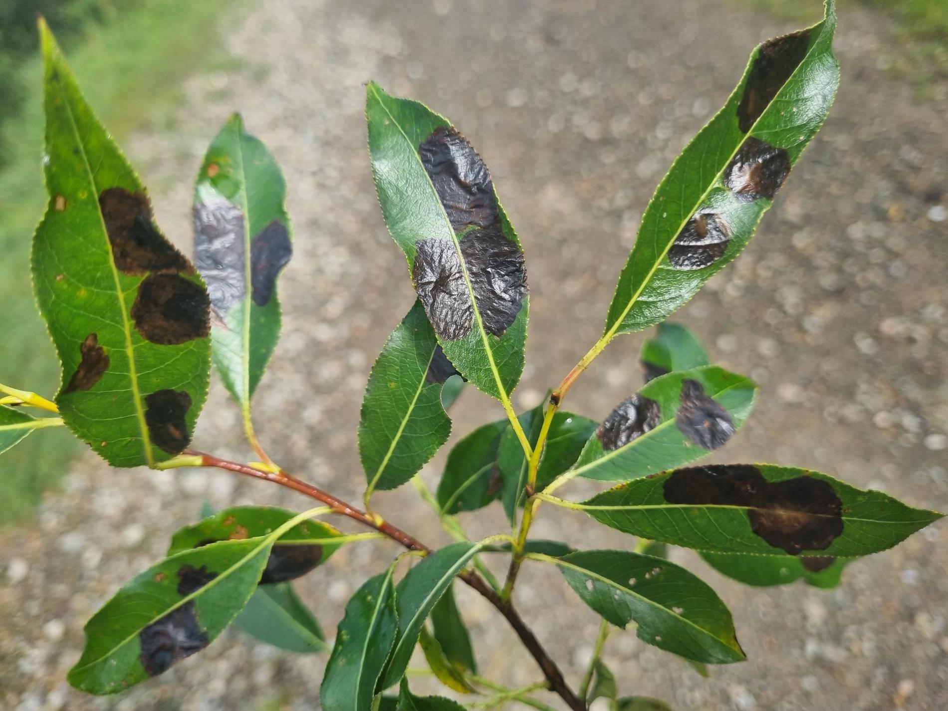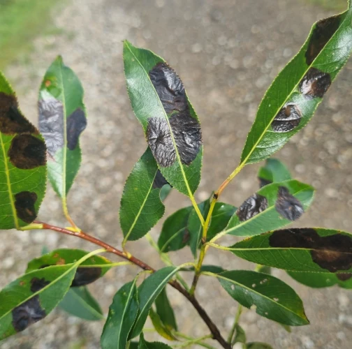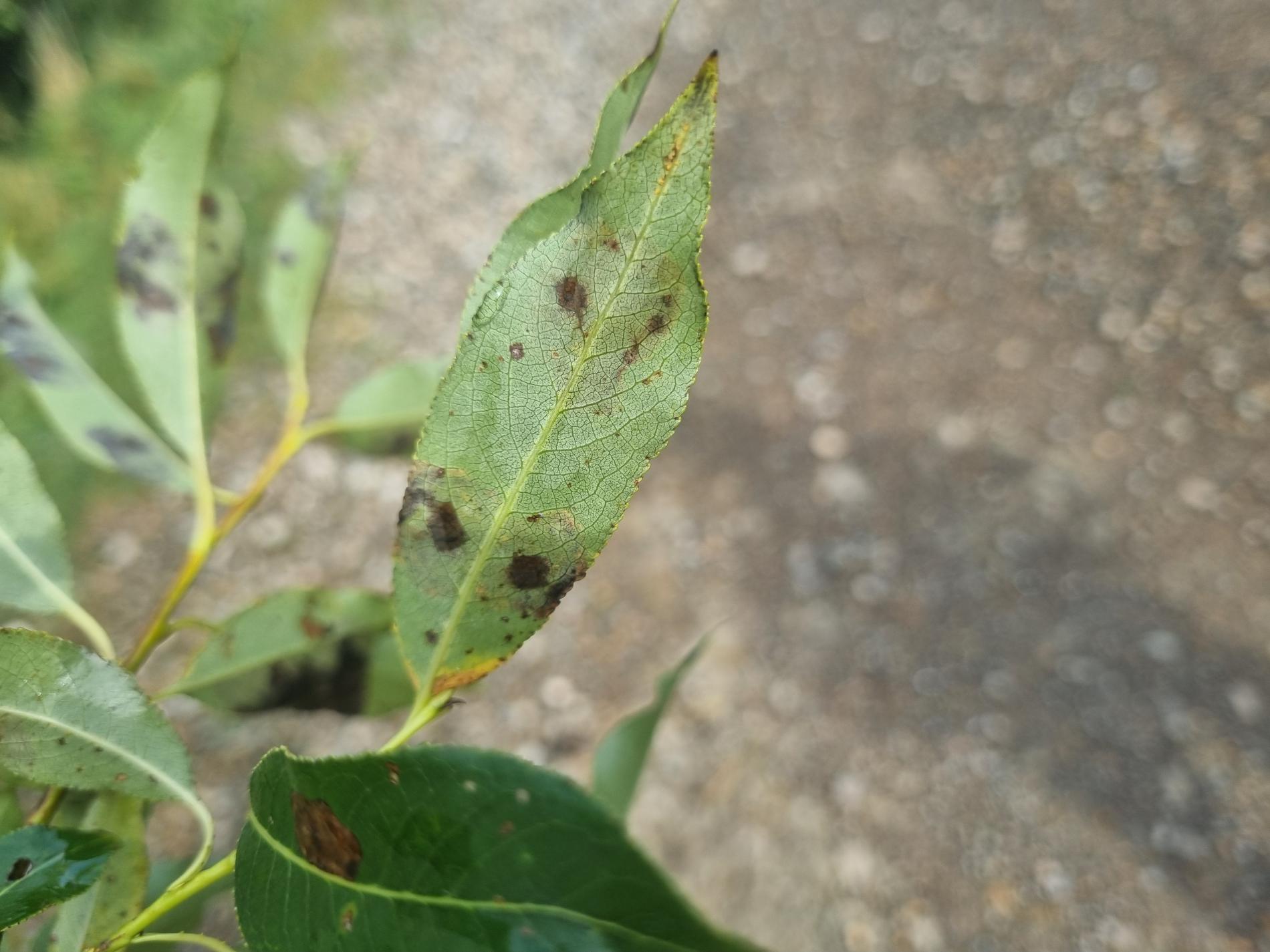 Na listoch sú hnedé škvrnité míny, často viaceré na jednom liste; pri silnejšom výskyte sa škvrny spájajú do väčších plôch.