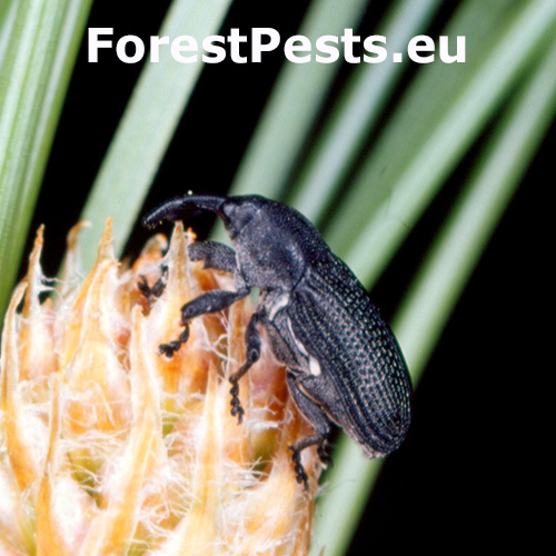 Poškodenie ihličia s viditeľnými stopami obhrýzania a občasným odumieraním vetvičiek. Ihlice sú často obžraté zo strán, niekedy sú čiastočne hnedé alebo úplne chýbajú. Medzi ihličím sa niekedy dajú nájsť čierne imága.