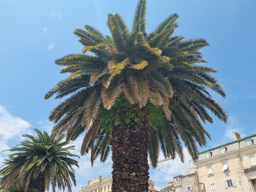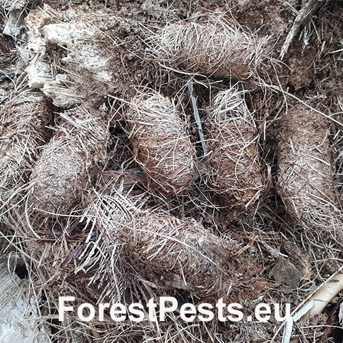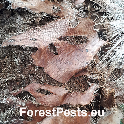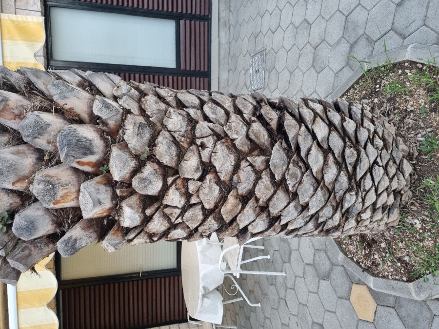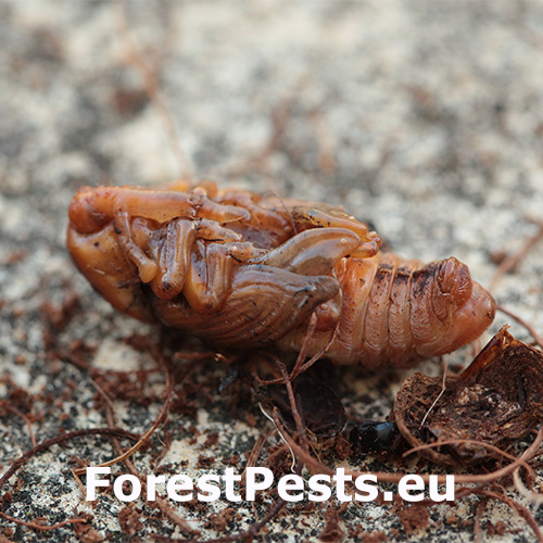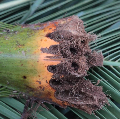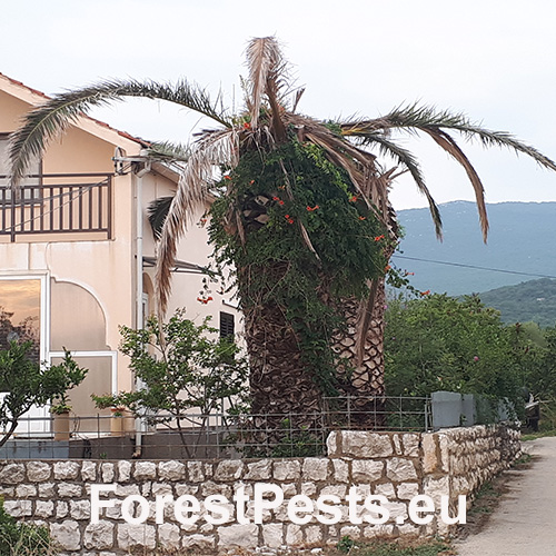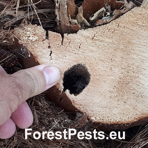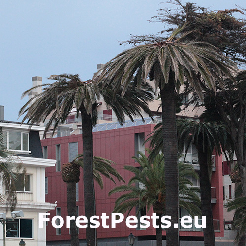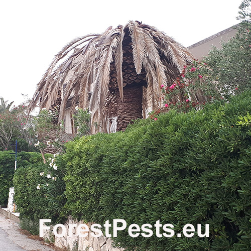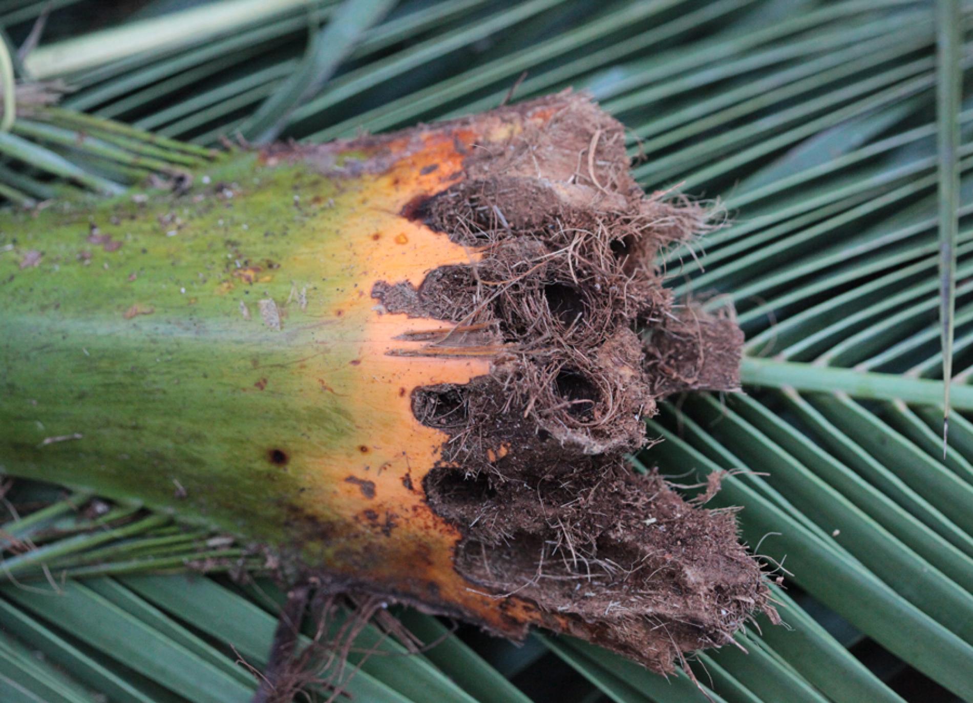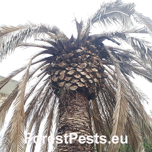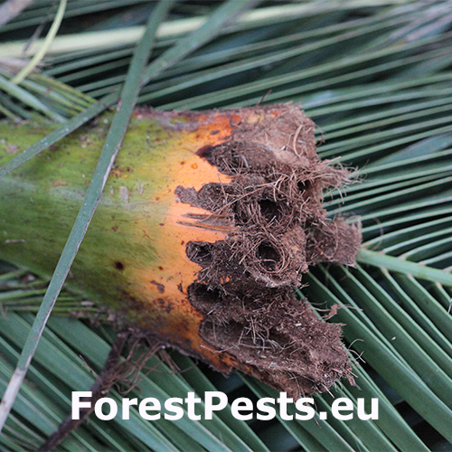 Napadnuté palmy najskôr strácajú zelenú farbu a farba listov sa mení na zeleno sivú. Listy schnú a palma postupne hynie. Na kmeňoch sú viditeľné veľké otvory, prítomnosť tohto druhu prezrádzajú niekedy aj uhynuté imága v okolí kmeňa lebo zámotky, v ktorých je ukrytá kukla, veľké cca 5 cm.