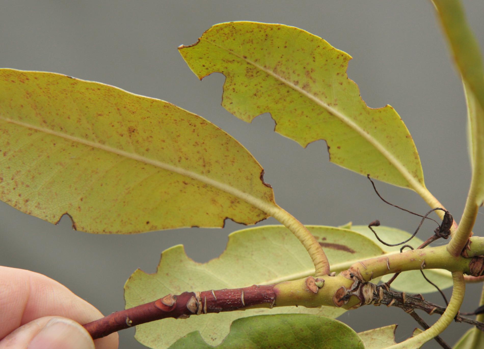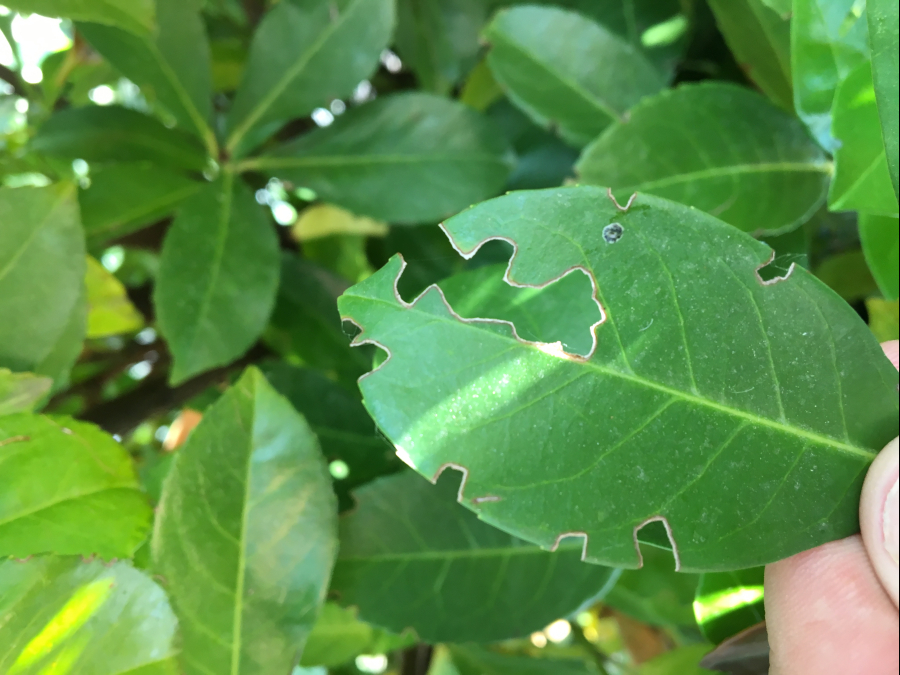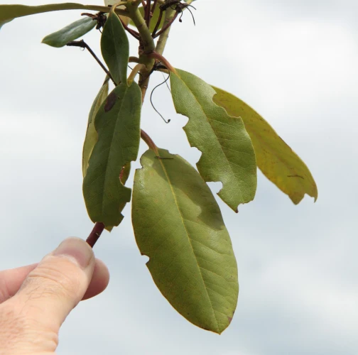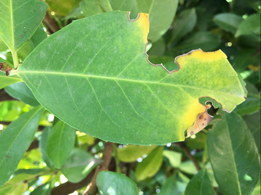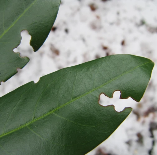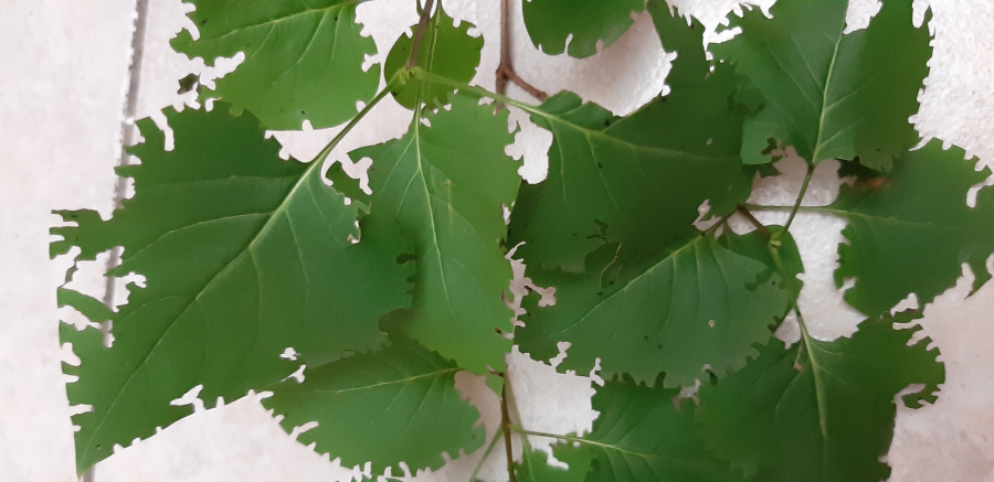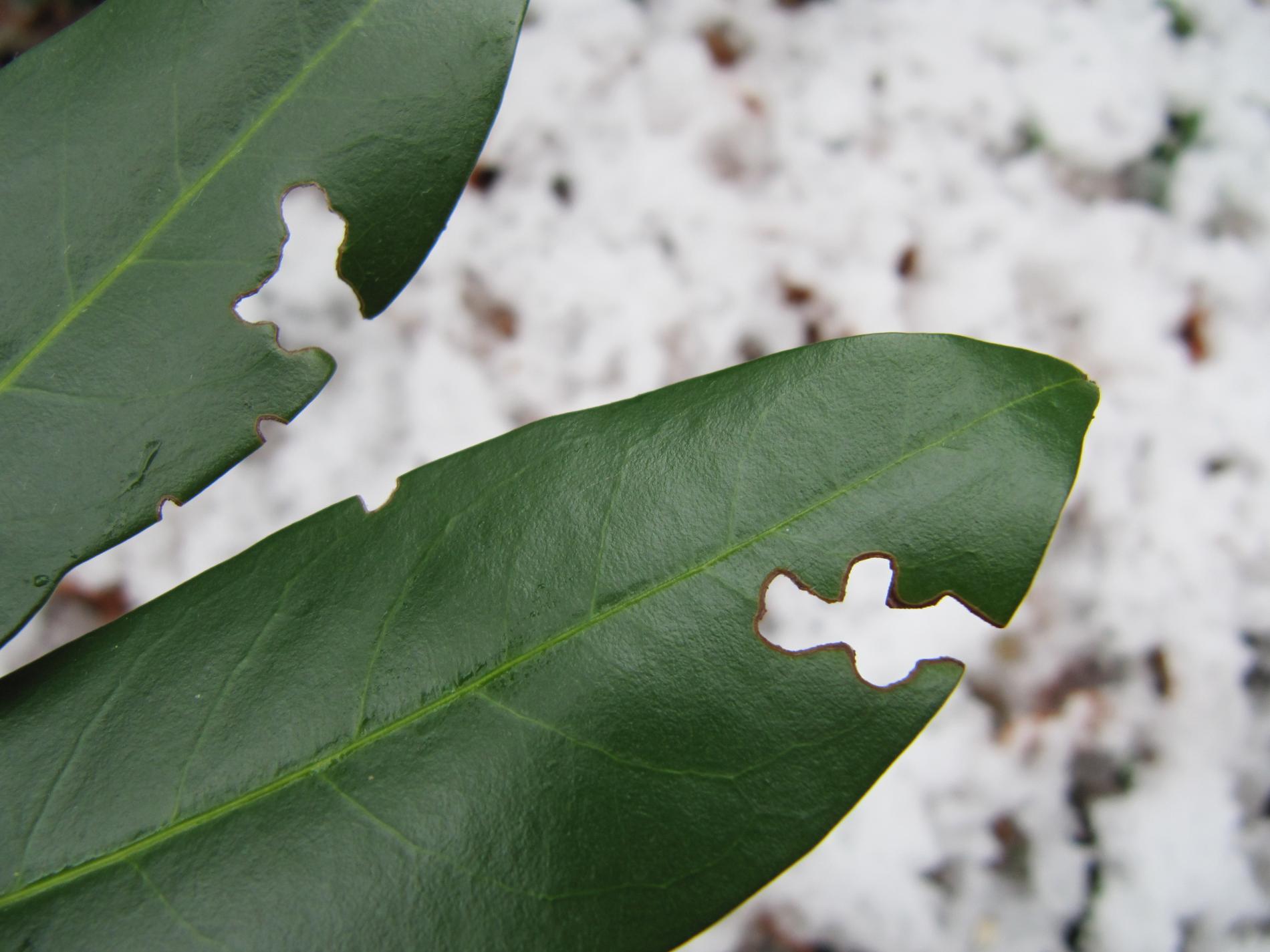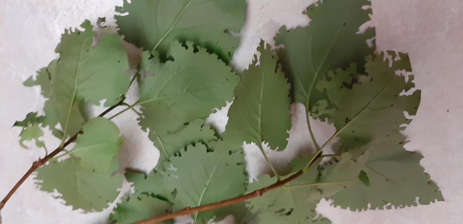Okraje listov poškodené zrelostným žerom do tvaru písmena C.