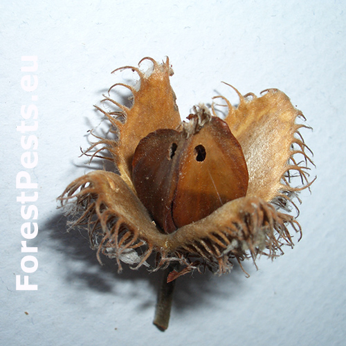 Napadnutie sa prejavuje dutými bukvicami, často naplnenými trusom, s okrúhlymi otvormi na povrchu bukvice.