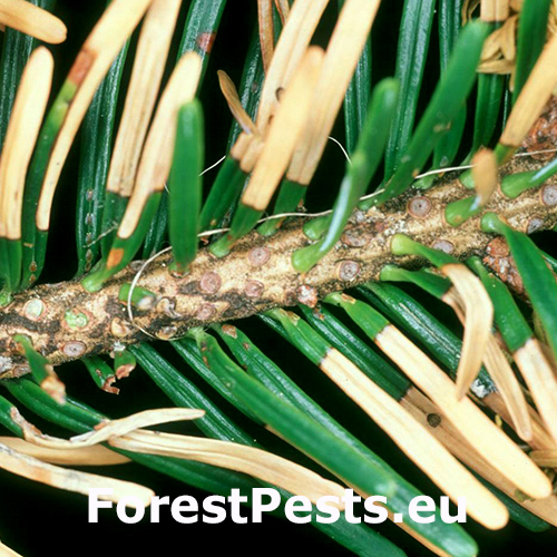 Vyžraté ihlice s chodbičkami vo vnútri, hnednutie ihličia a duté ihlice.