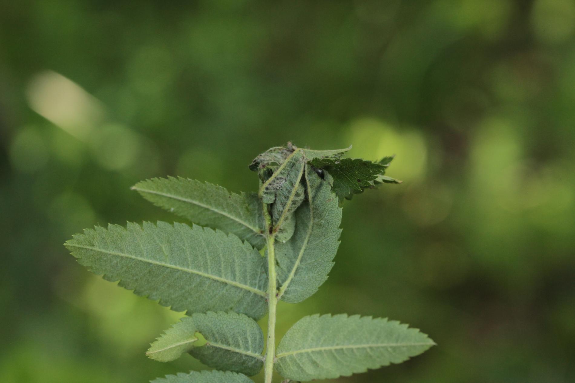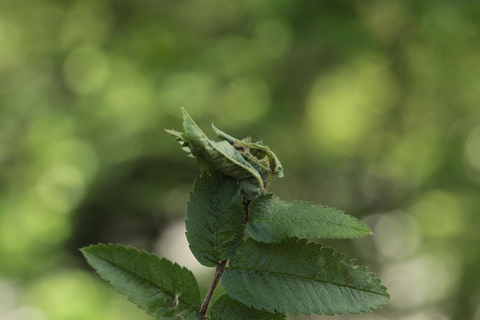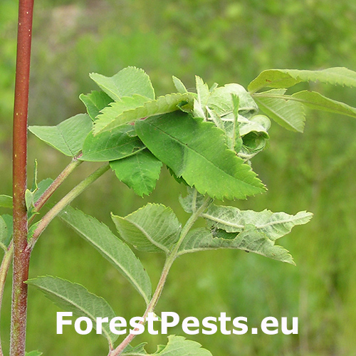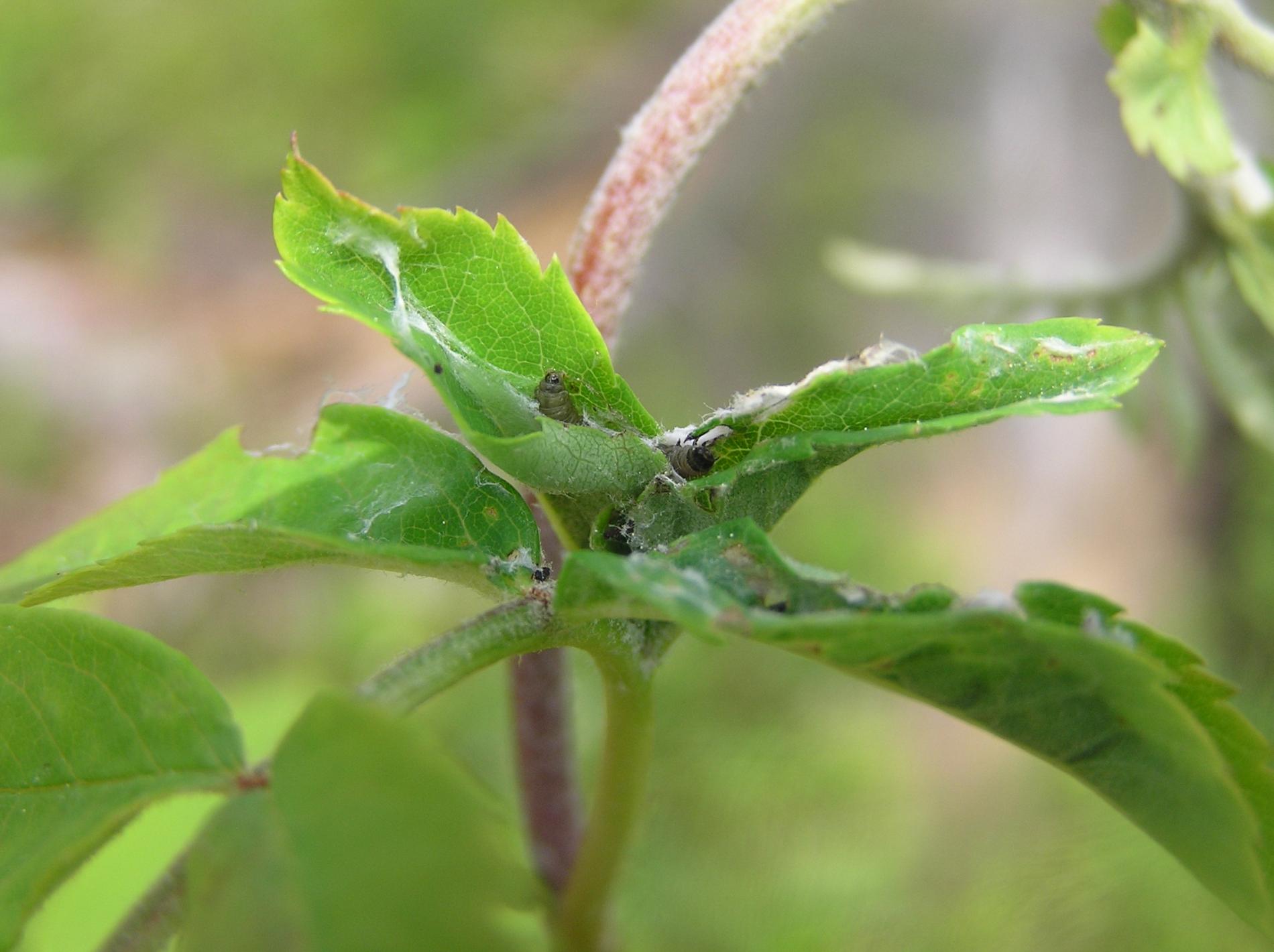 Stočené a spradené listy, larvy nachádzajúce sa vo vnútri.