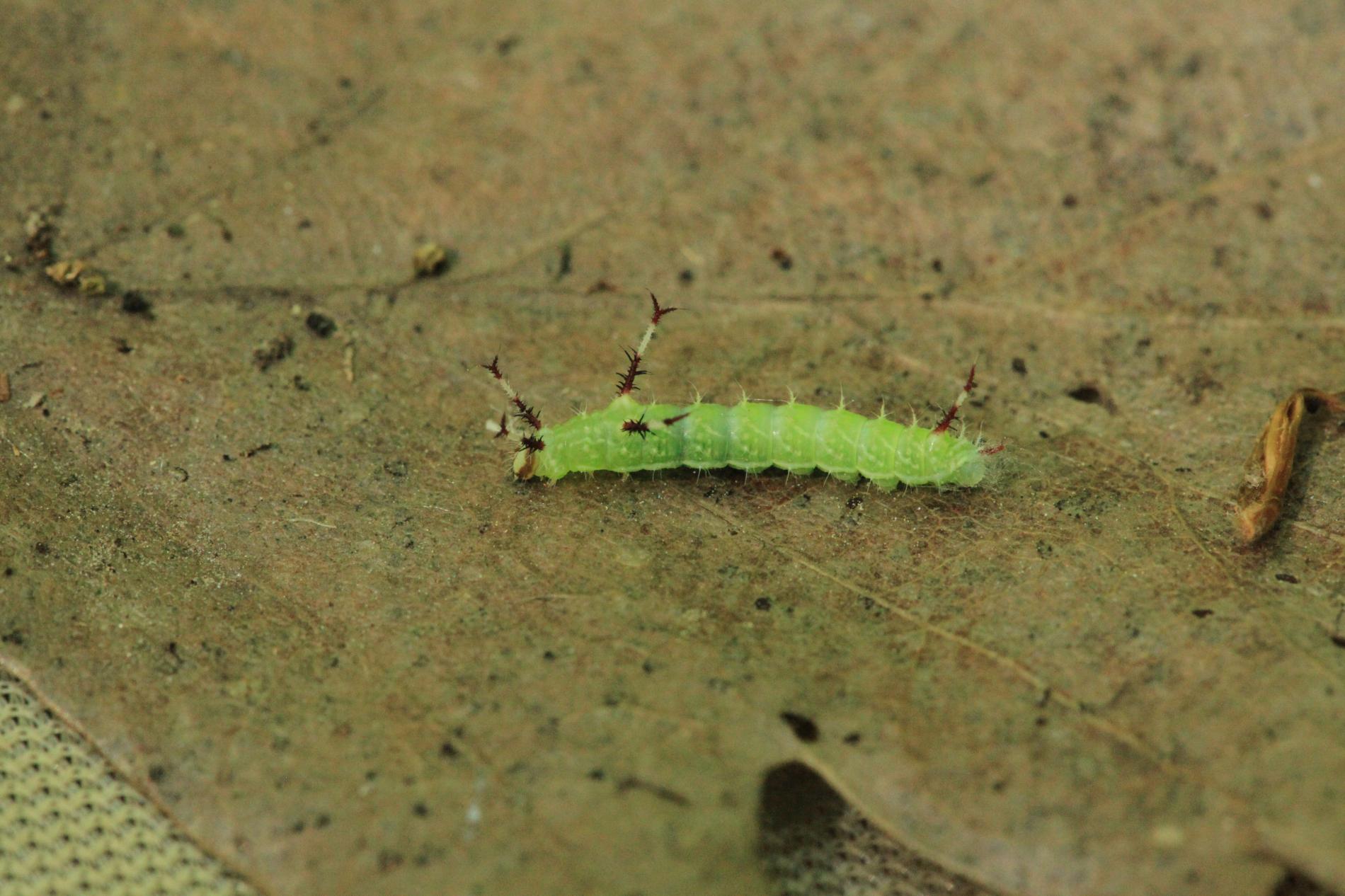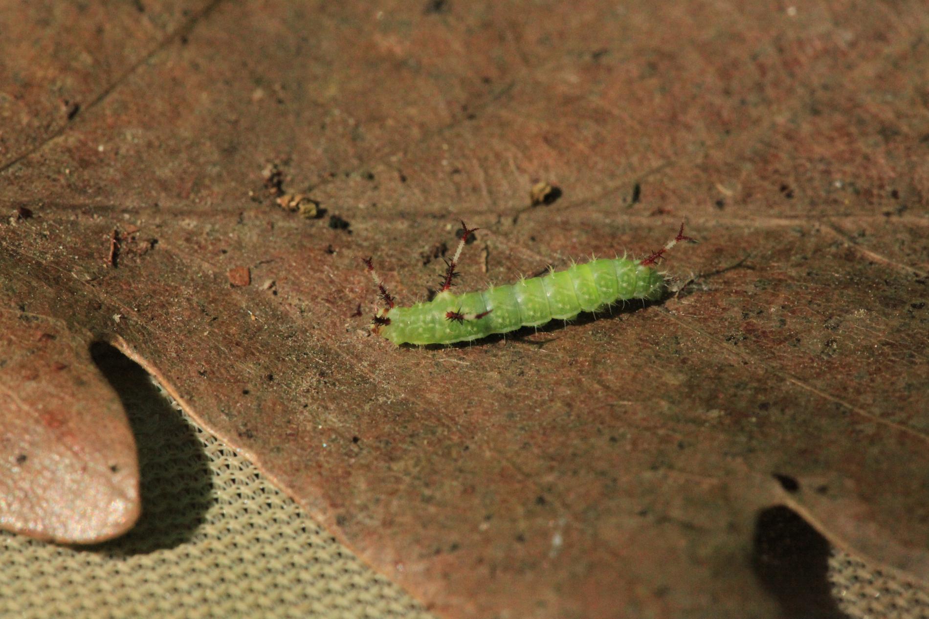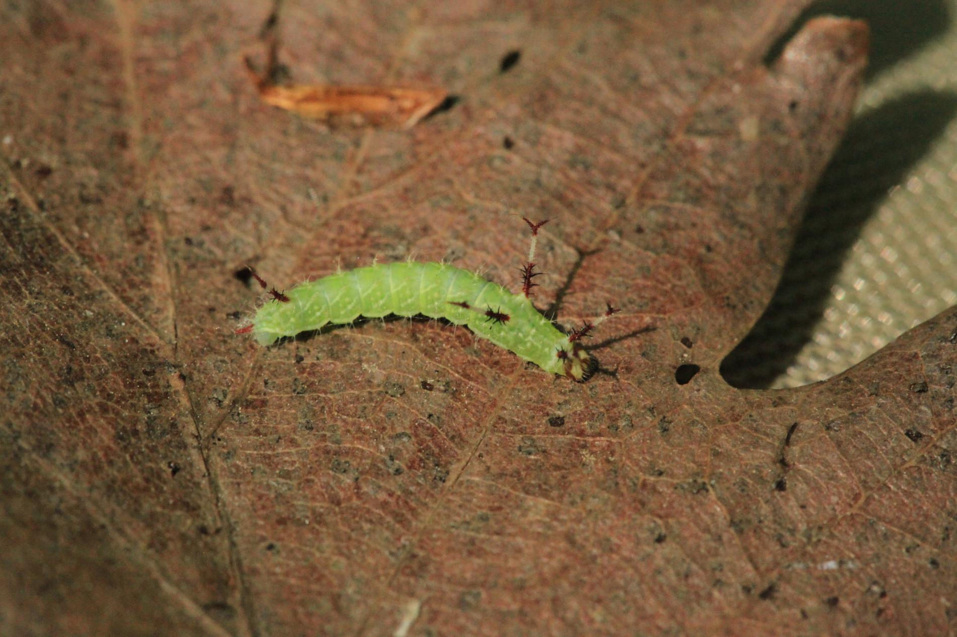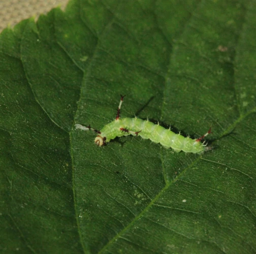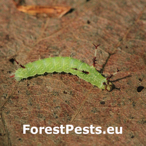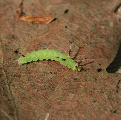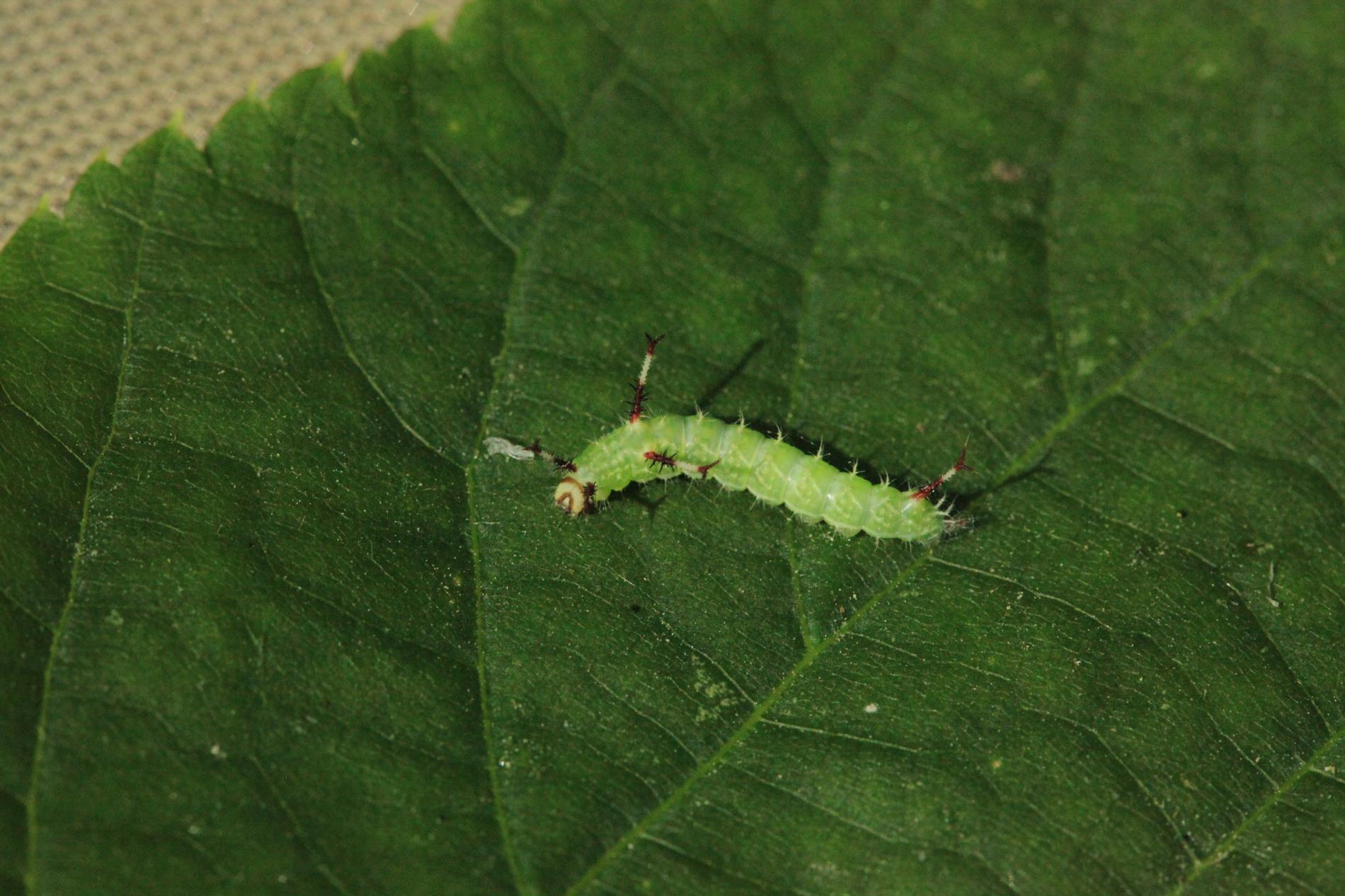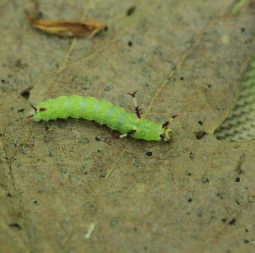 Zelená húsenica s bizarnými výrastkami na liste. Staršie húsenice výrastky nemajú.