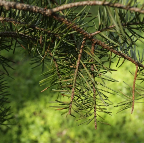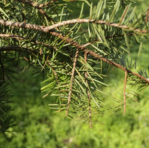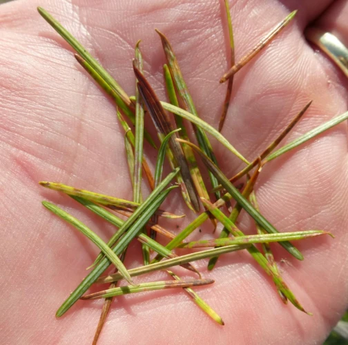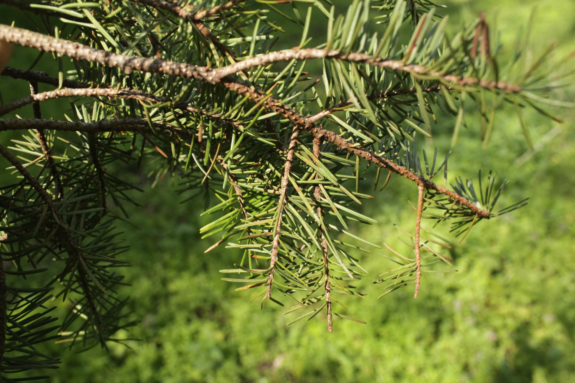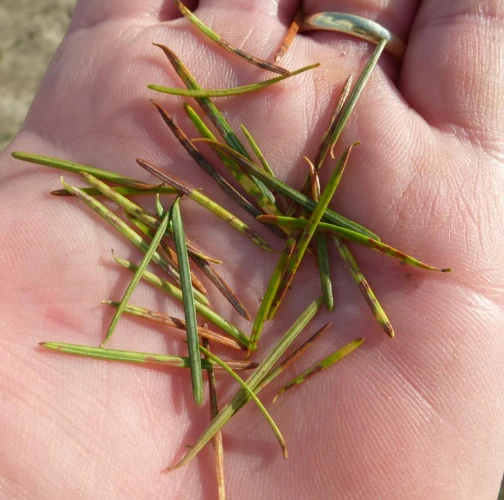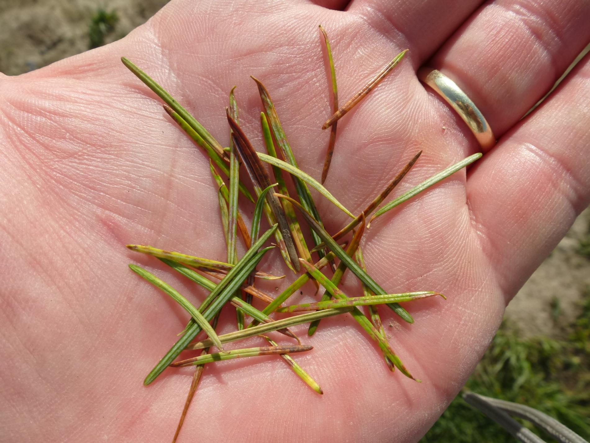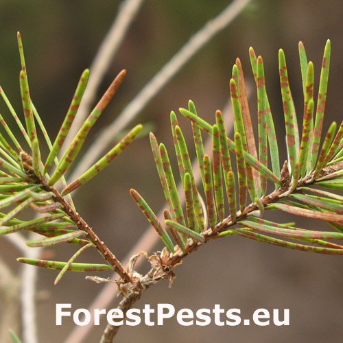 Žltnutie až červenanie najmladších ročníkov ihličia už od konca septembra do jarných mesaiacov nasledujúceho roka.