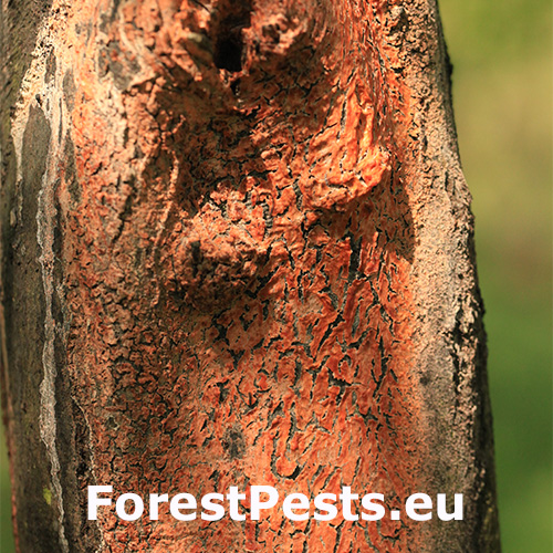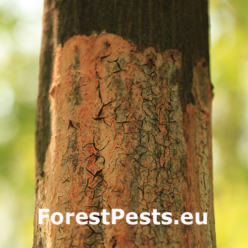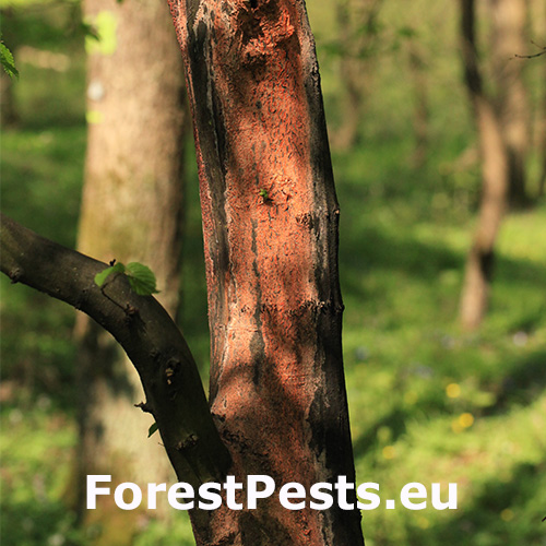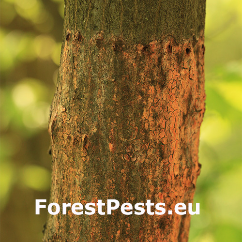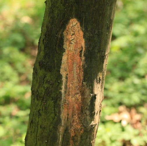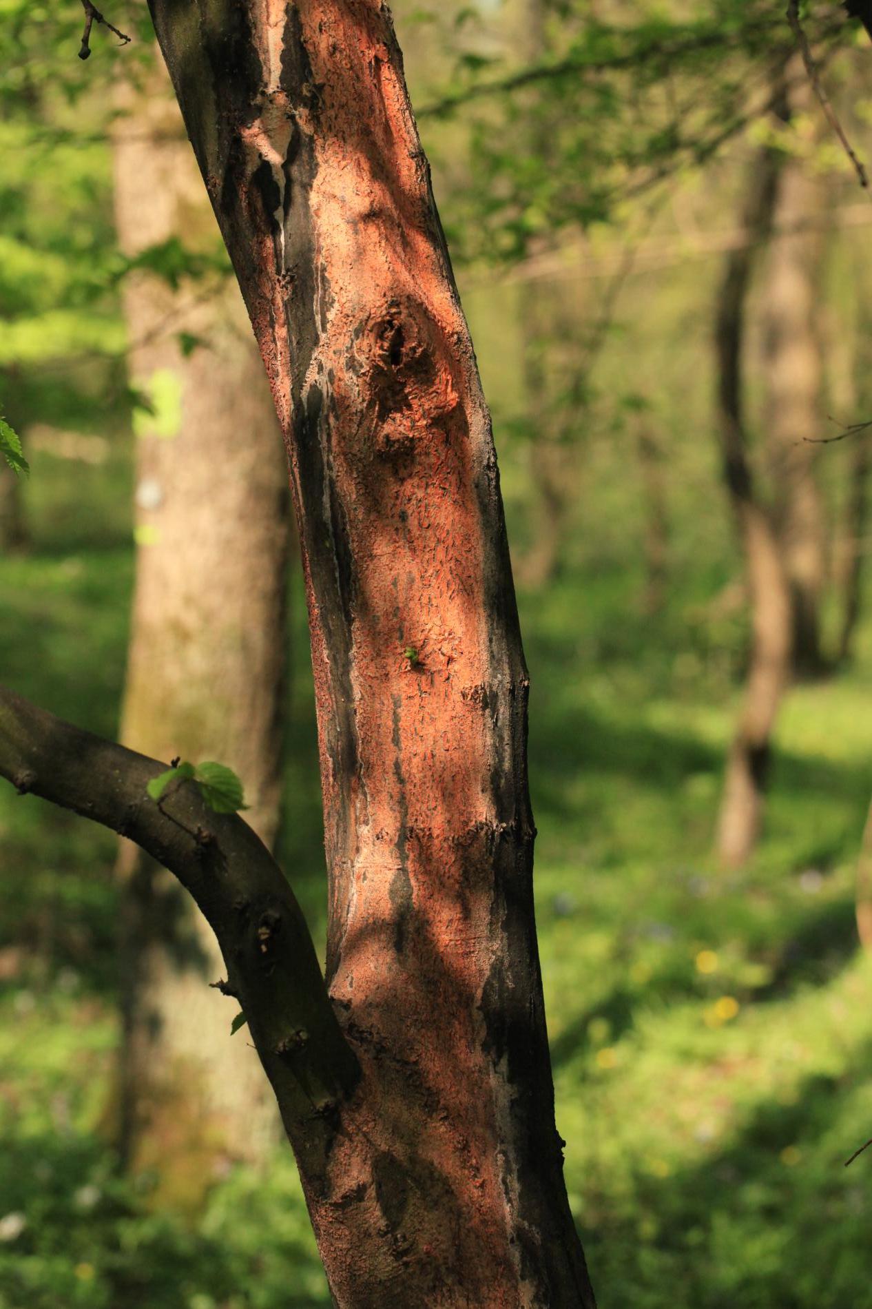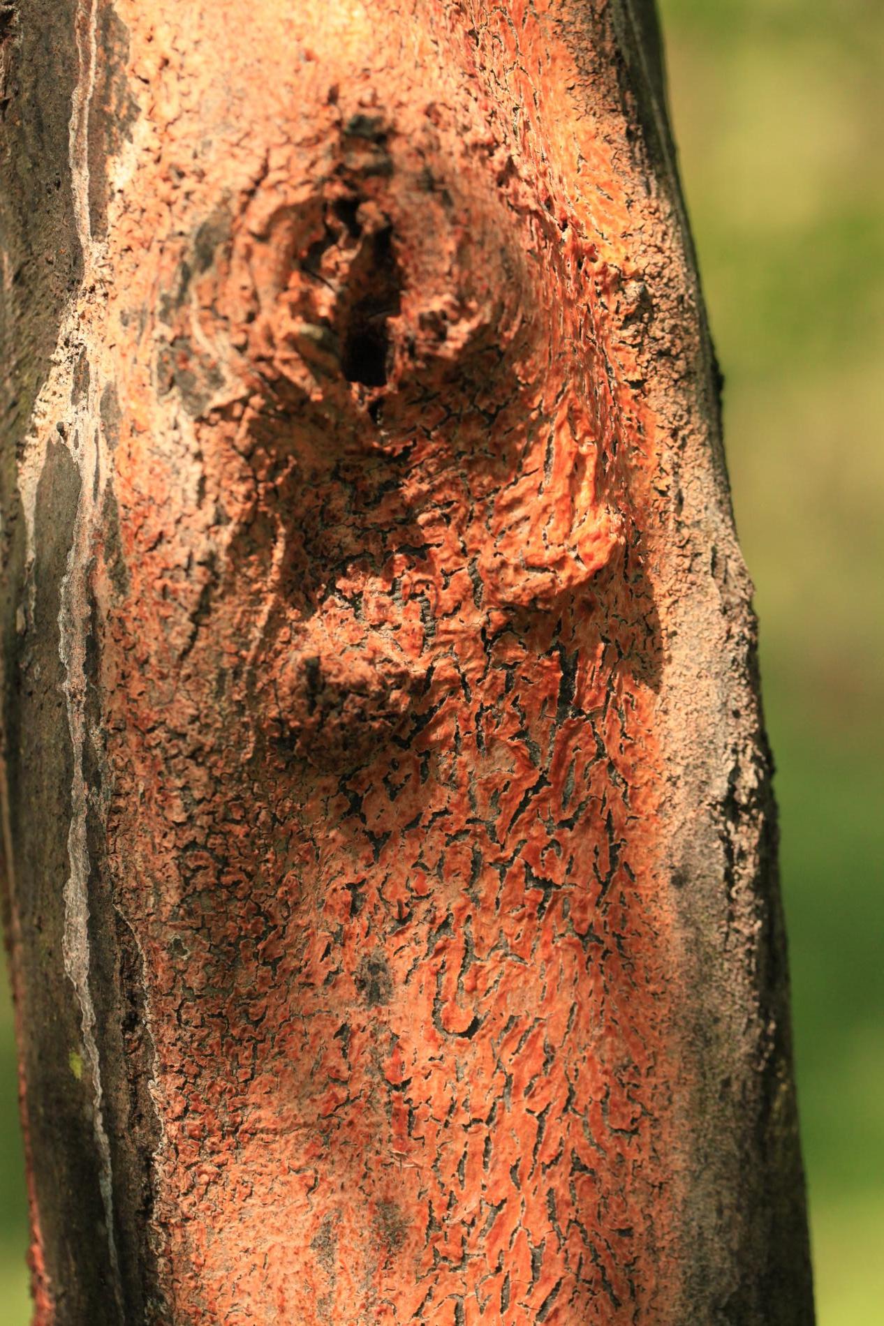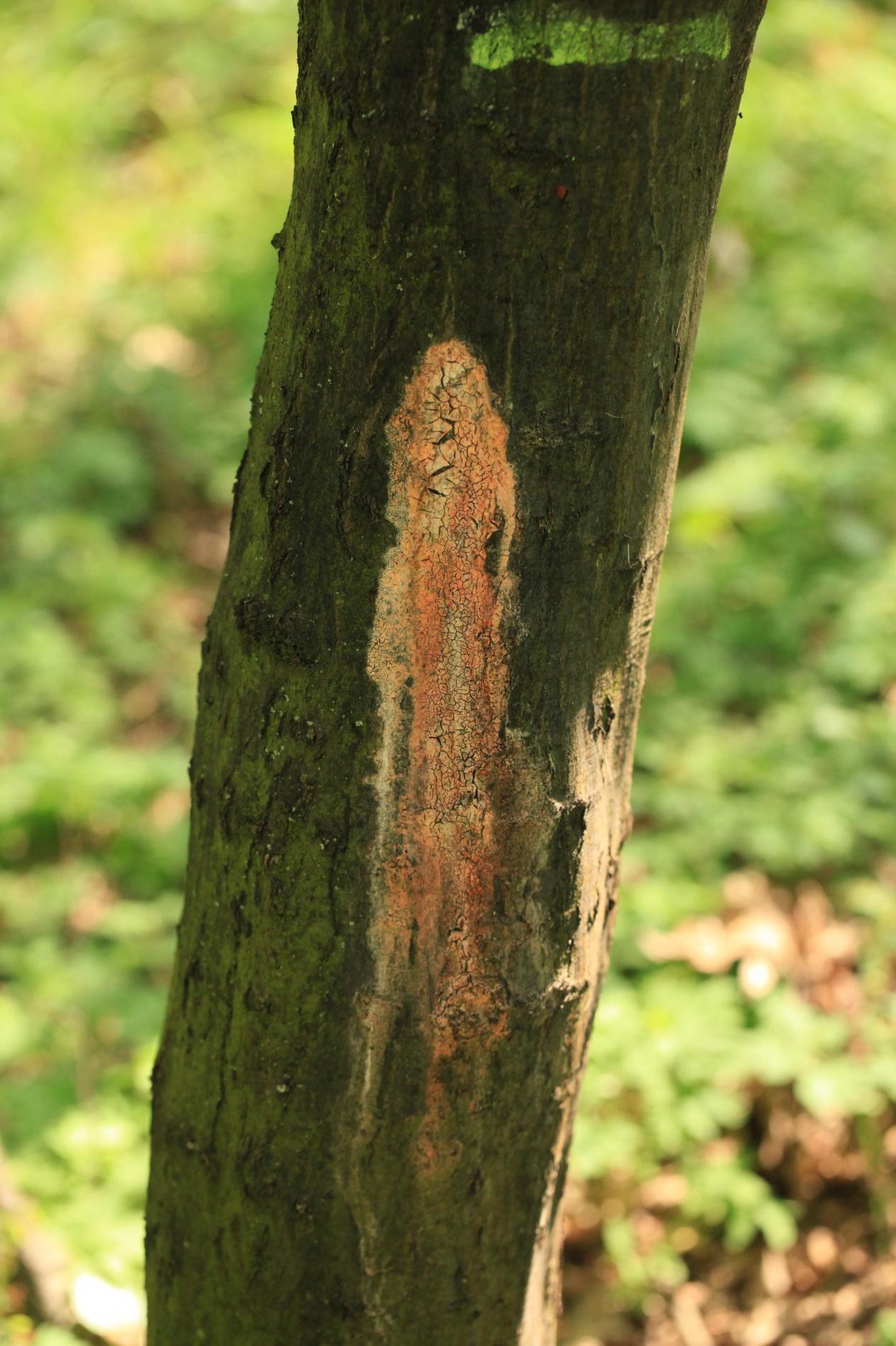 Oranžovo sfarbená kôra niektorých stromov, veľmi častý je tento jav napríklad na kmeni hrabov, je spôsobená baktériami z rodu Cryptococcus spp. Tieto baktérie napádajú miazgu, ktorú ronia stromy po poradení rôzneho typu. Miazgu ronia stromy najmä v jarných mesiacoch, keď začínajú pučať. Miazga obsahuje množstvo látok, cukrov a pod., ktoré kvasia a menia sa za pomoci uvedených baktérií často na oranžový povlak na kmeňoch stromov. Poranenie stromu z ktorého vyteká miazga môže mať rôzne príčiny, pričom na hrabe je časté poškodenie kôry ďatľom tak, ako to vidno na niektorých obrázkoch. Tento jav zanikne hneď ako sa rana, z ktorej vyteká miazga zahojí.