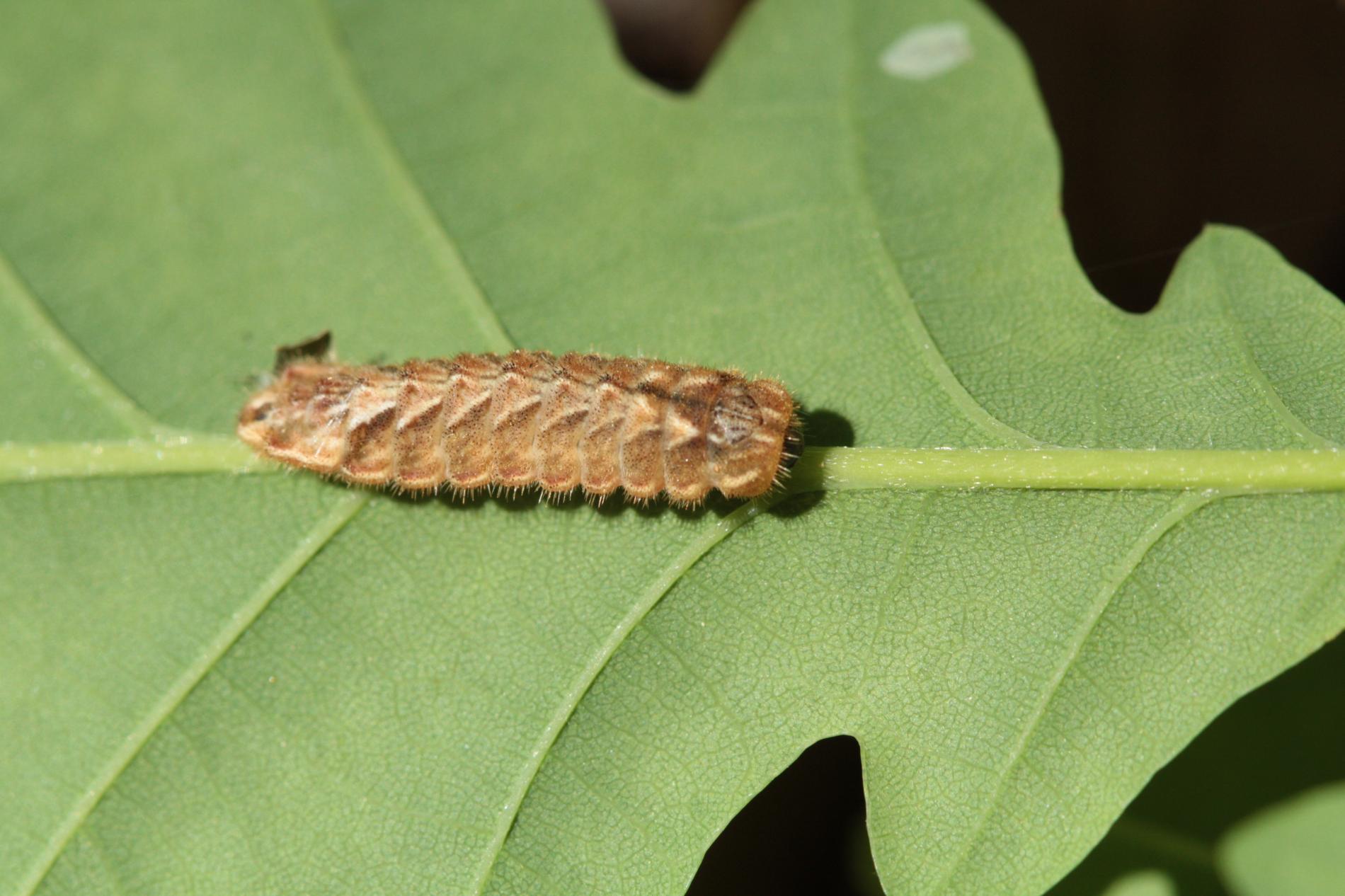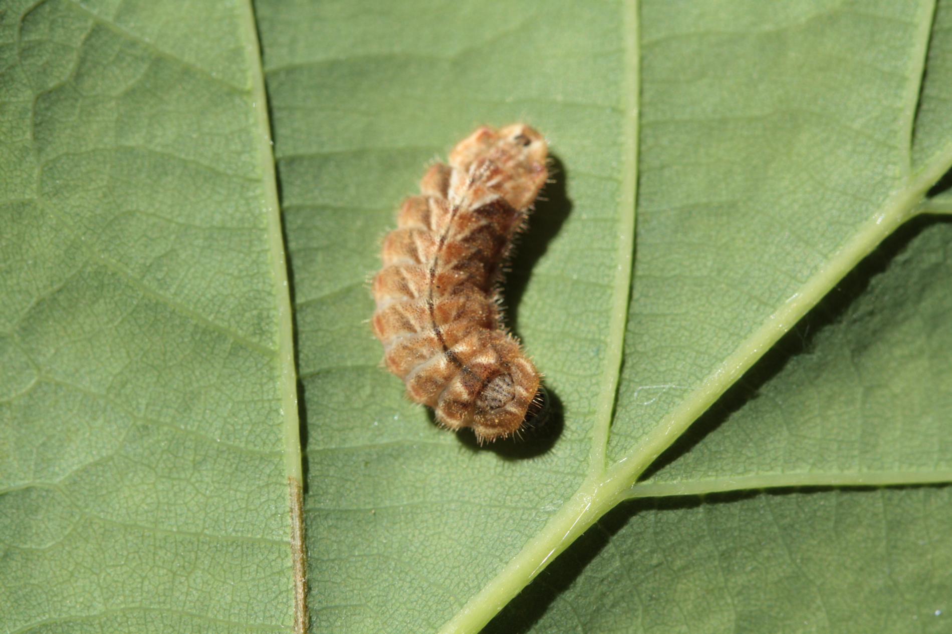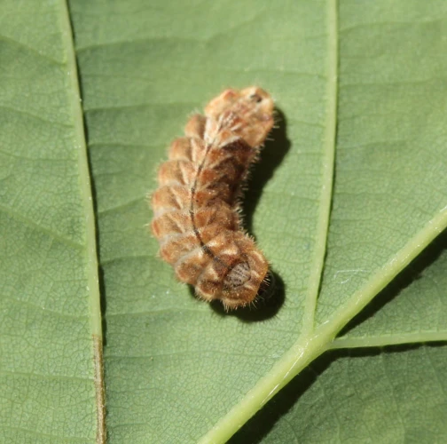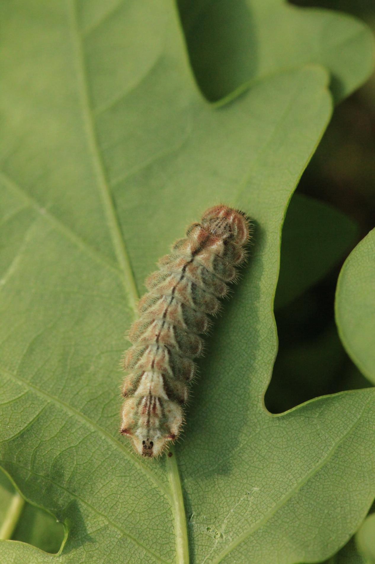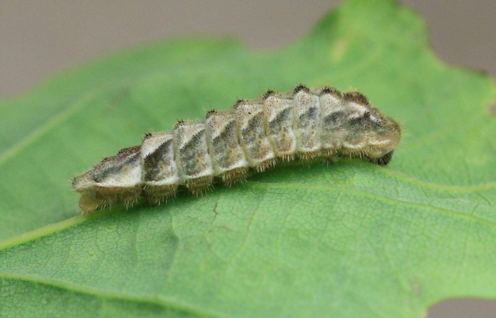 Húsenica má veľmi netypický tvar. Je oválna a podobá sa skôr na malého slimáka bez ulity ako na húsenicu motýľa. Je husto ochlpená, okrová. Len ťažko rozpoznať jej prednú a zadnú časť tela. Pohybuje sa veľmi pomaly.