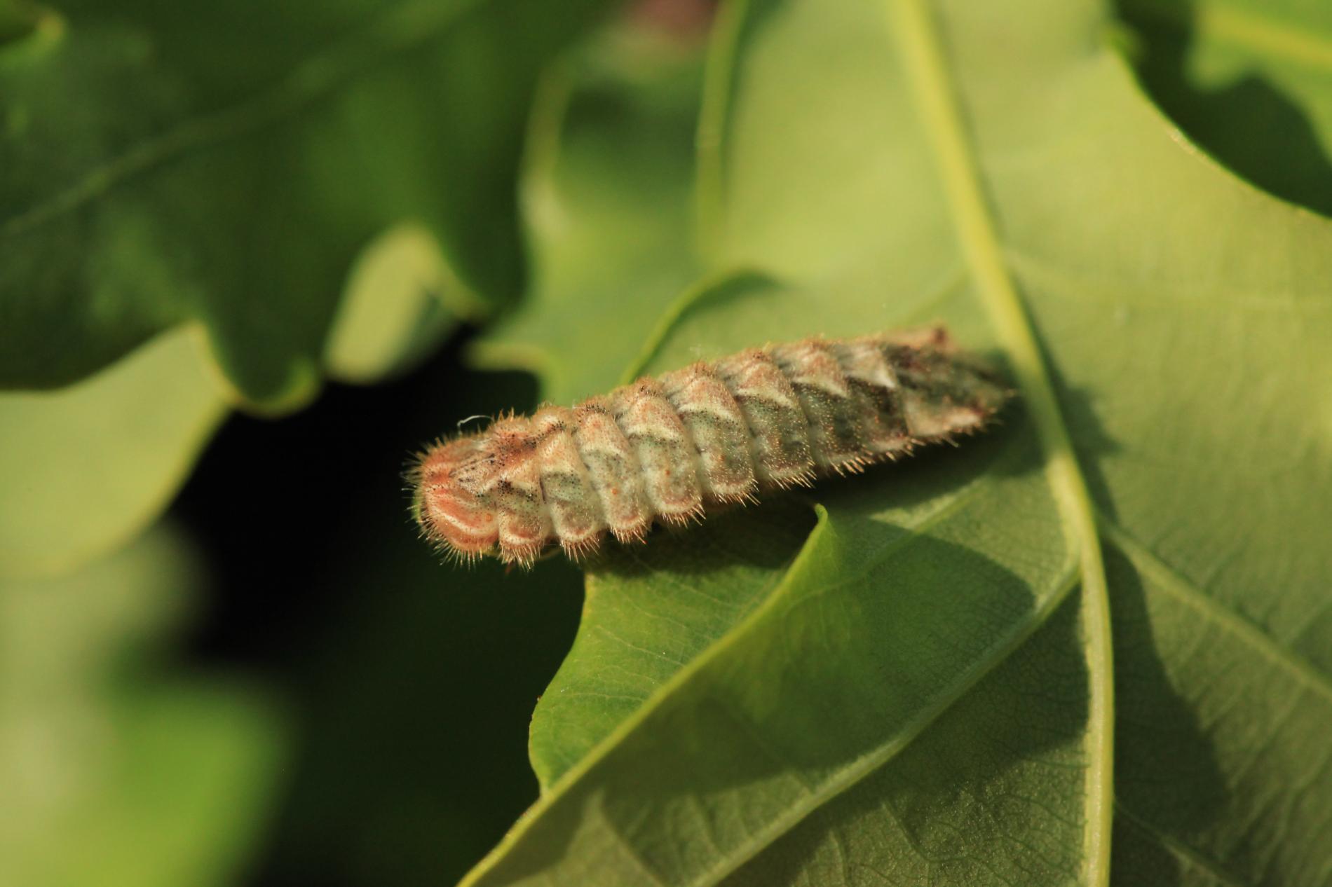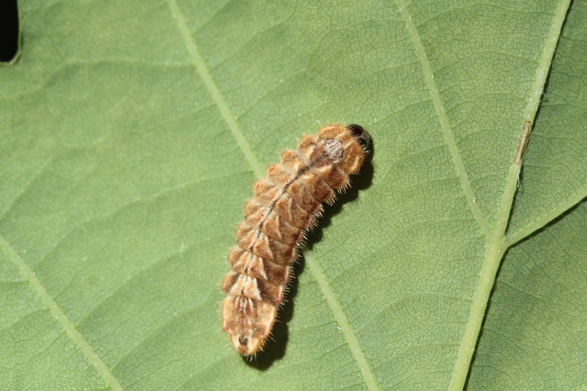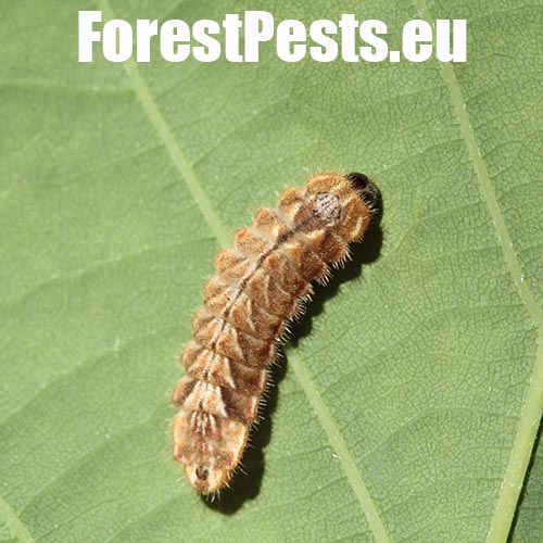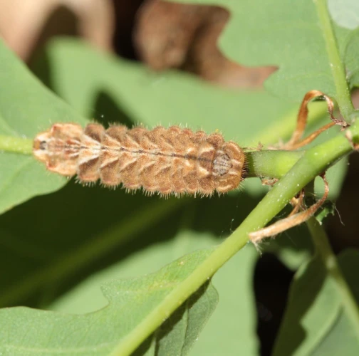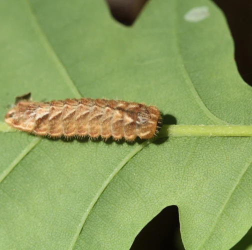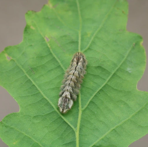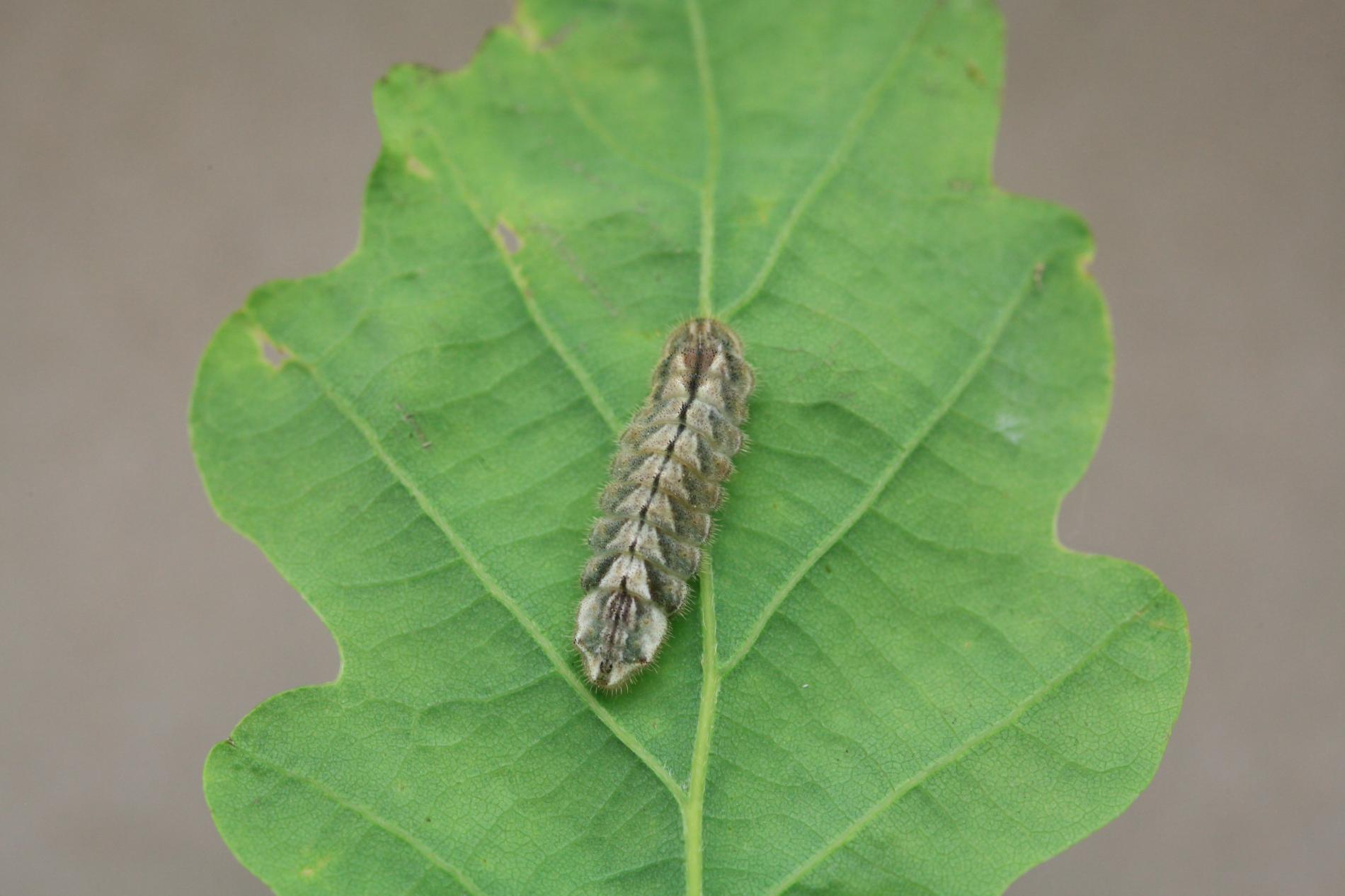 Húsenica má veľmi netypický tvar. Je oválna a podobá sa skôr na malého slimáka bez ulity ako na húsenicu motýľa. Je husto ochlpená, okrová. Len ťažko rozpoznať jej prednú a zadnú časť tela. Pohybuje sa veľmi pomaly.