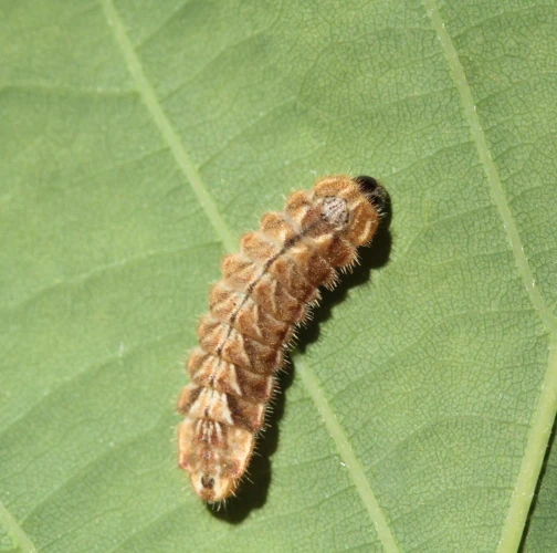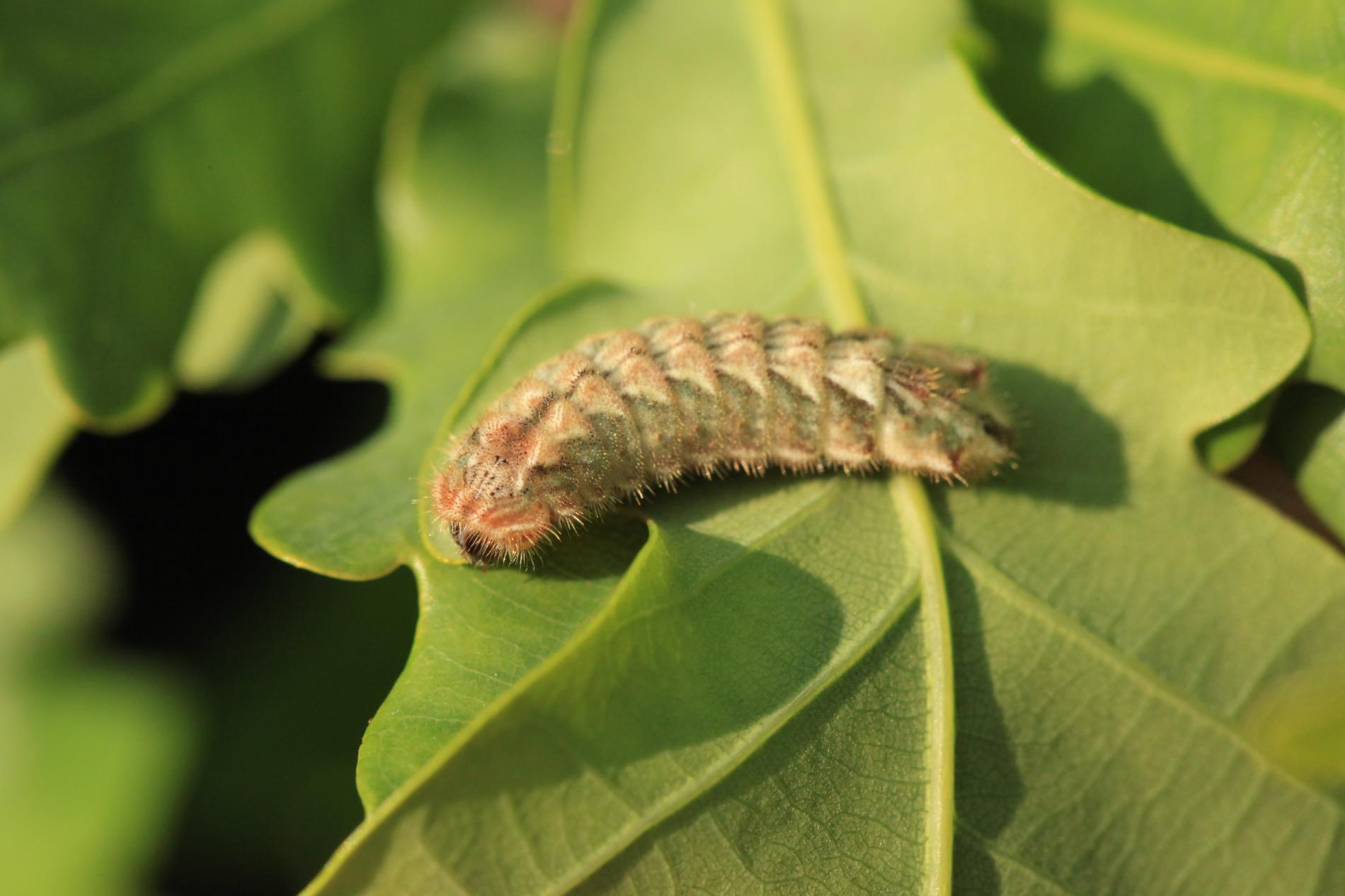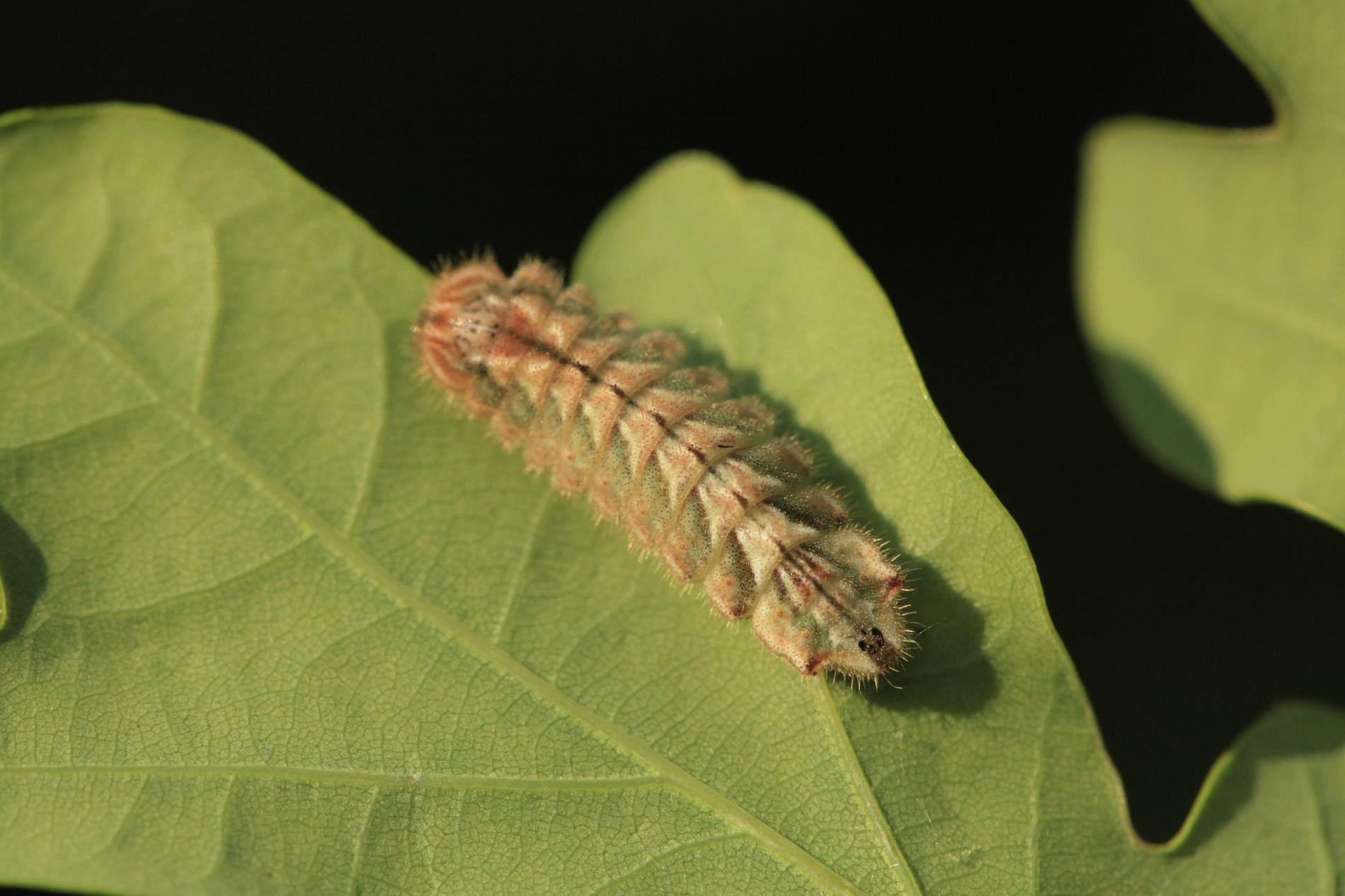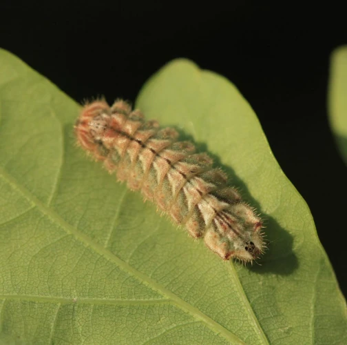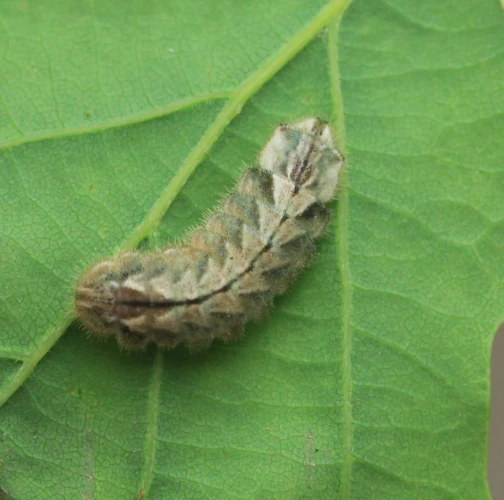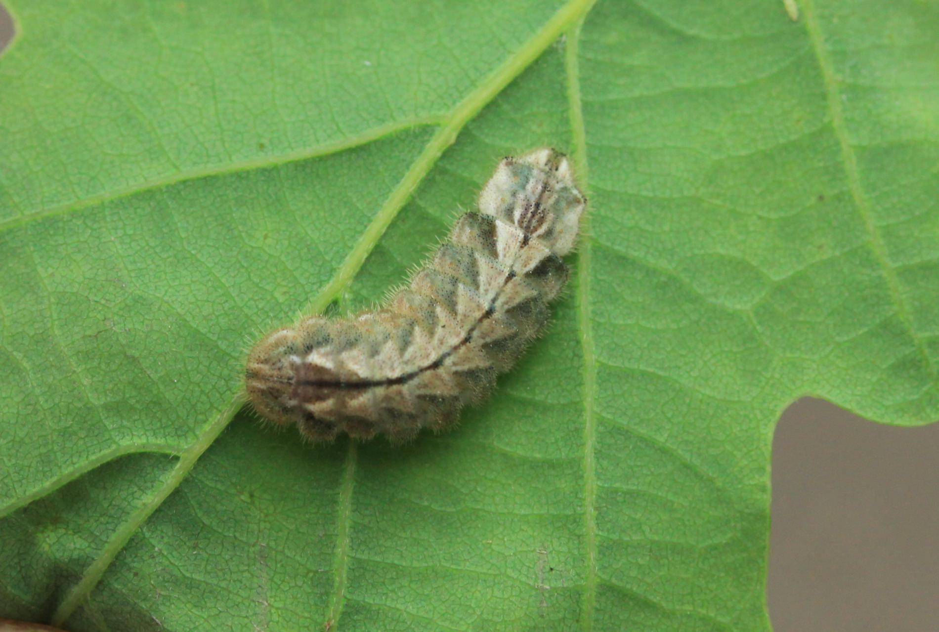 Húsenica má veľmi netypický tvar. Je oválna a podobá sa skôr na malého slimáka bez ulity ako na húsenicu motýľa. Je husto ochlpená, okrová. Len ťažko rozpoznať jej prednú a zadnú časť tela. Pohybuje sa veľmi pomaly.