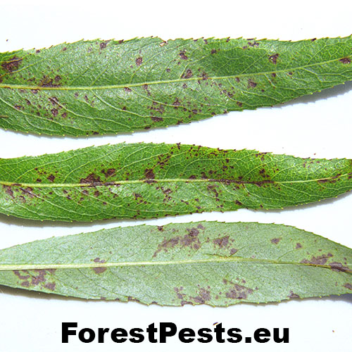 Huba spôsobuje drobné nepravidelne čiernohnedé škvrny listov a výhonkov, ako aj rakovinové rany na zelenej kôre konárikov. Infikované listy schnú a predčasne opadávajú. Na týchto škvrnách sa vytvárajú spóry, ktoré na jar za vlhkého počasia infikujú nové listy a výhonky. Huba je známa aj pod menom Marssonina salicicola.