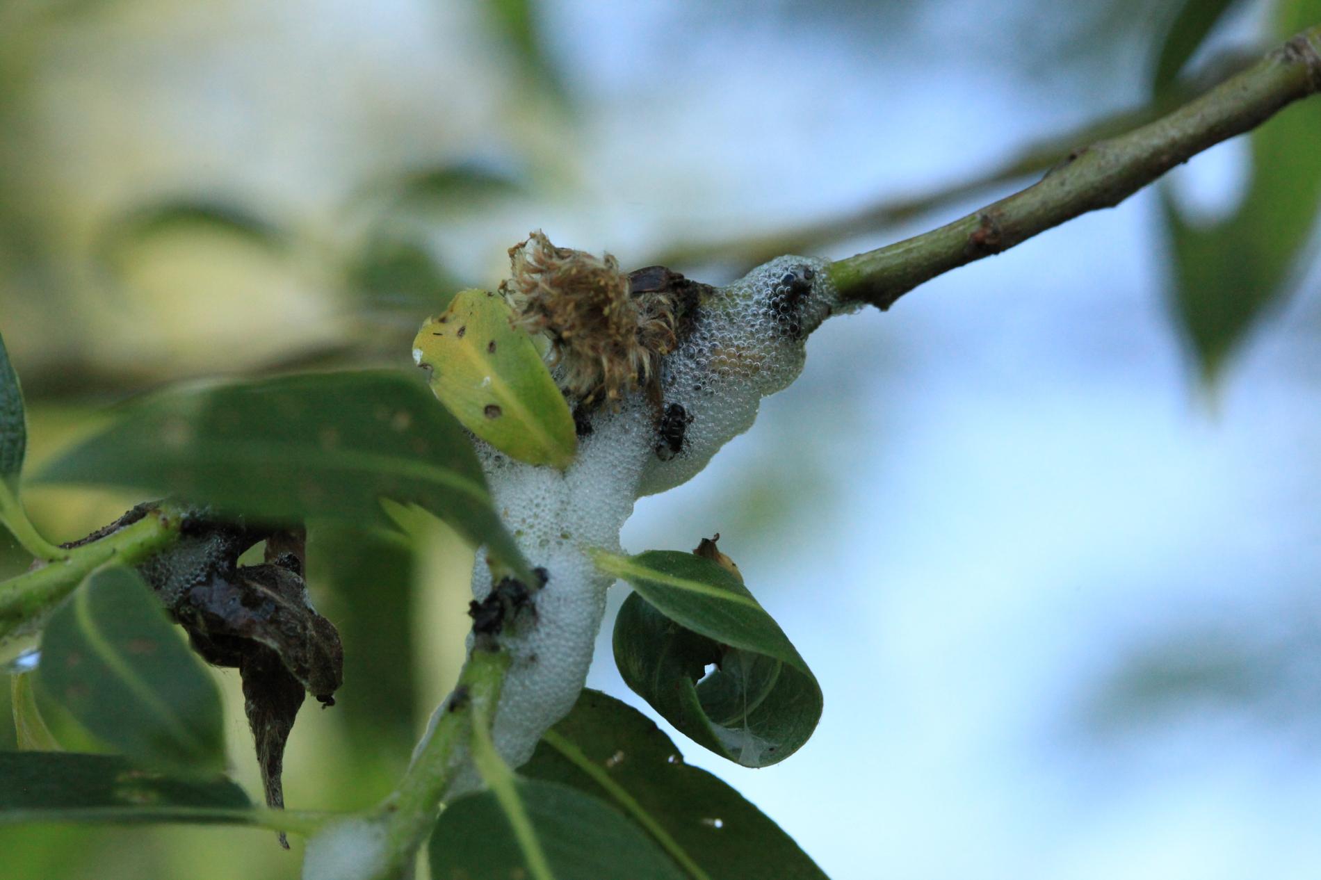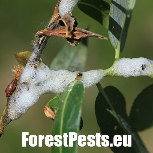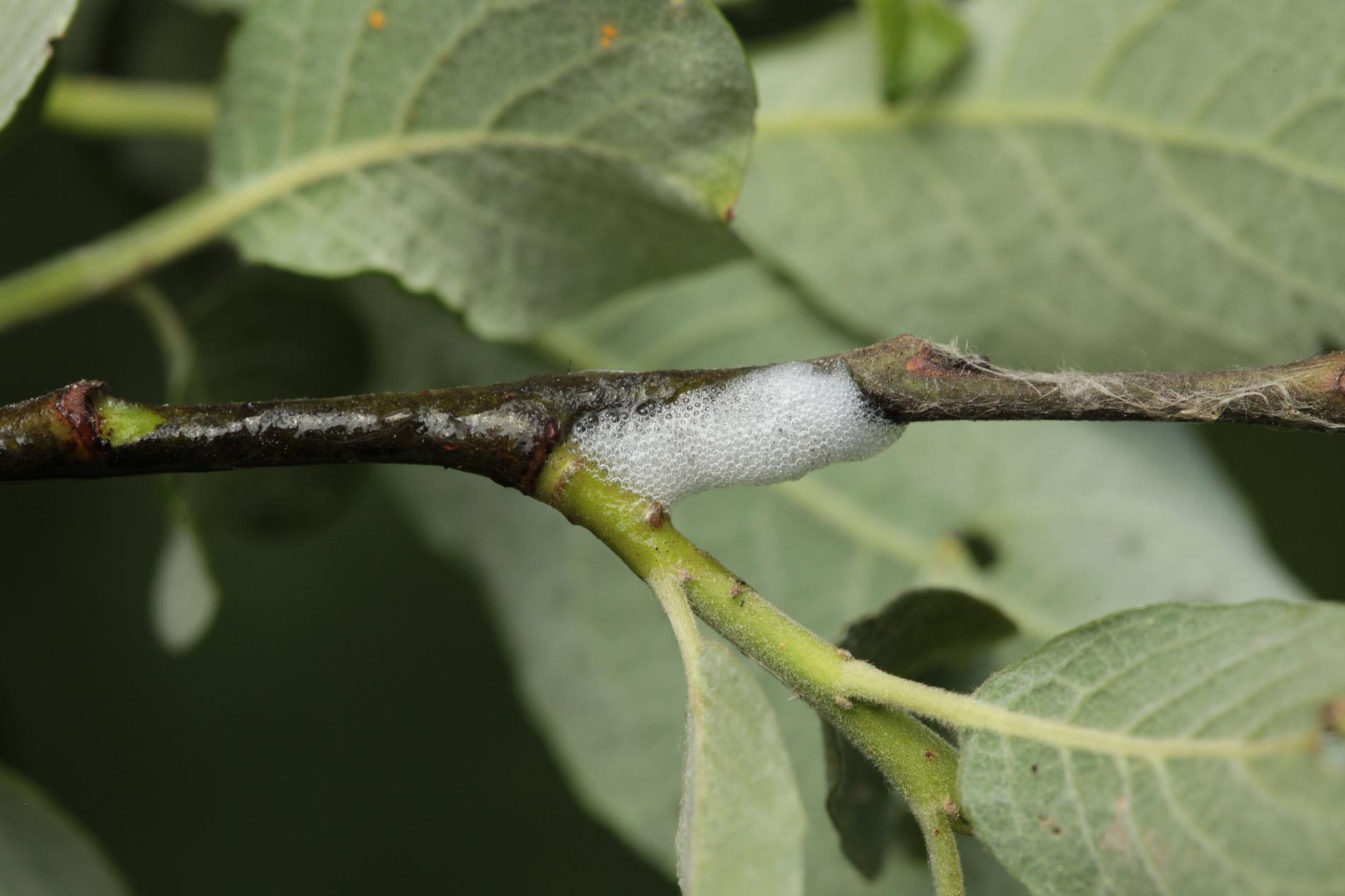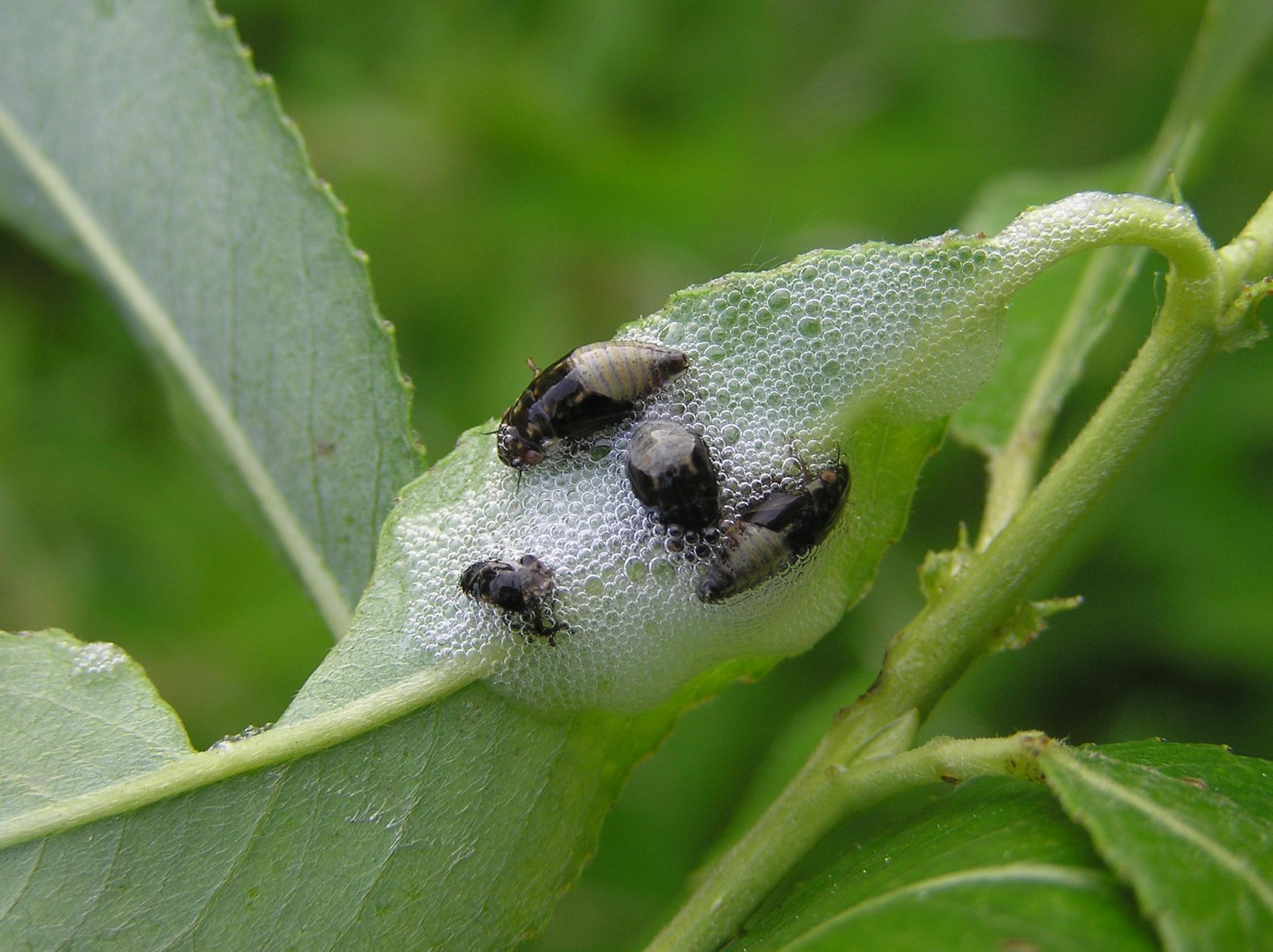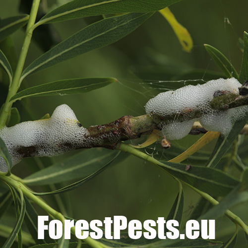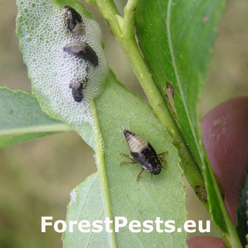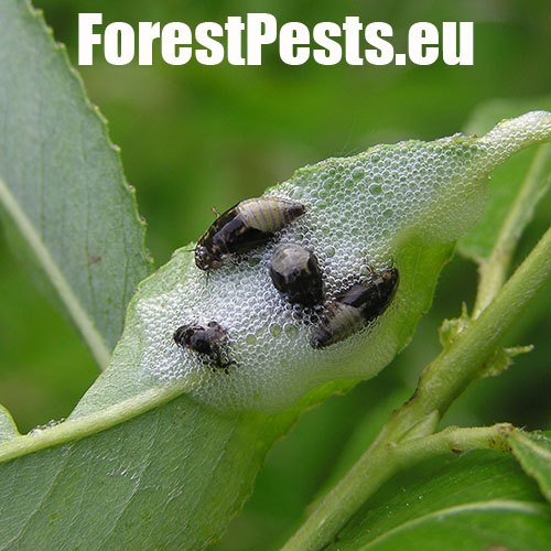 Larvy a imága pod vrstvou peny. V porastoch s výskytom škodcu často padajú drobné kvapky na zem.