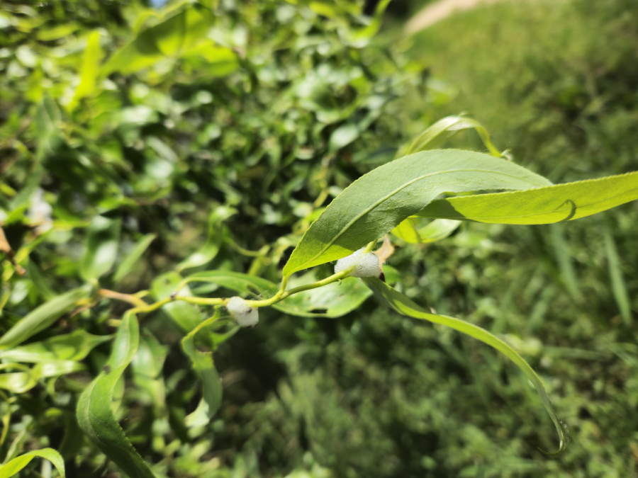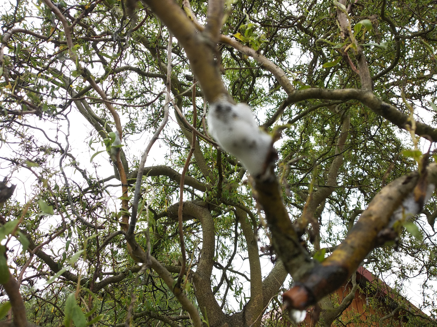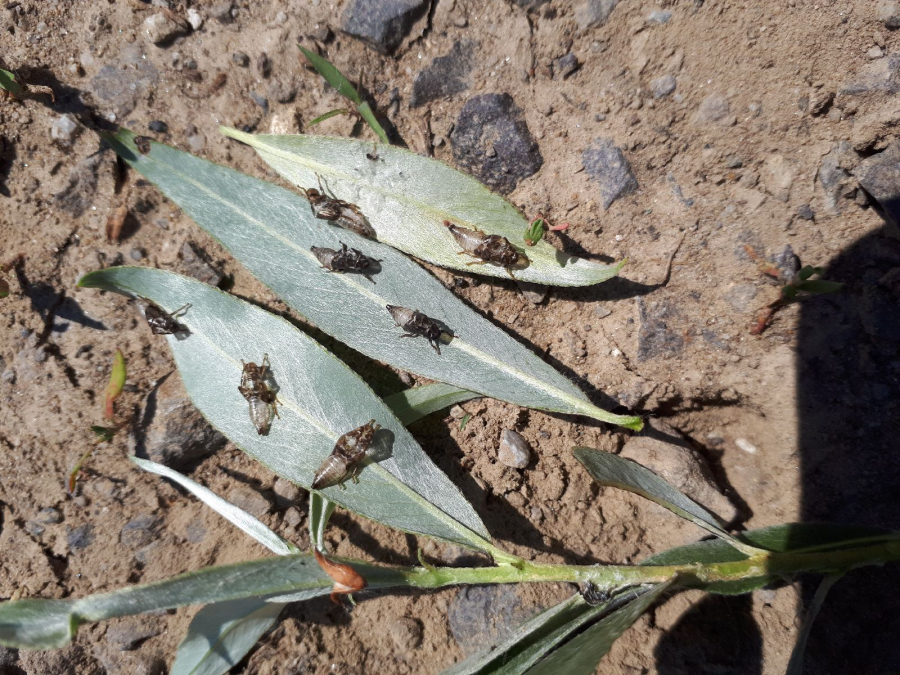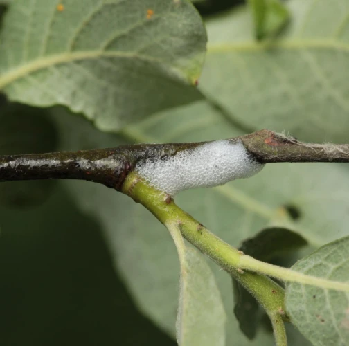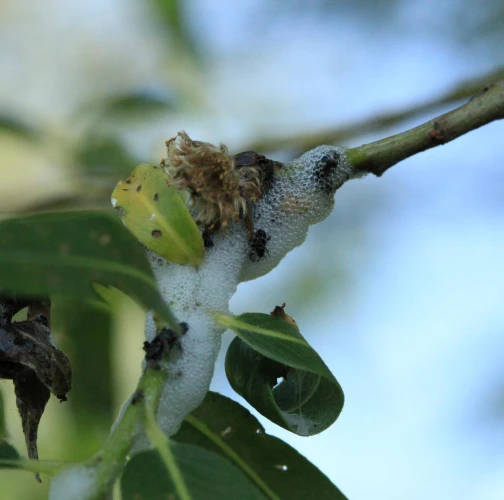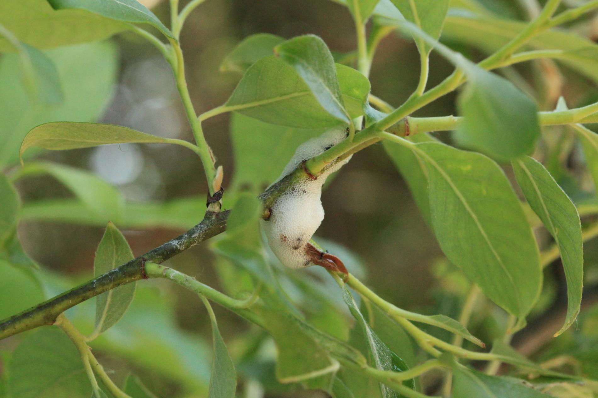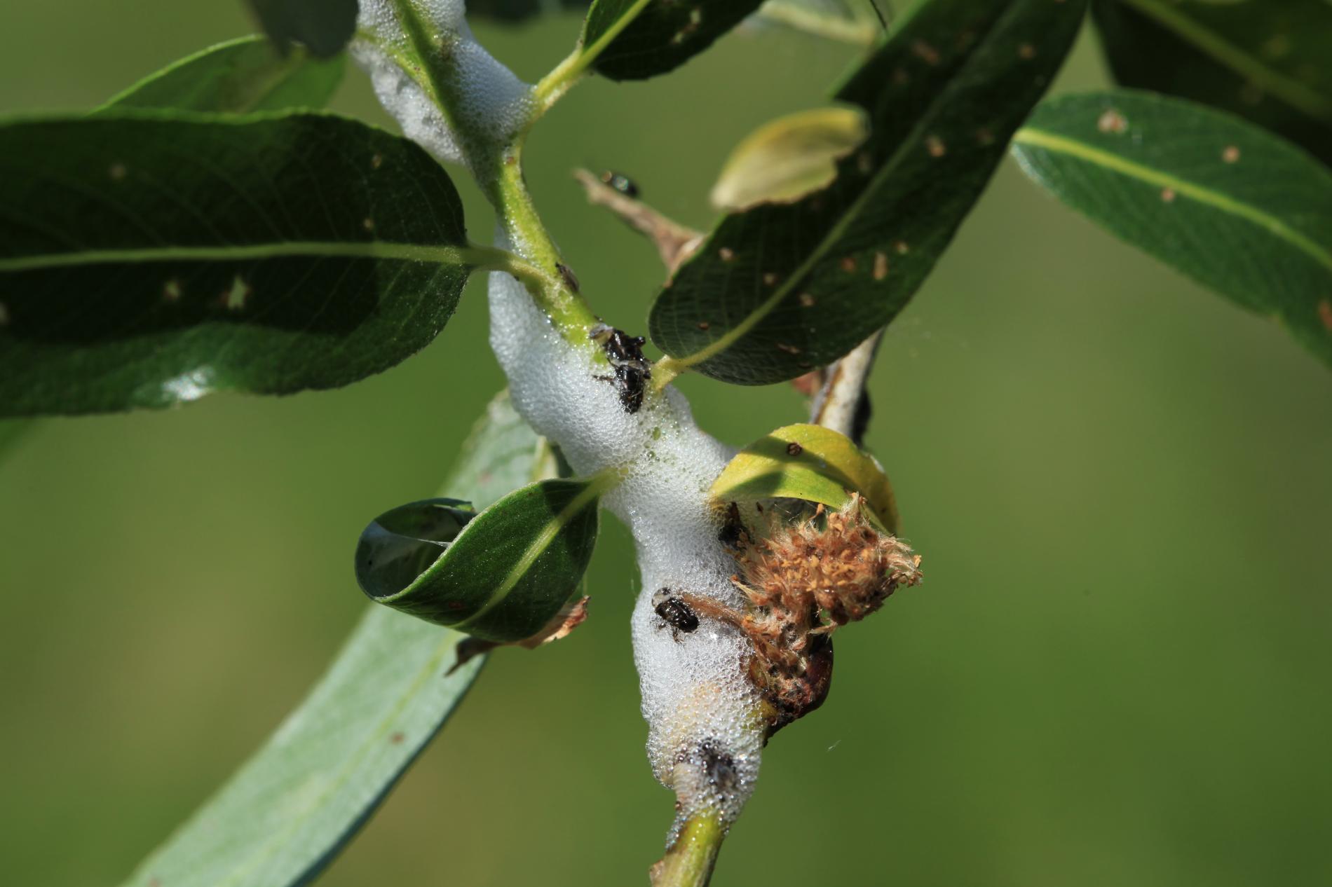 Larvy a imága pod vrstvou peny. V porastoch s výskytom škodcu často padajú drobné kvapky na zem.